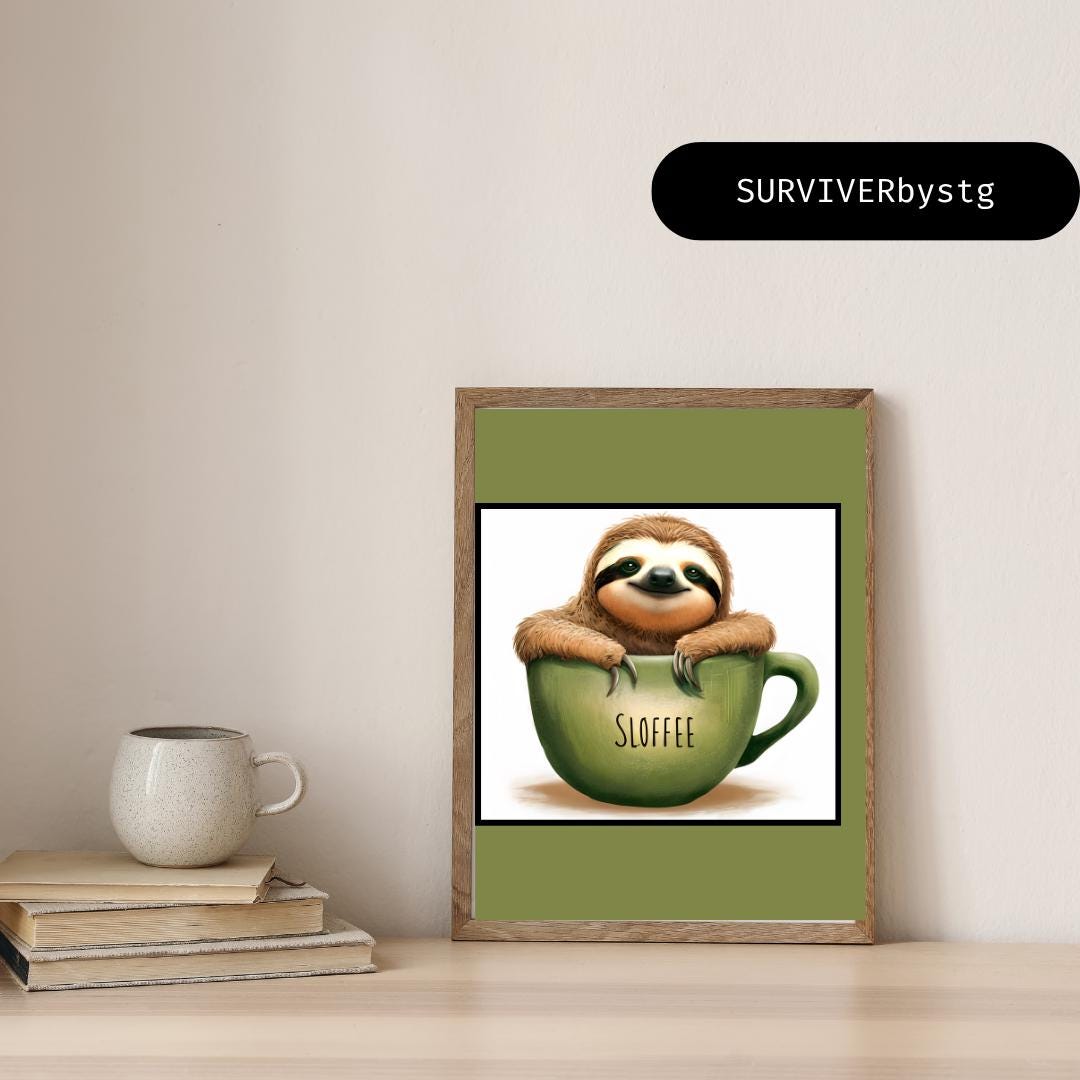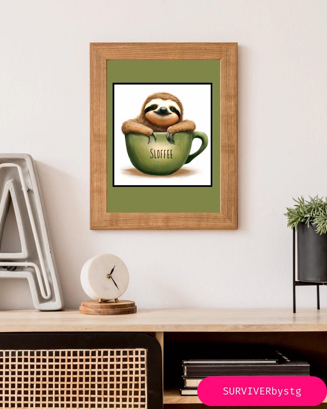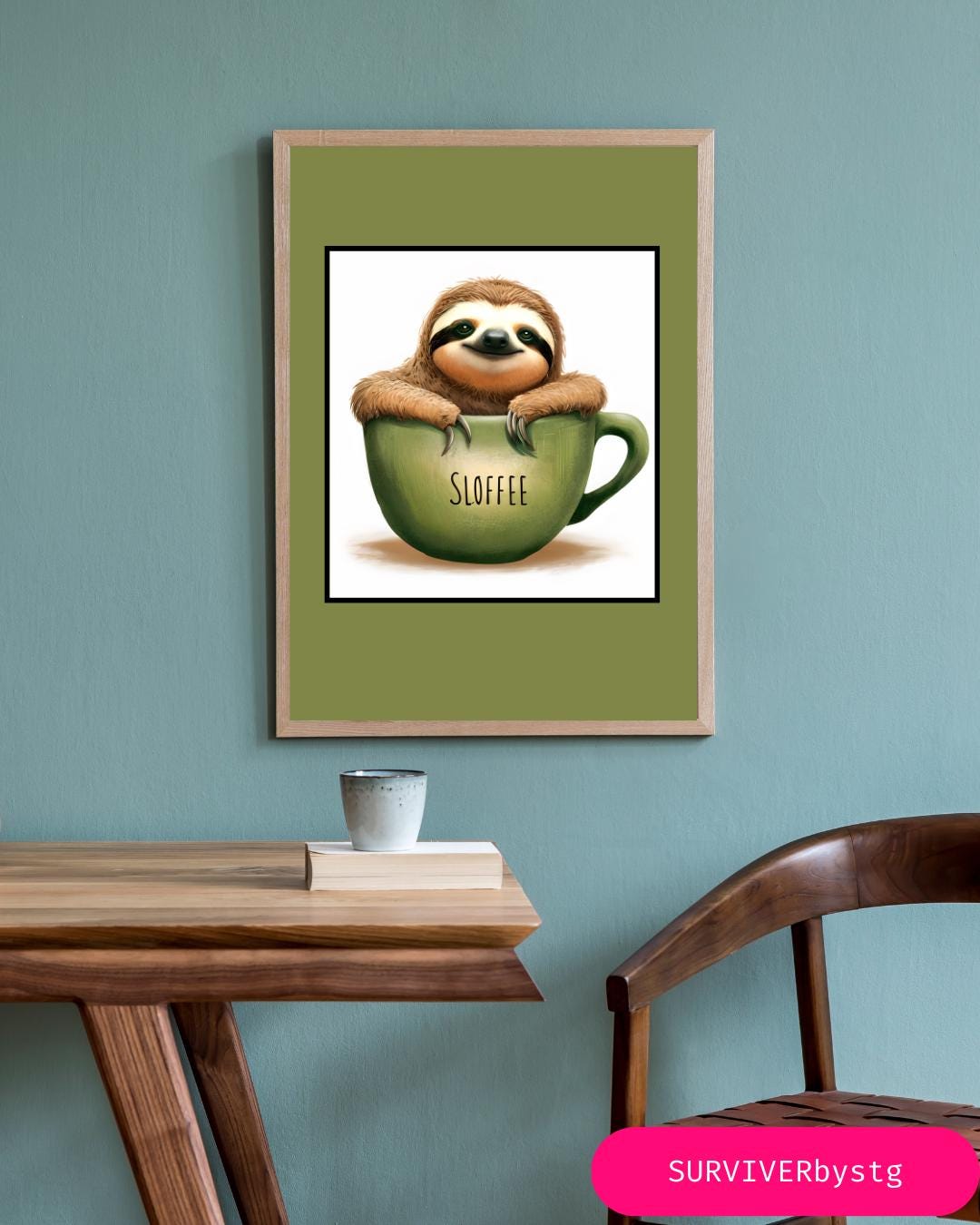 This high-resolution digital download features a smiling sloth lounging in a green coffee mug — a charming, quirky print that adds instant joy to any wall!