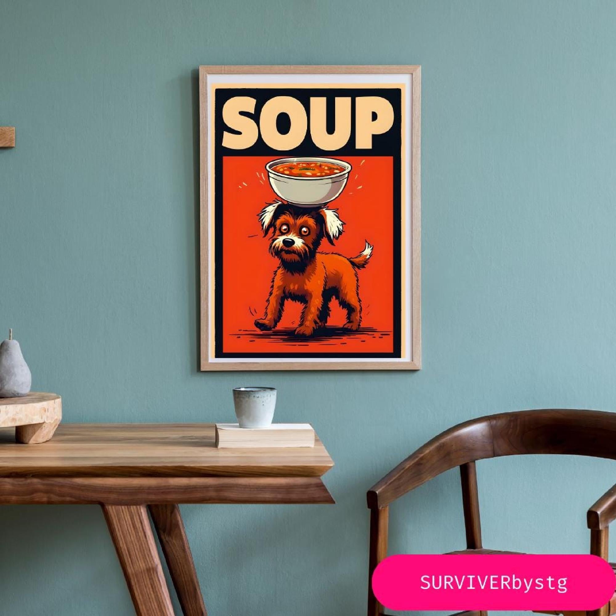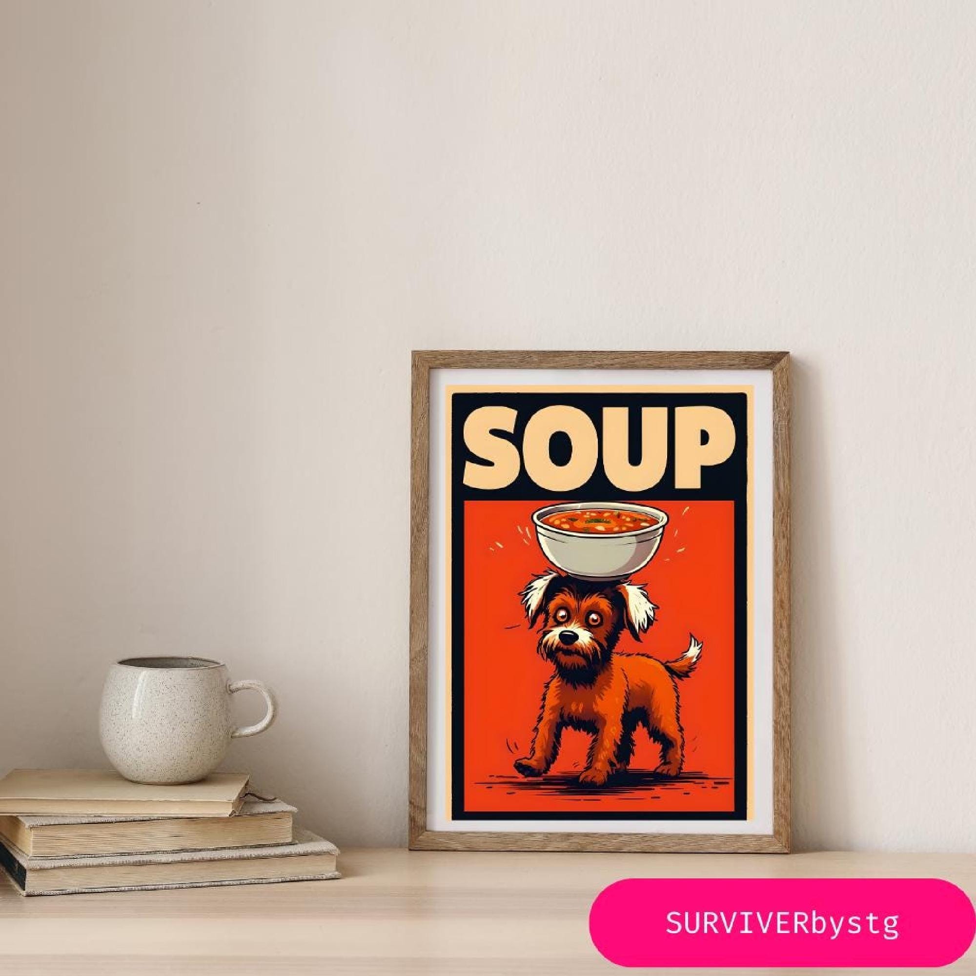 Brighten up your space with this souper dog print, perfect for anyone who loves a mix of quirky wall art and classic retro diner art. This retro dog poster captures a playful pup holding a steaming bowl, giving you a fun take on an iconic soup print. Whether you're looking for funny wall decor or something to boost your digital kitchen art collection, this piece adds a playful vibe to your home.