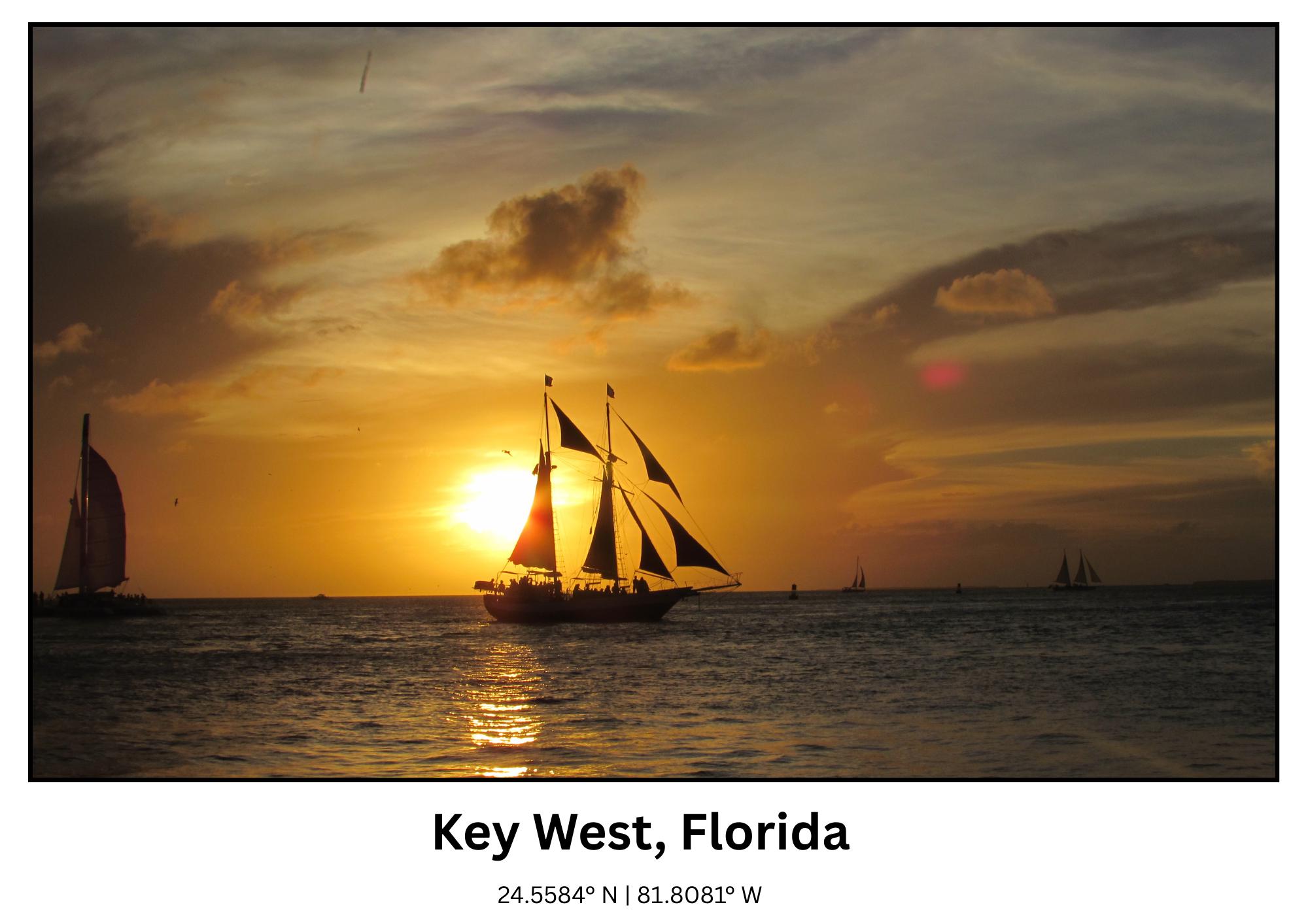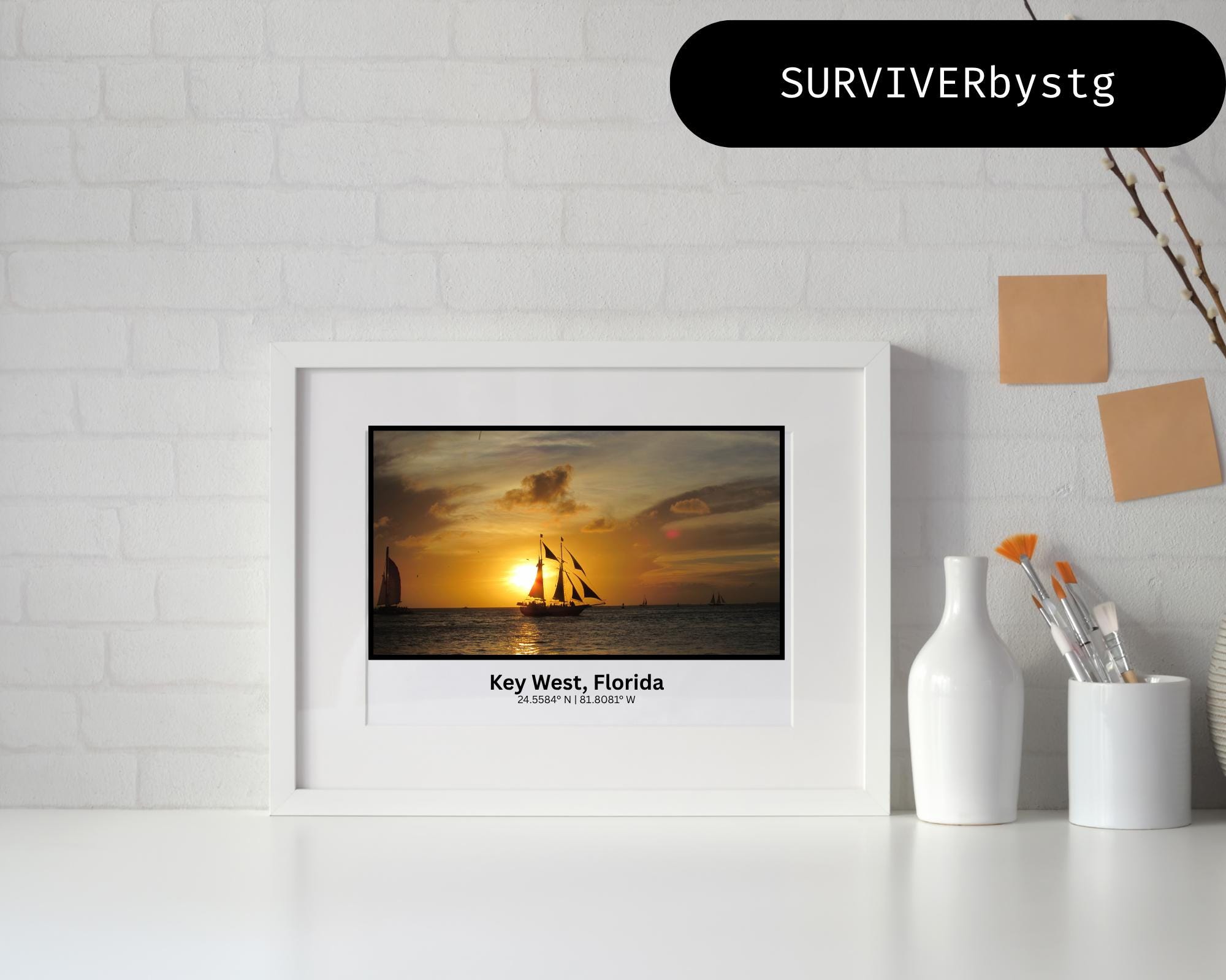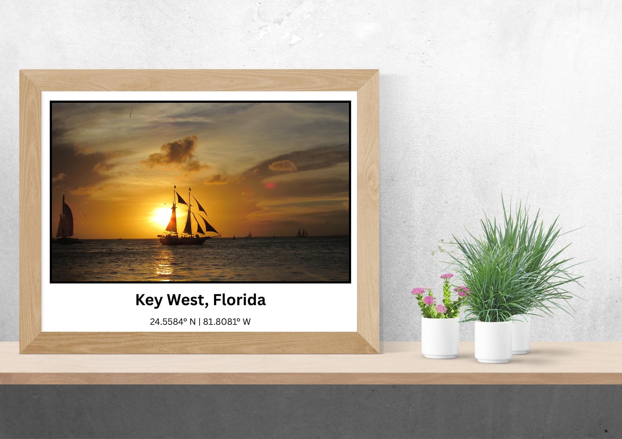 Bring the golden charm of Key West into your home with this stunning A4 digital sunset print! Featuring precise coordinates and a serene sailing scene, it's the perfect touch of tropical tranquility for your walls.