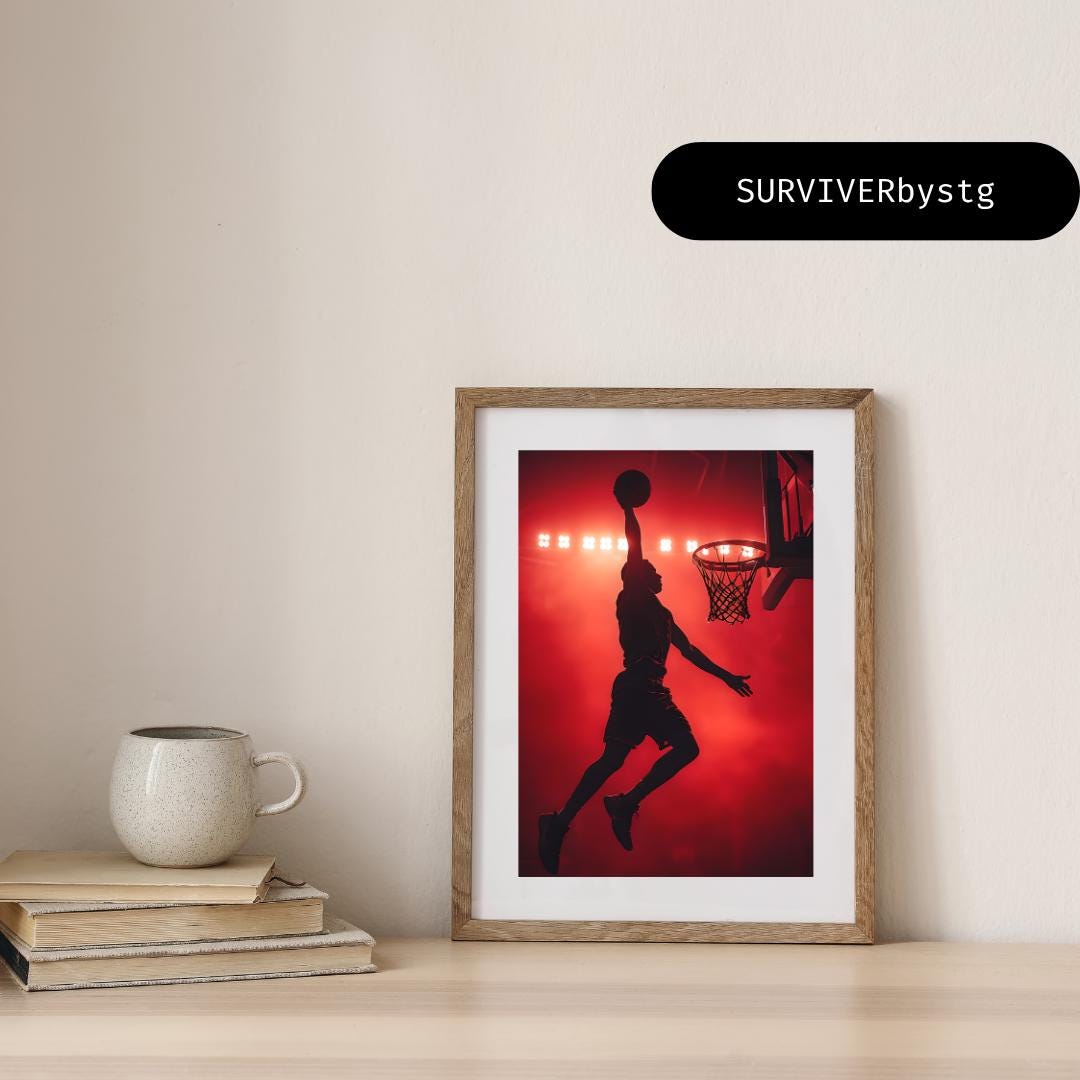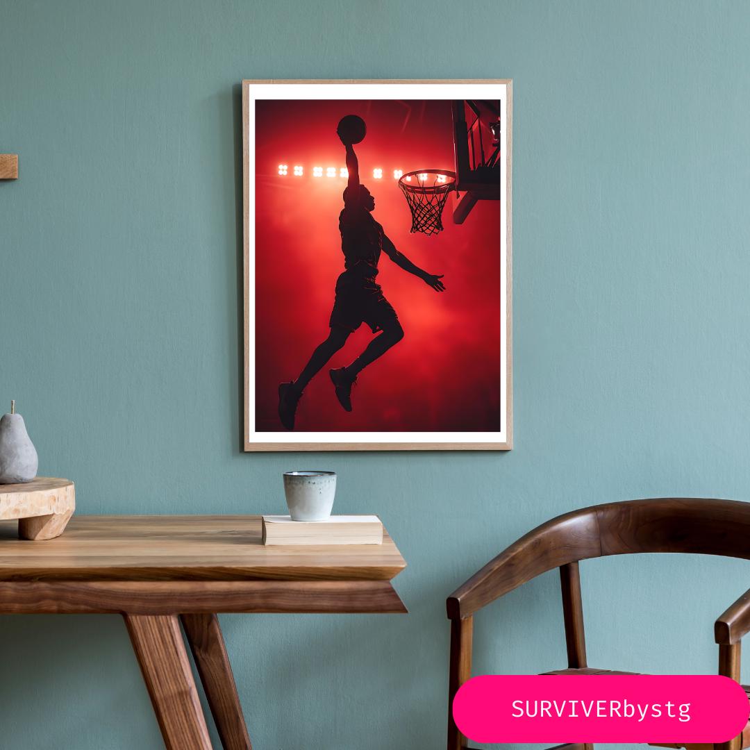 Bring the energy of the game into your space with this Basketball Dunk Print — a dynamic silhouette of a player mid-slam under dramatic arena lights. Perfect for athletes, sports fans, or anyone who loves bold, motivational art!