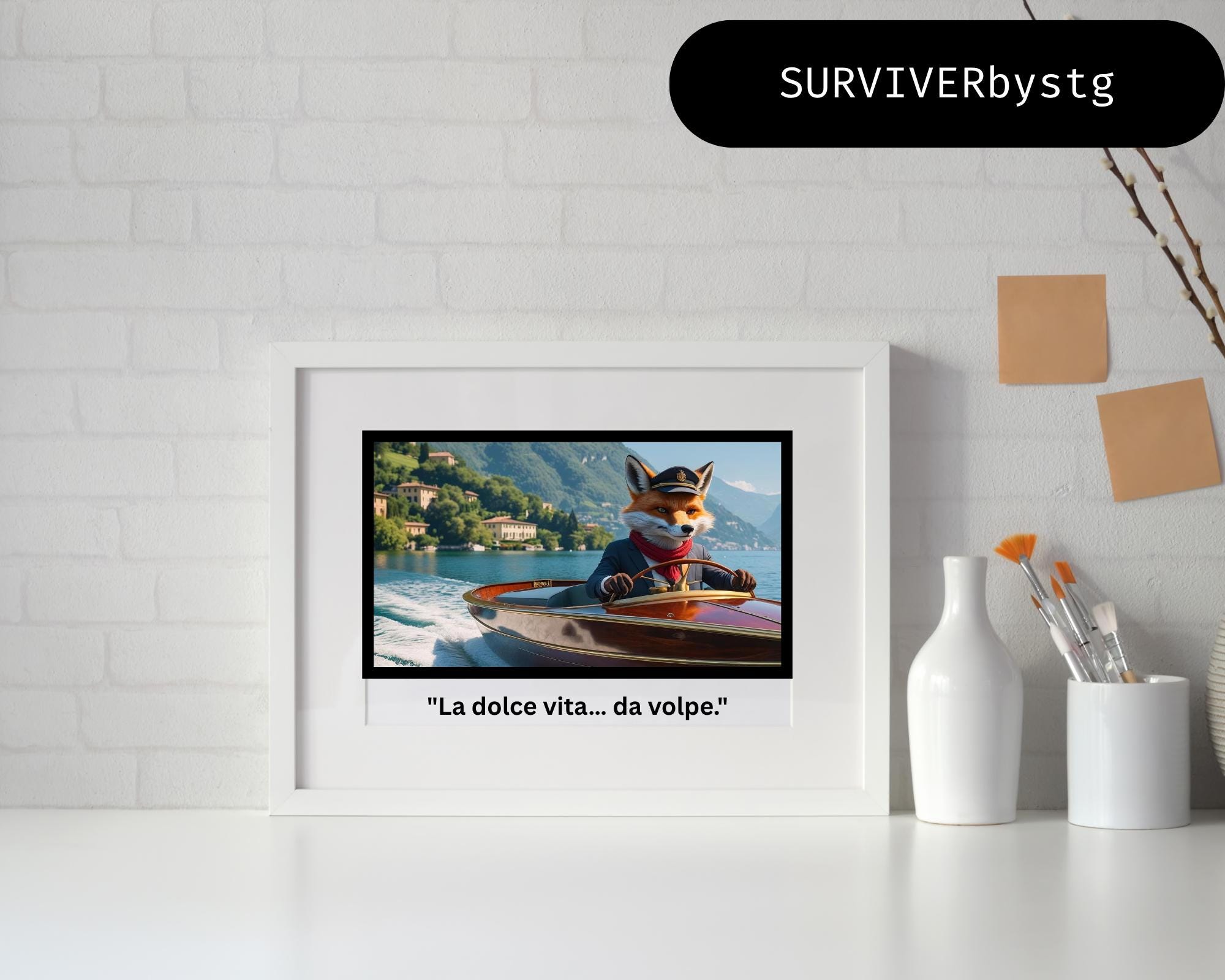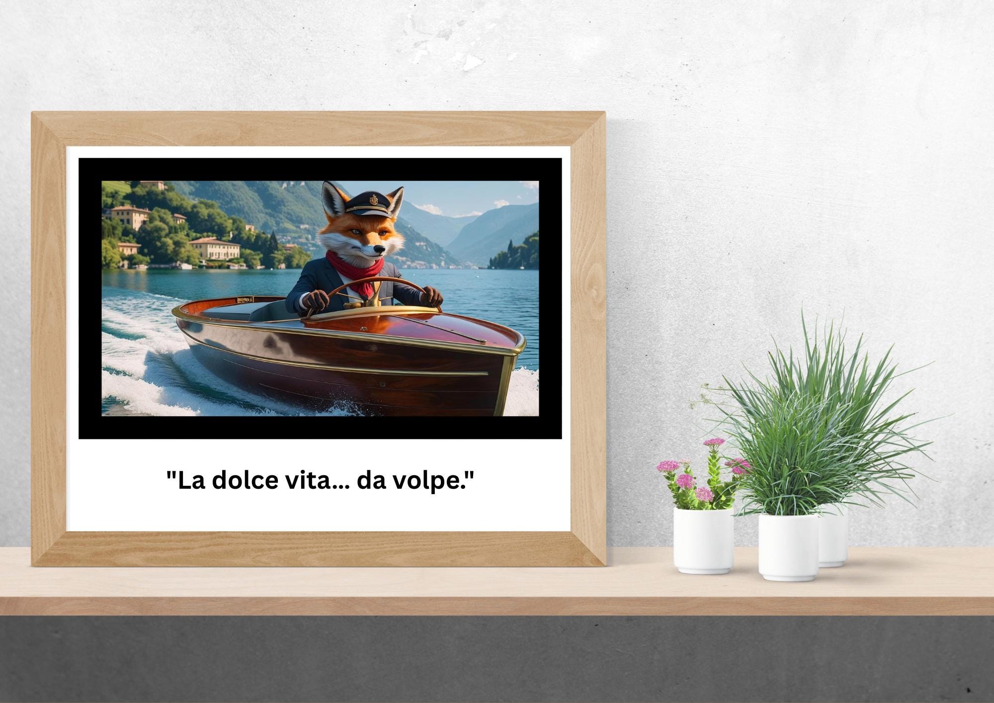 Featuring a dapper, anthropomorphic fox cruising a wooden speedboat through the stunning Italian lakes, this artwork blends elegance and playfulness in perfect harmony. Ideal for animal lovers, travel fans, and anyone with an eye for quirky sophistication.