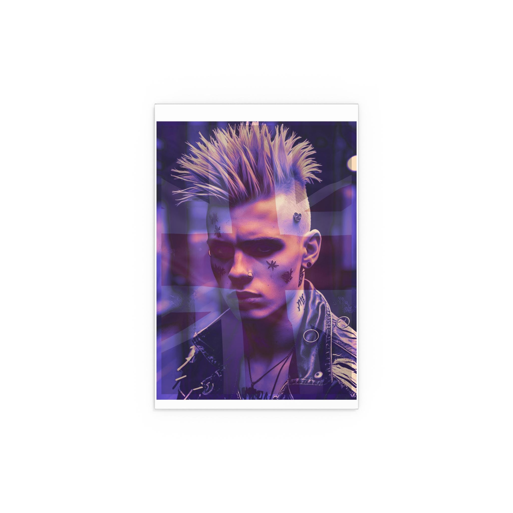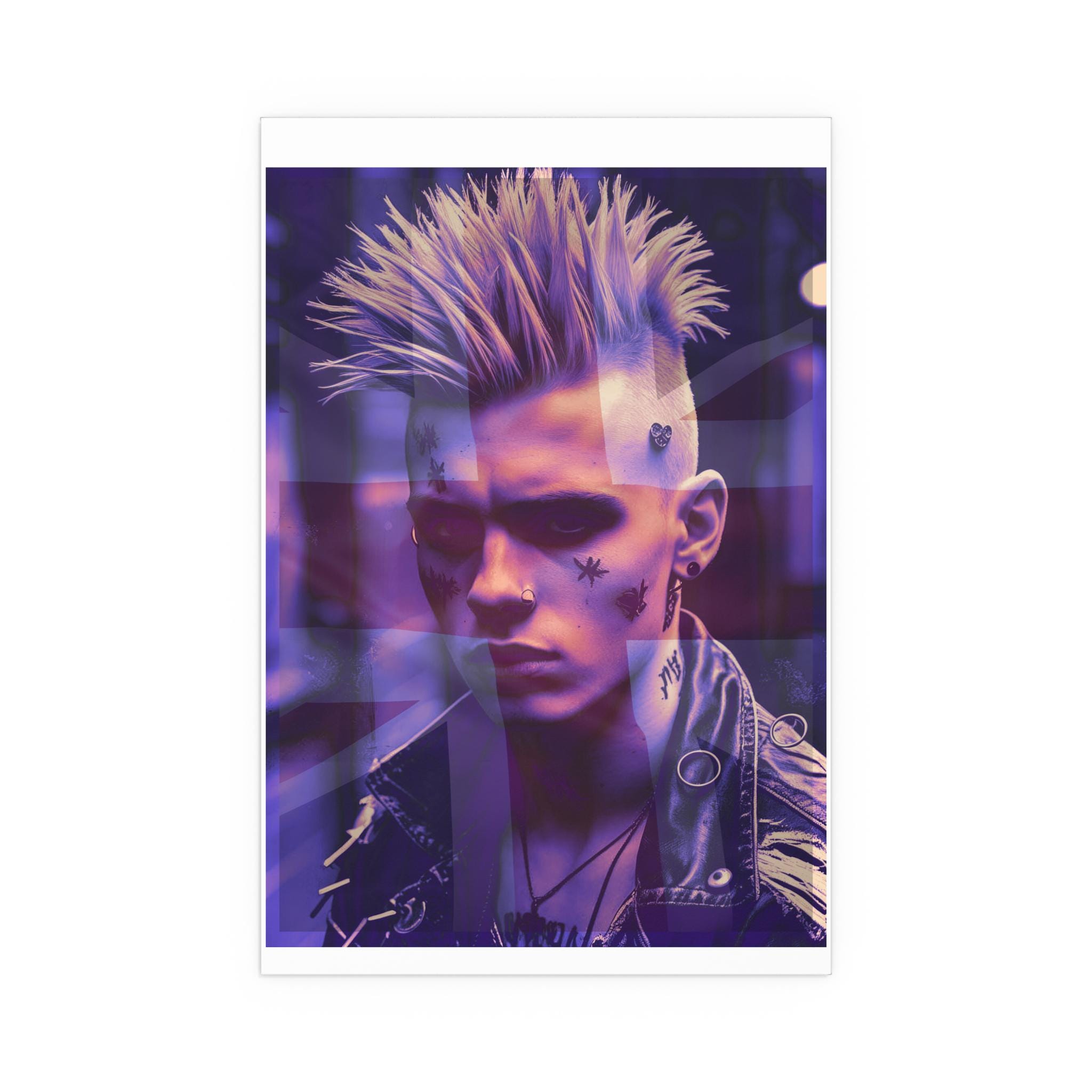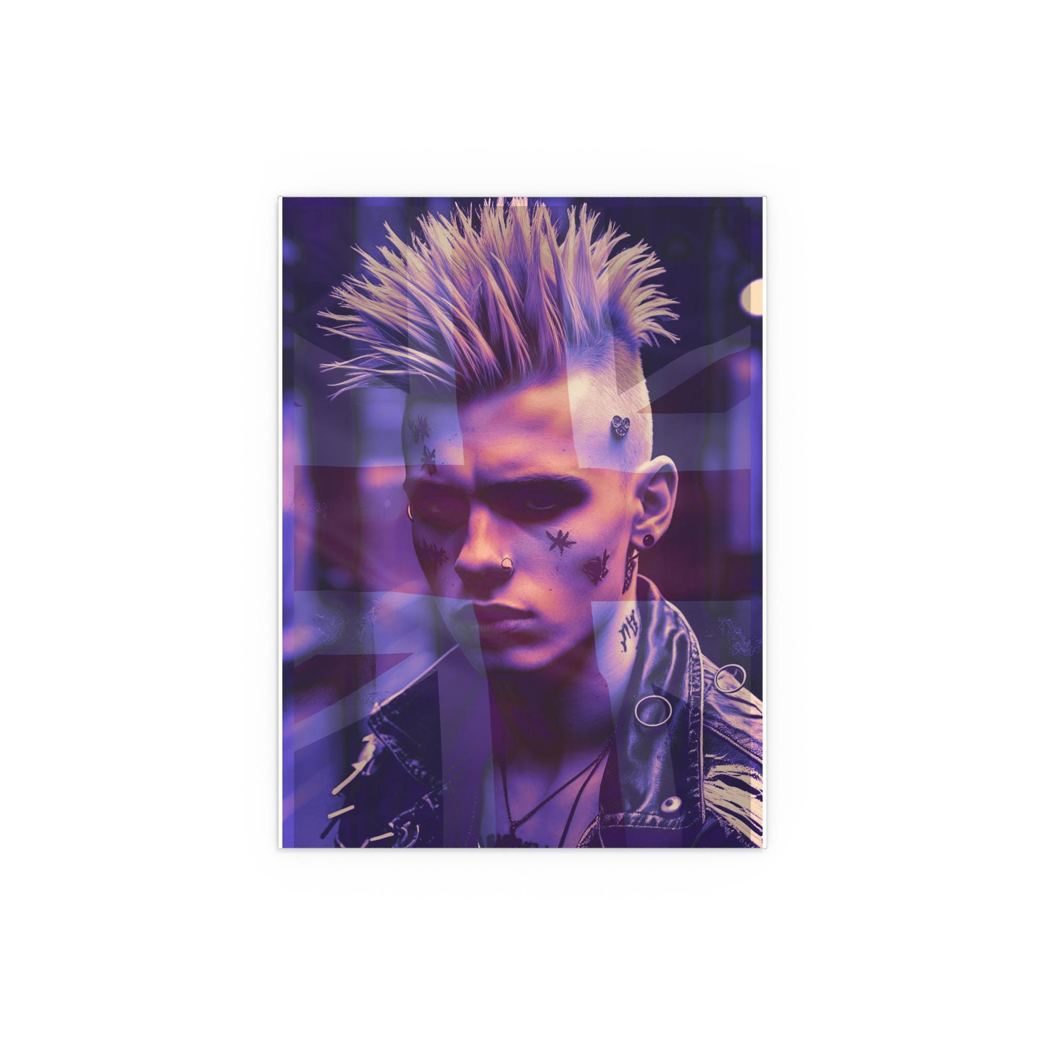 Featuring a mohawked punk with tattoos, piercings, and attitude — overlaid with the Union Jack flag in moody purple tones — this artwork fuses raw energy with iconic British counterculture. Perfect for punk fans, music lovers, and alternative decor collectors.