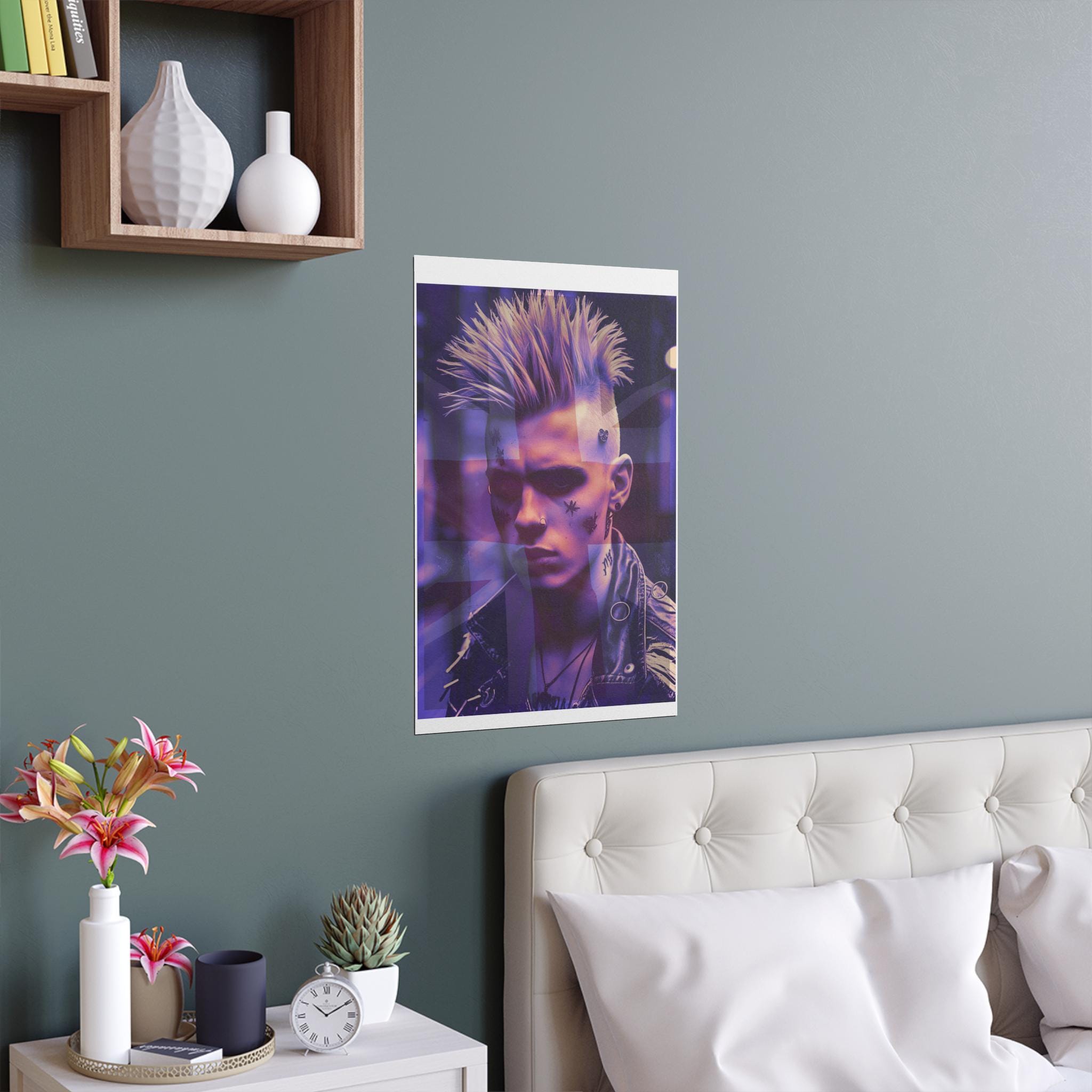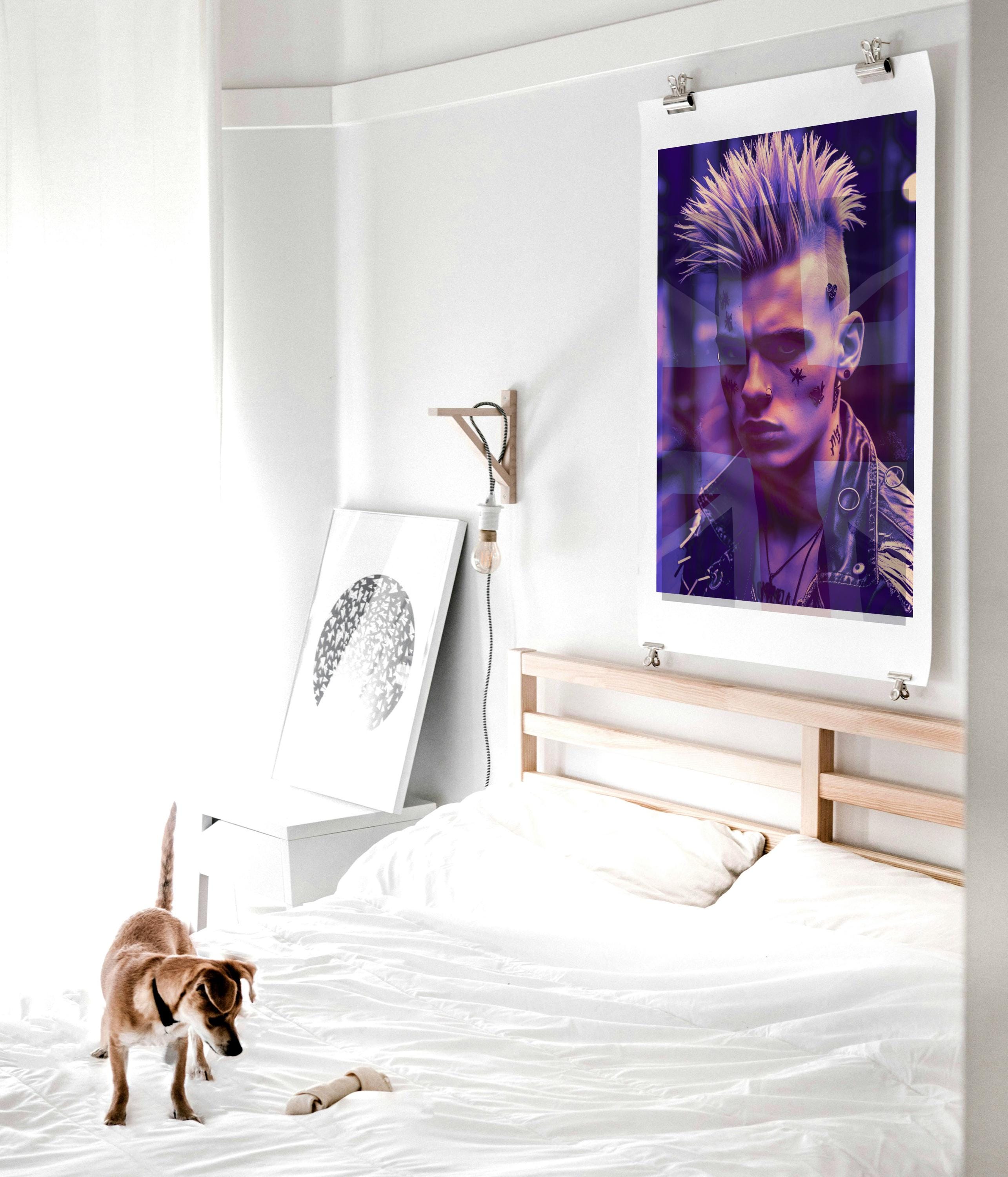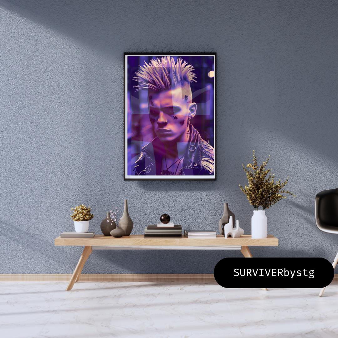 Featuring a mohawked punk with tattoos, piercings, and attitude — overlaid with the Union Jack flag in moody purple tones — this artwork fuses raw energy with iconic British counterculture. Perfect for punk fans, music lovers, and alternative decor collectors.
