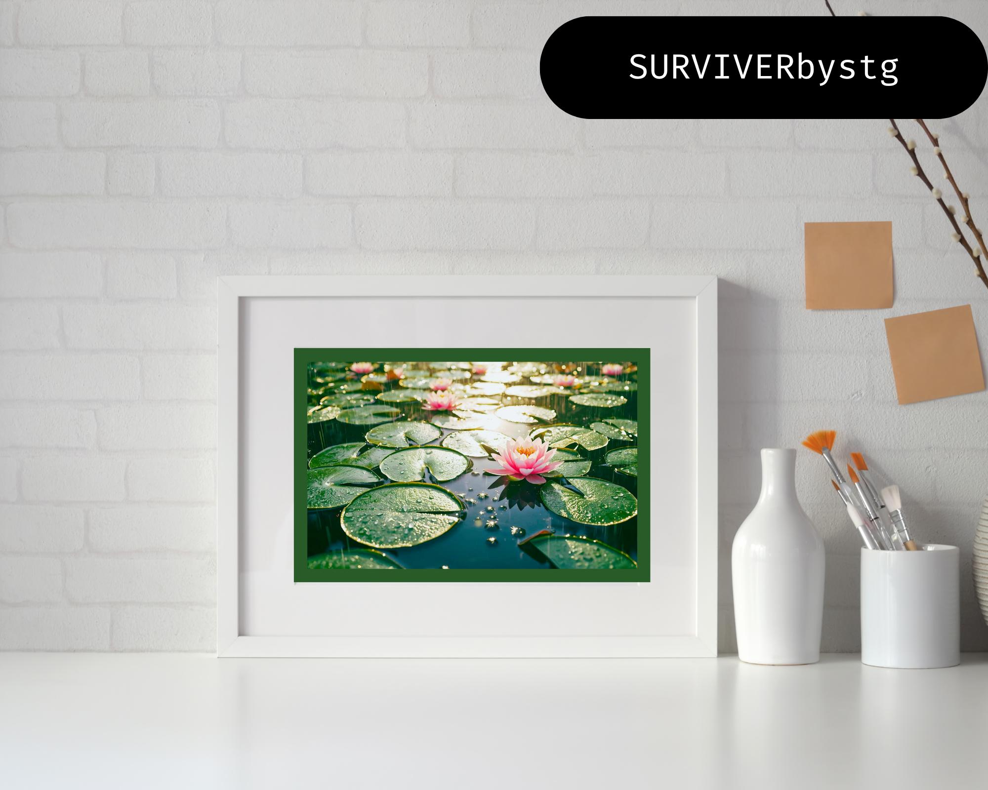 Bring a sense of peace and renewal into your home with this Water Lily Serenity digital wall art. Capturing the tranquil beauty of lily pads glistening with morning dew, this A4 landscape print symbolizes growth, calm, and new beginnings.