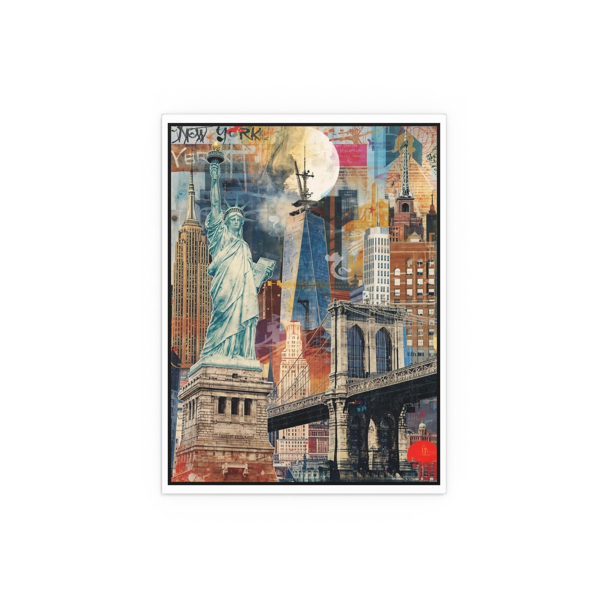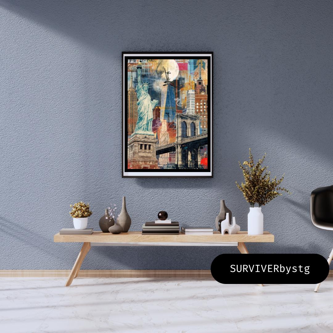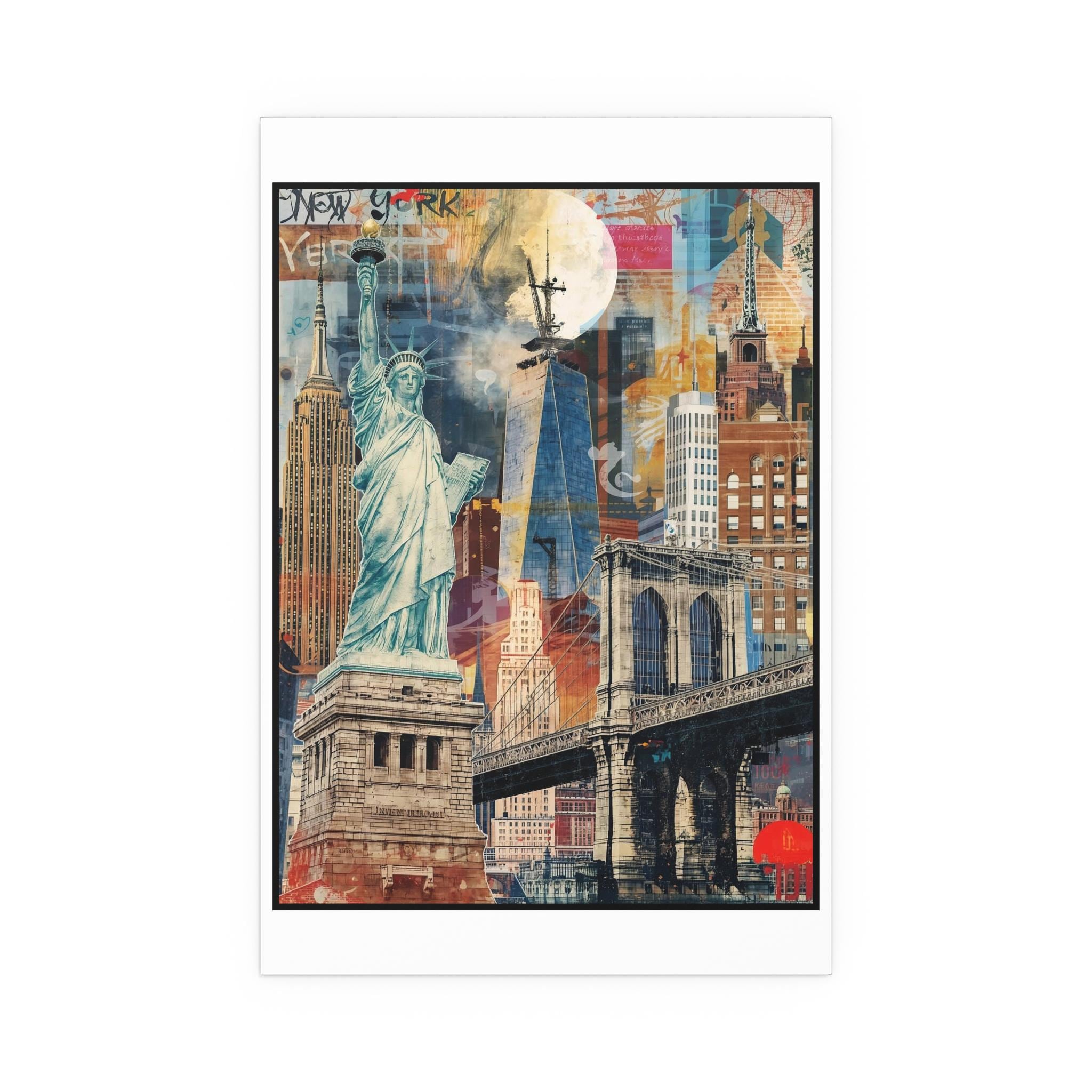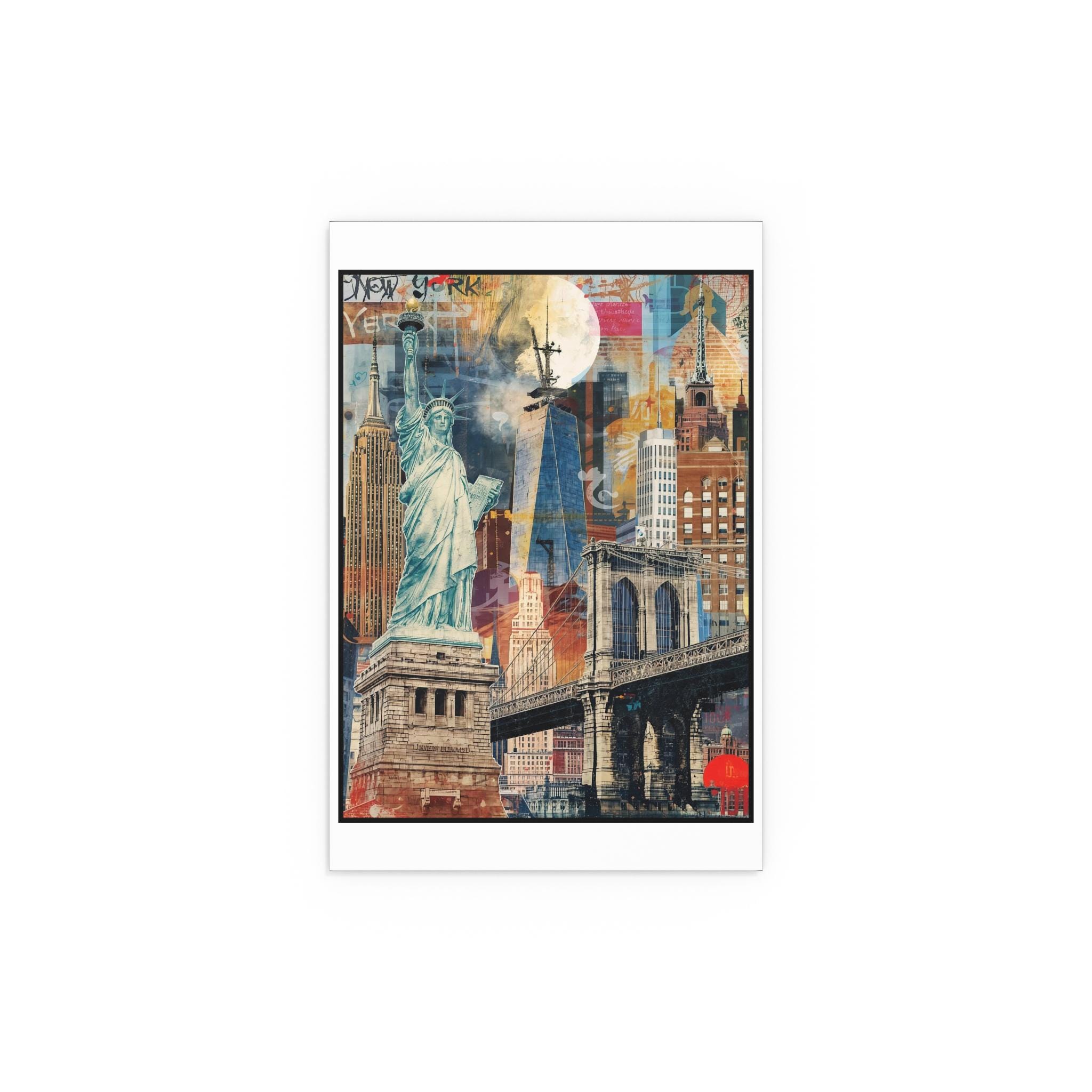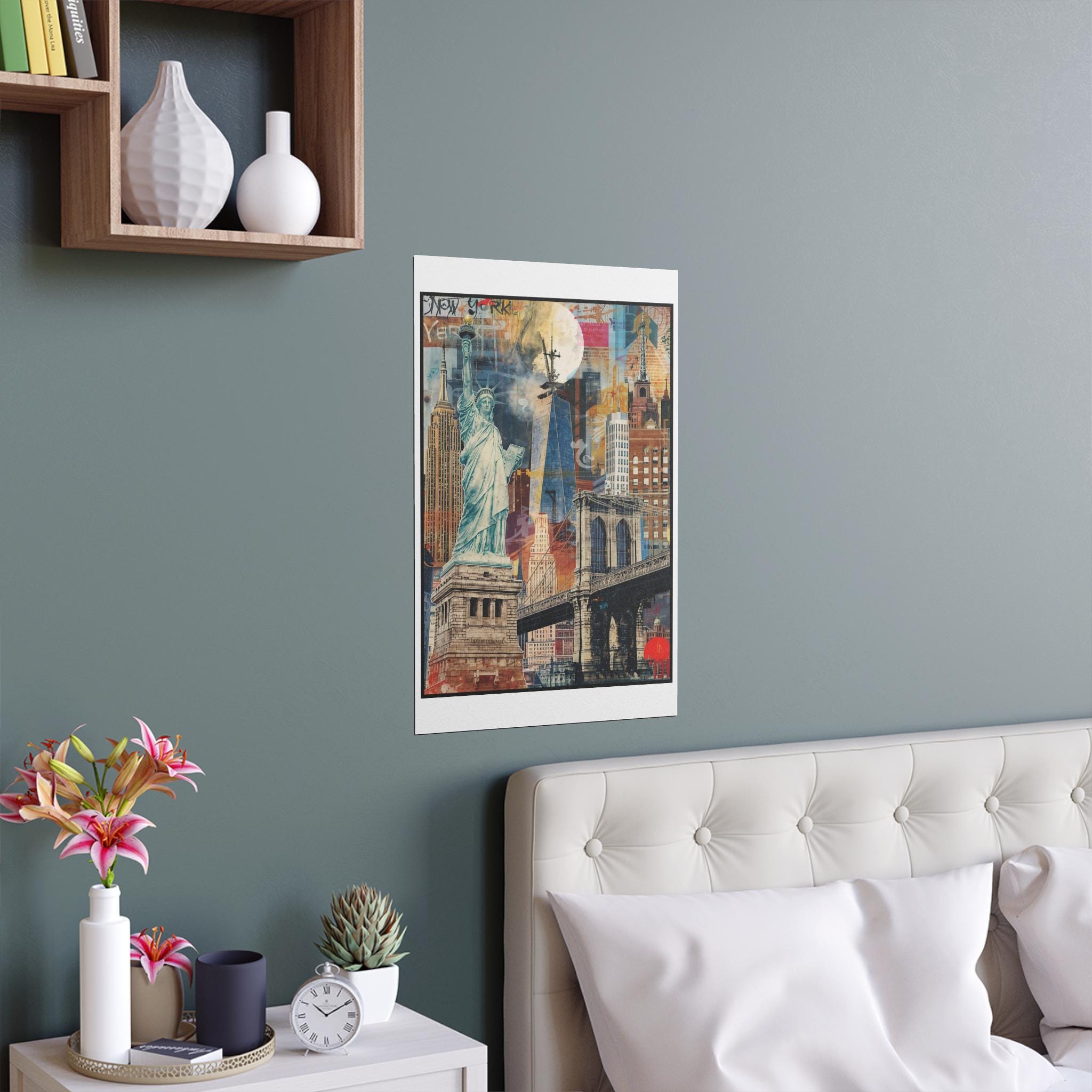 A vibrant Collage of Landmarks of New York poster, perfect for those who love the city or want to add a touch of urban vibe to their space. This indoor and outdoor silk poster is water-resistant and durable, making it ideal for any room or outdoor area. It is a great gift for travelers, city enthusiasts, or anyone looking to decorate their space with a New York theme. Perfect for decorating for New Year's Eve, Independence Day, or any New York-themed celebration.