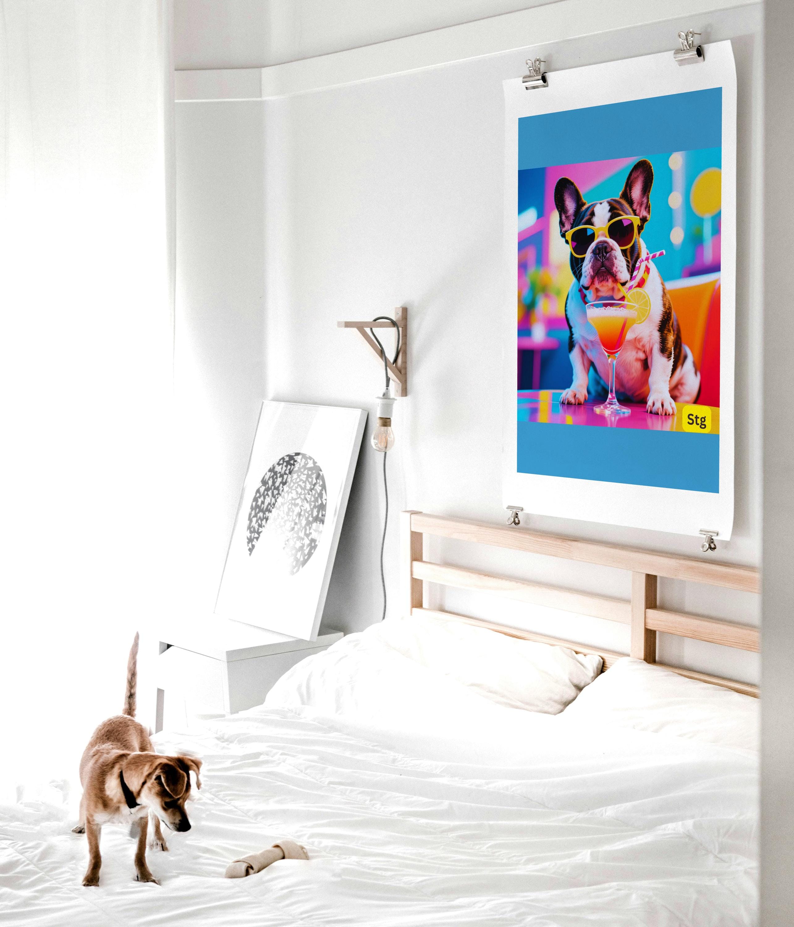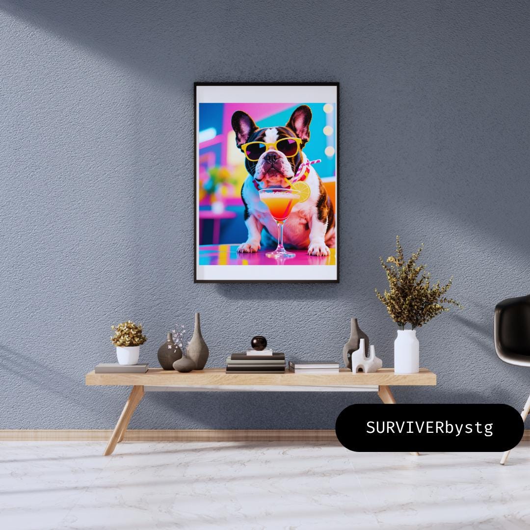 Add a touch of cool Frenchie vibes to your space with this funky Bulldog wall art poster. The vibrant colors and fun design make it a colorful and lively addition to any room. Perfect for dog lovers looking to add some personality to their walls.