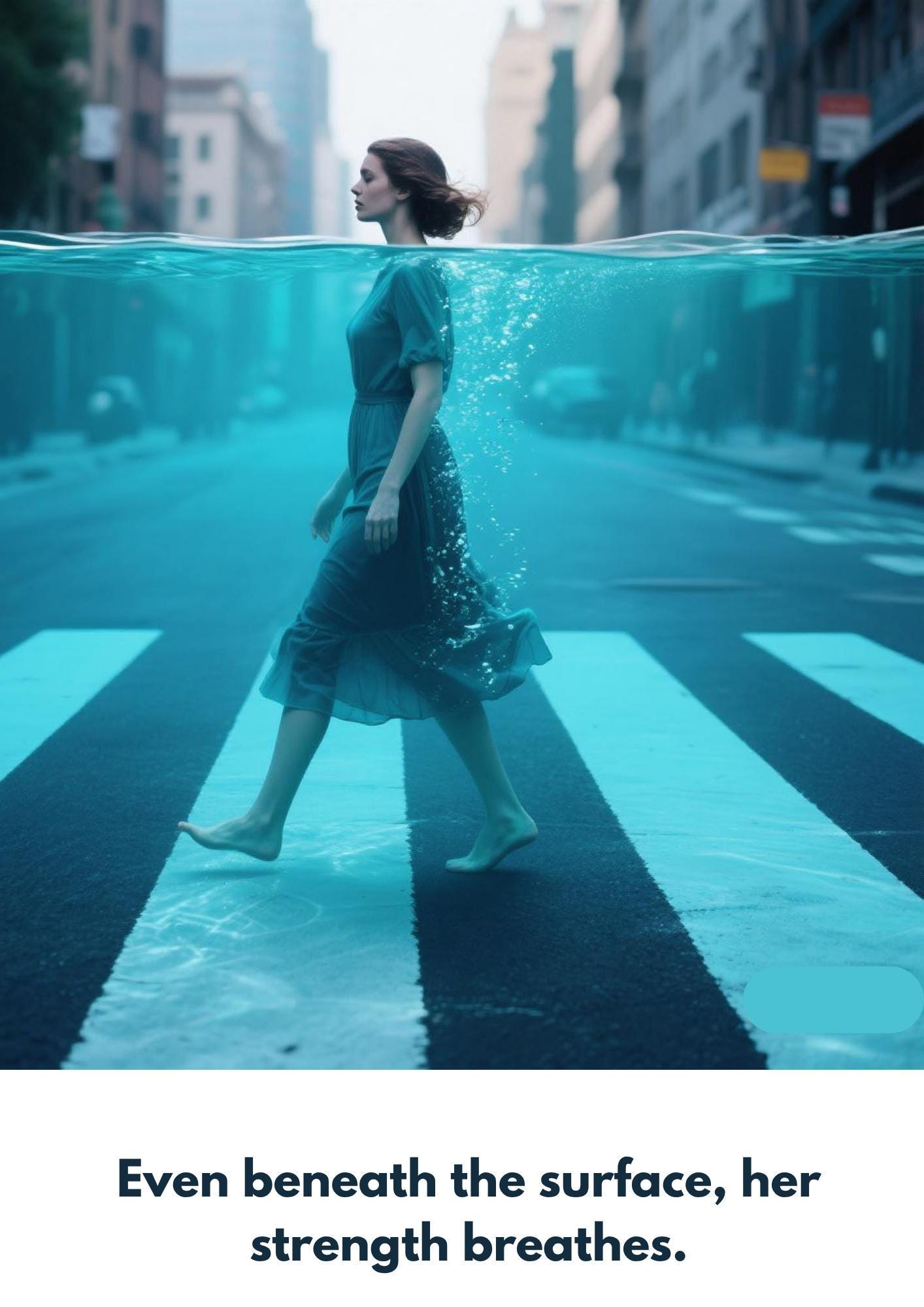 The image captures a woman moving confidently through an urban street bathed in cool blue water. This unique urban water artwork invites you to reflect on overcoming challenges and finding strength within yourself.