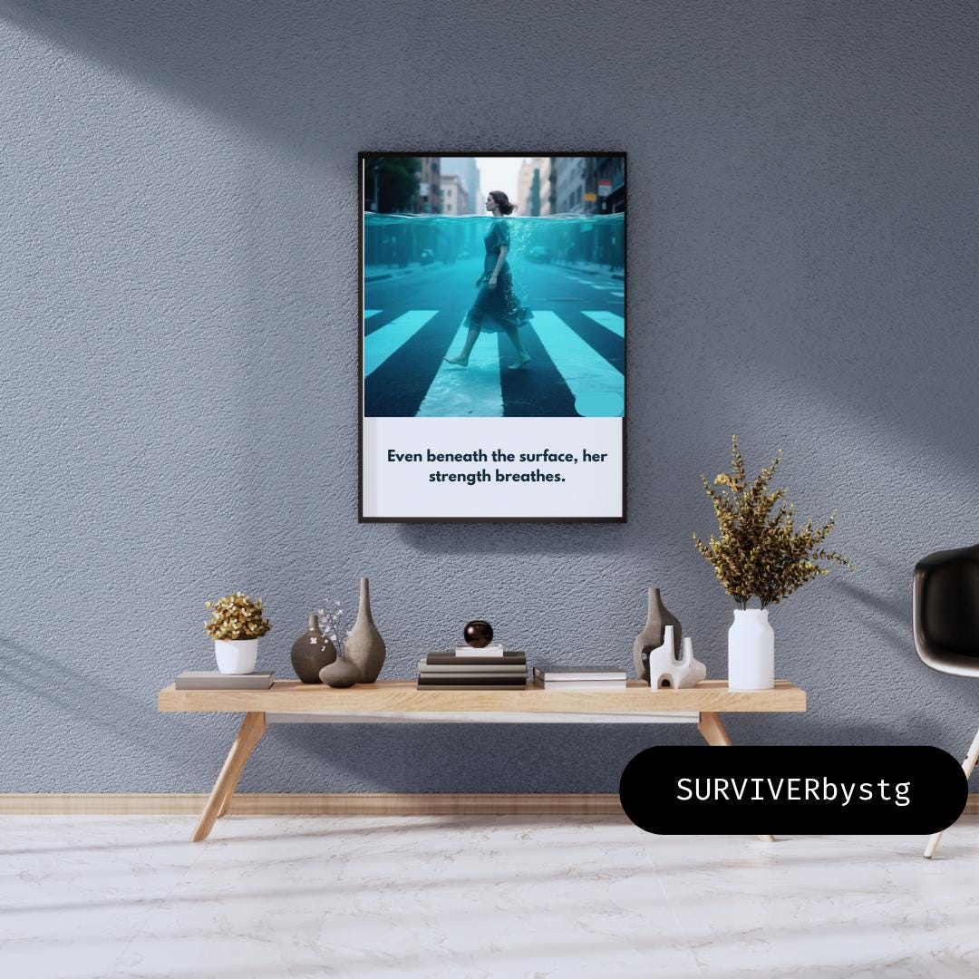 “She Walks Through Water” is a surreal empowerment art print/poster that celebrates quiet strength and resilience. This striking artwork features a woman gracefully walking through an urban street submerged in calm, crystal-blue water — a poetic reminder that even when life feels heavy, we can rise and move forward with grace.