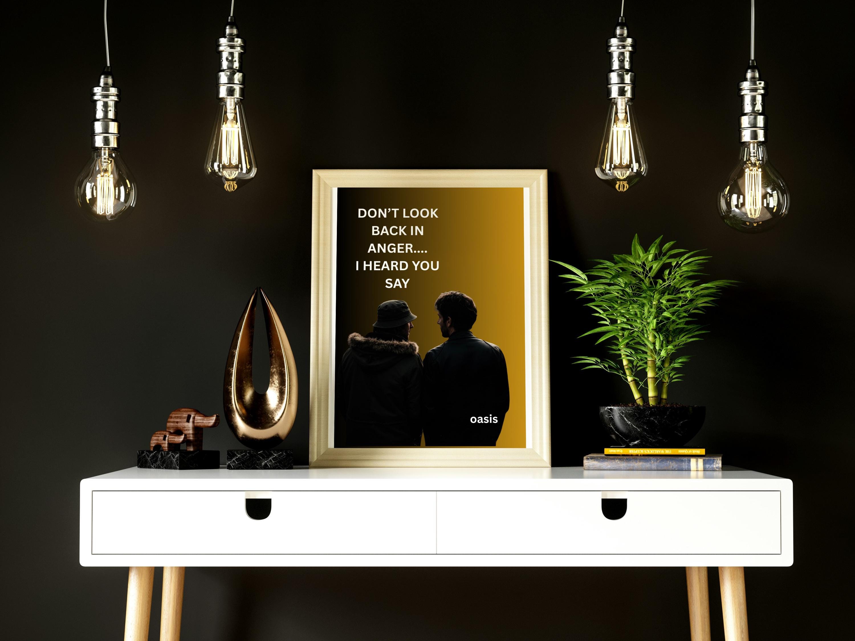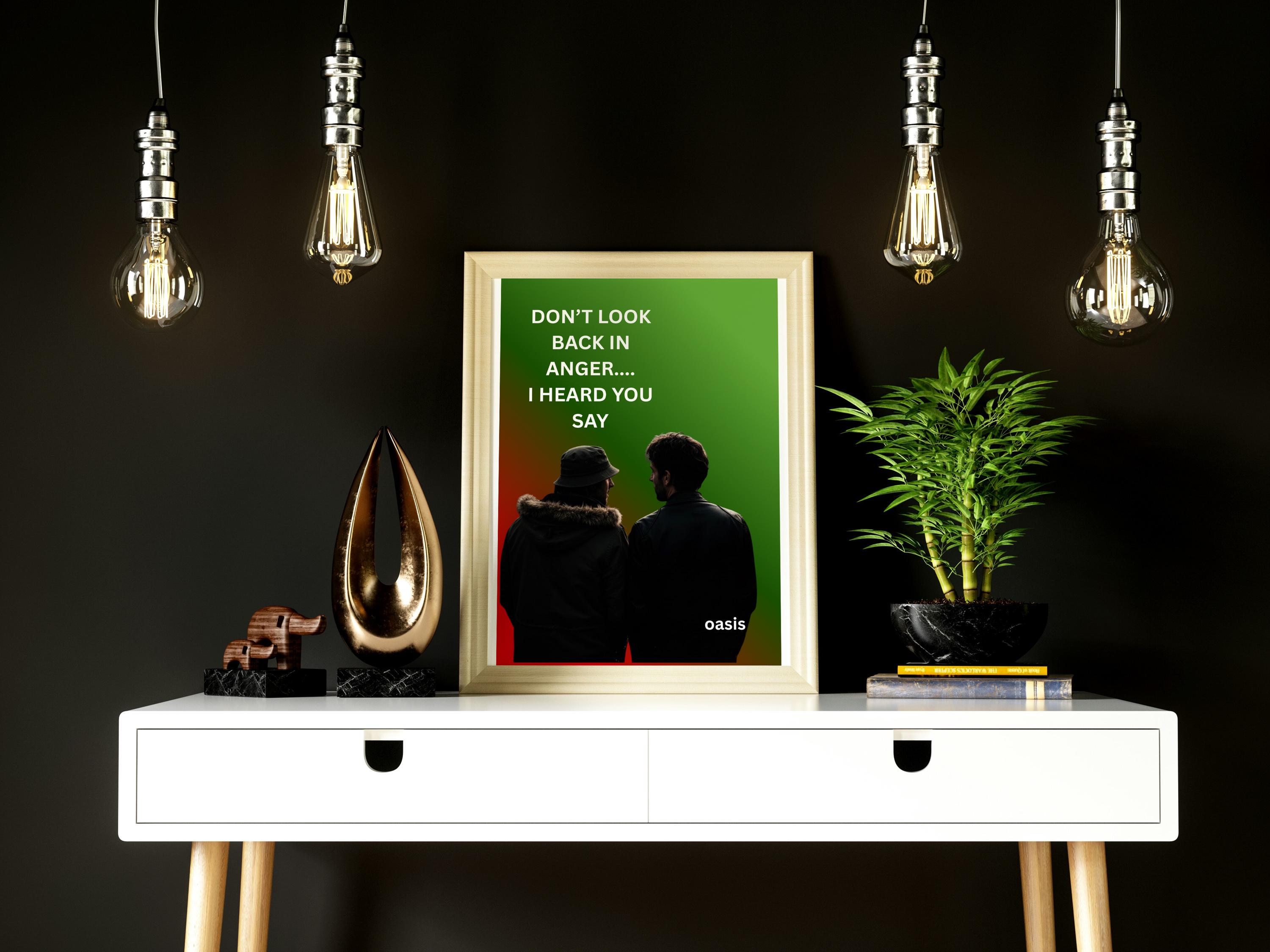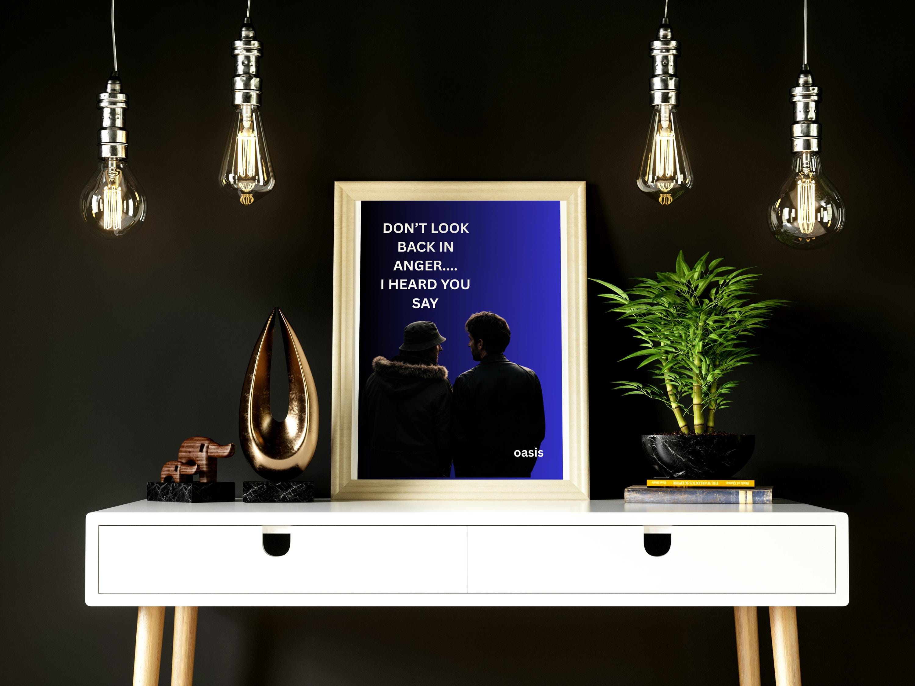 Celebrate one of the defining songs of the Britpop era with this “Don’t Look Back in Anger” lyric poster by Oasis. Featuring a moody background and subtle 90s-inspired silhouettes, this artwork captures the attitude, emotion and cultural impact of a true British rock classic.