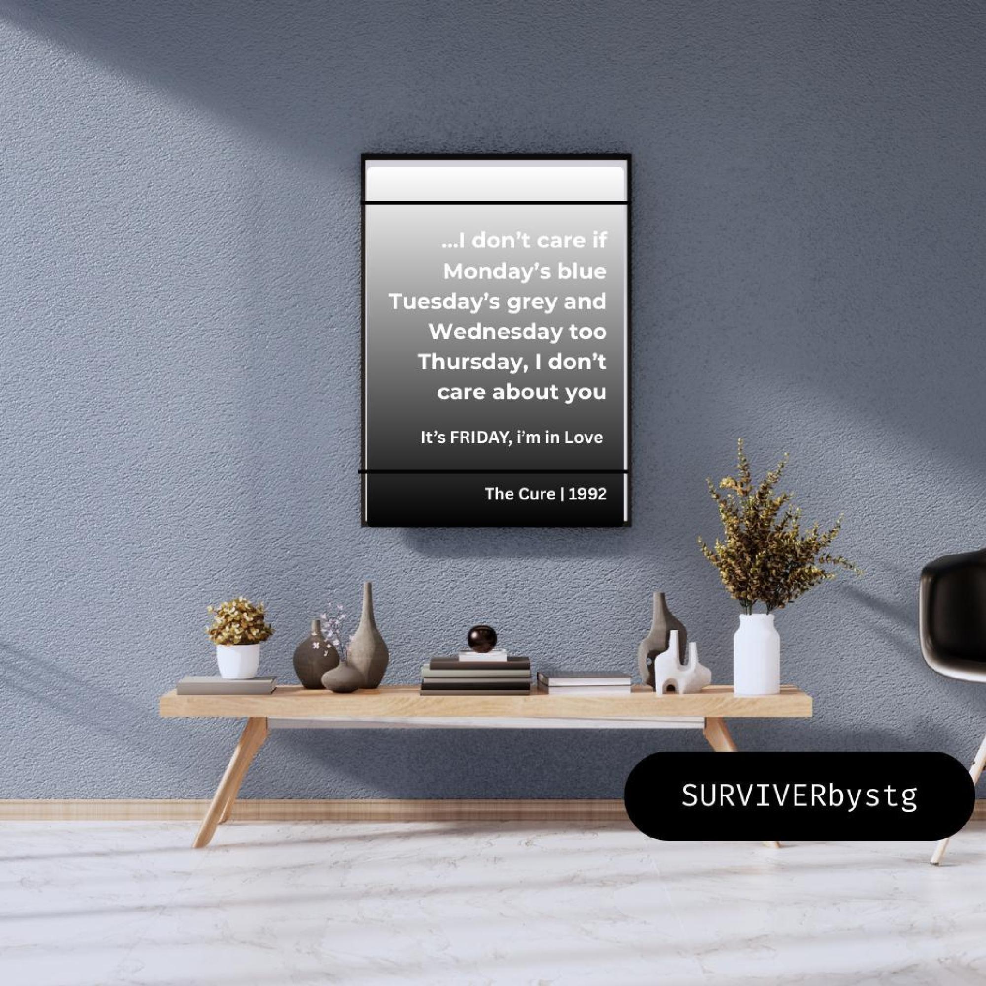Celebrate one of the most joyful songs of the 1990s with this “Friday I’m in Love” lyric poster by The Cure. Designed with a modern gradient background and minimalist typography, this artwork blends lyrical emotion with contemporary style.