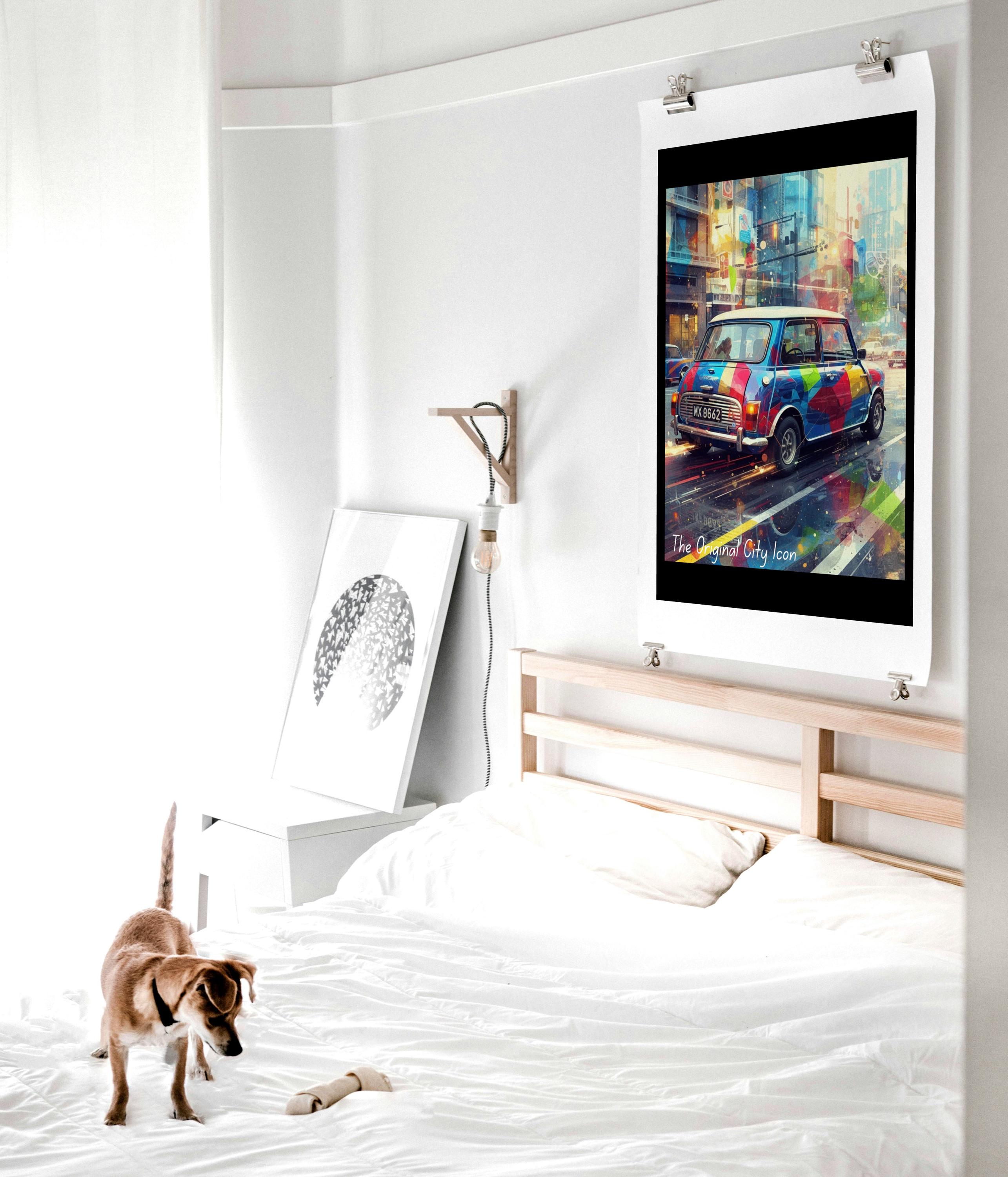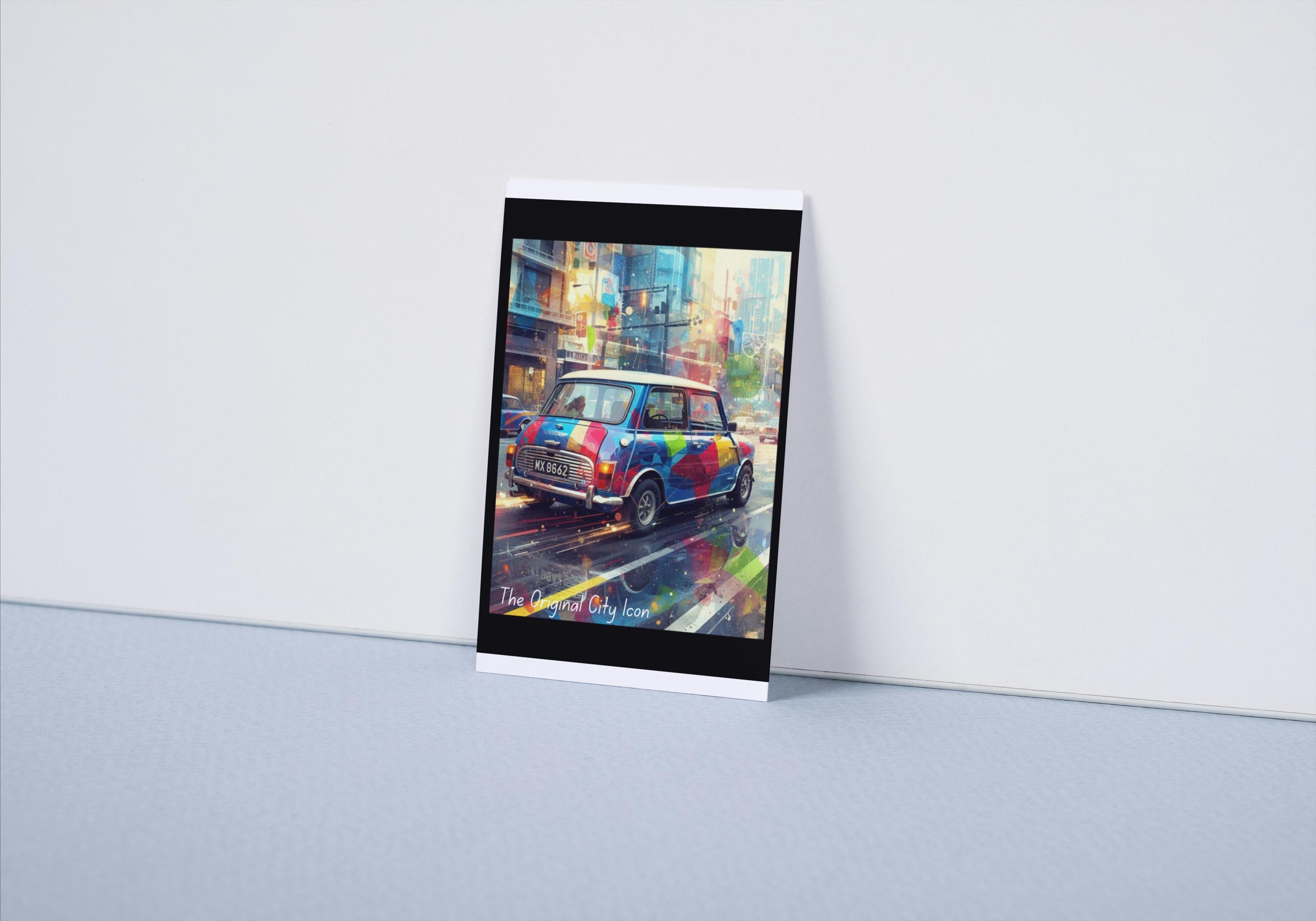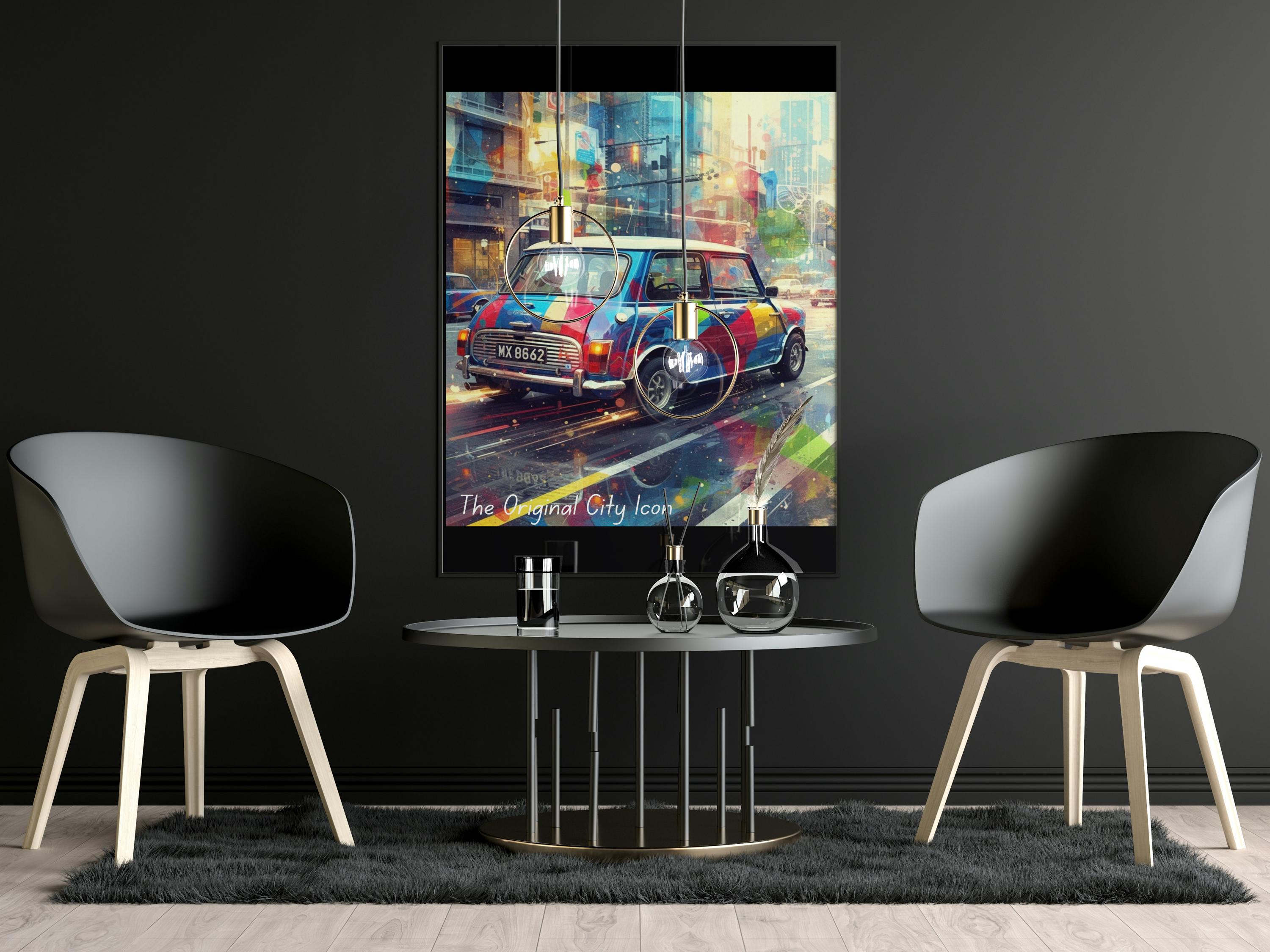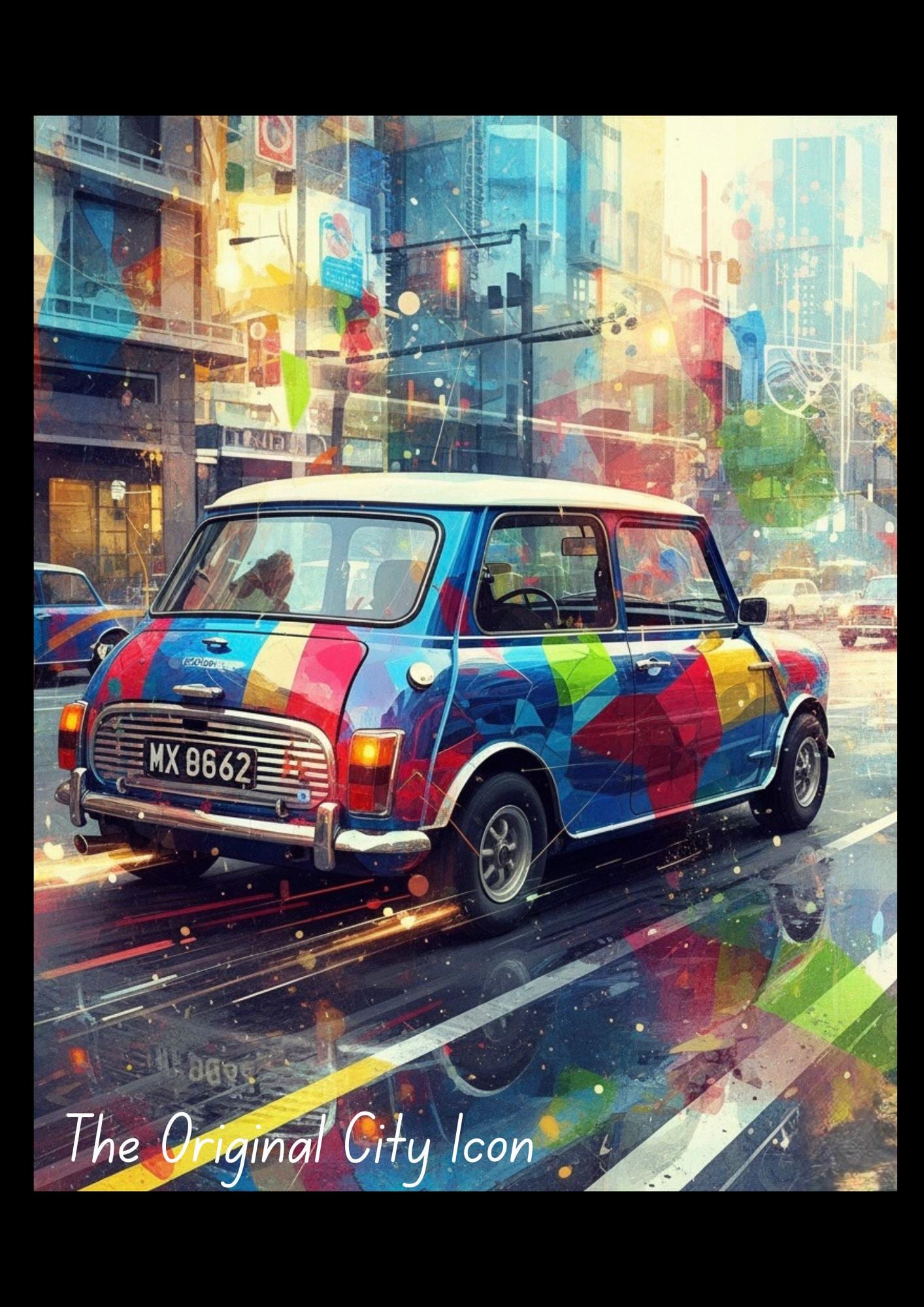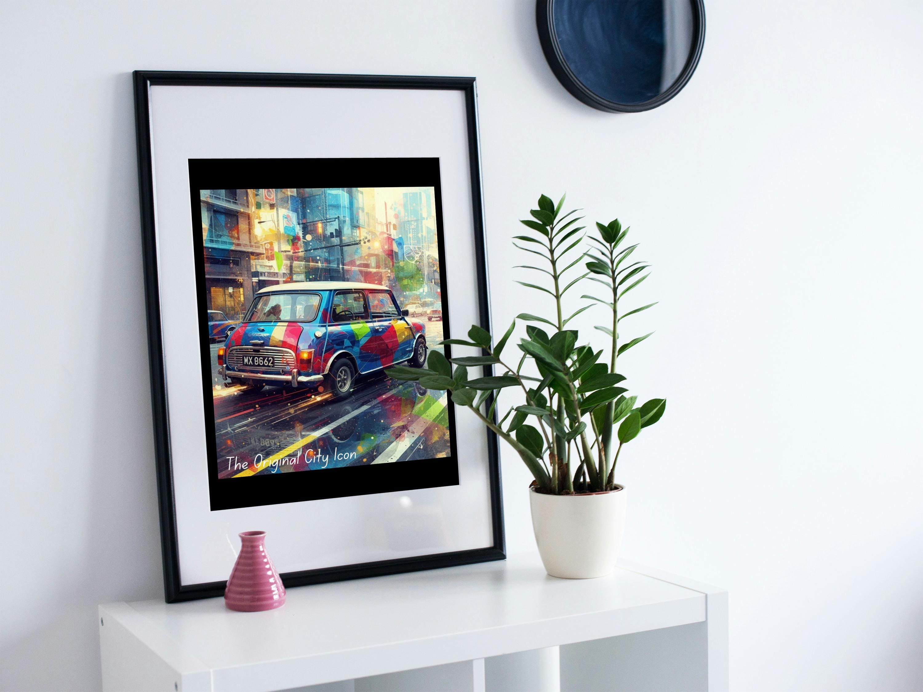 Celebrate your love of city life and classic cars with this classic mini poster—a vibrant car print inspired by the timeless Mini Cooper. This urban car art combines retro city artwork with bold colours and street style flair, creating a standout piece for your wall.
