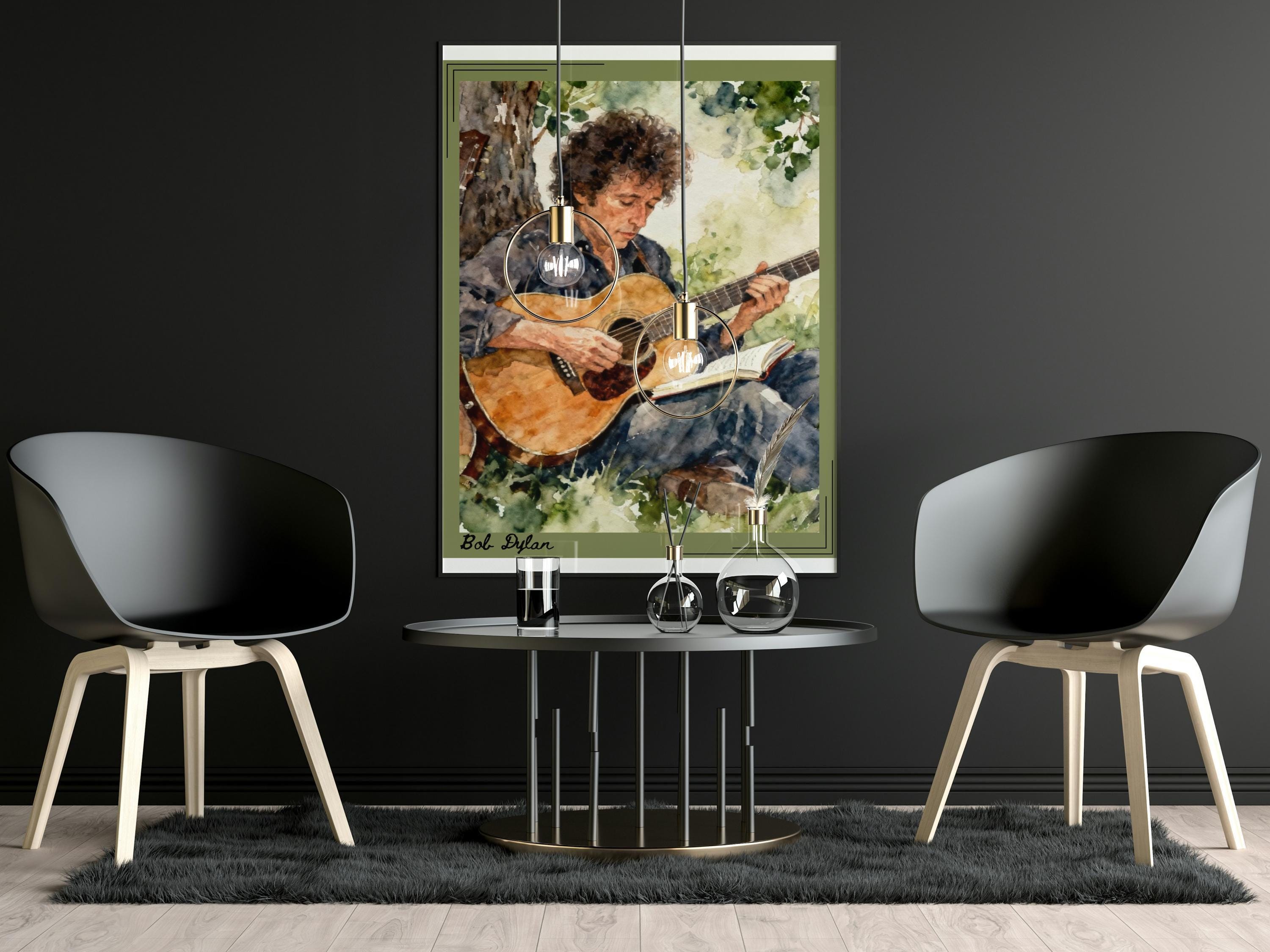 Ideal for home studios, living rooms, creative spaces and relaxed interiors, this artwork appeals to fans of folk music, acoustic songwriting and iconic musician art. Its gentle colour palette makes it easy to style as a standalone piece or within a curated music-themed gallery wall.