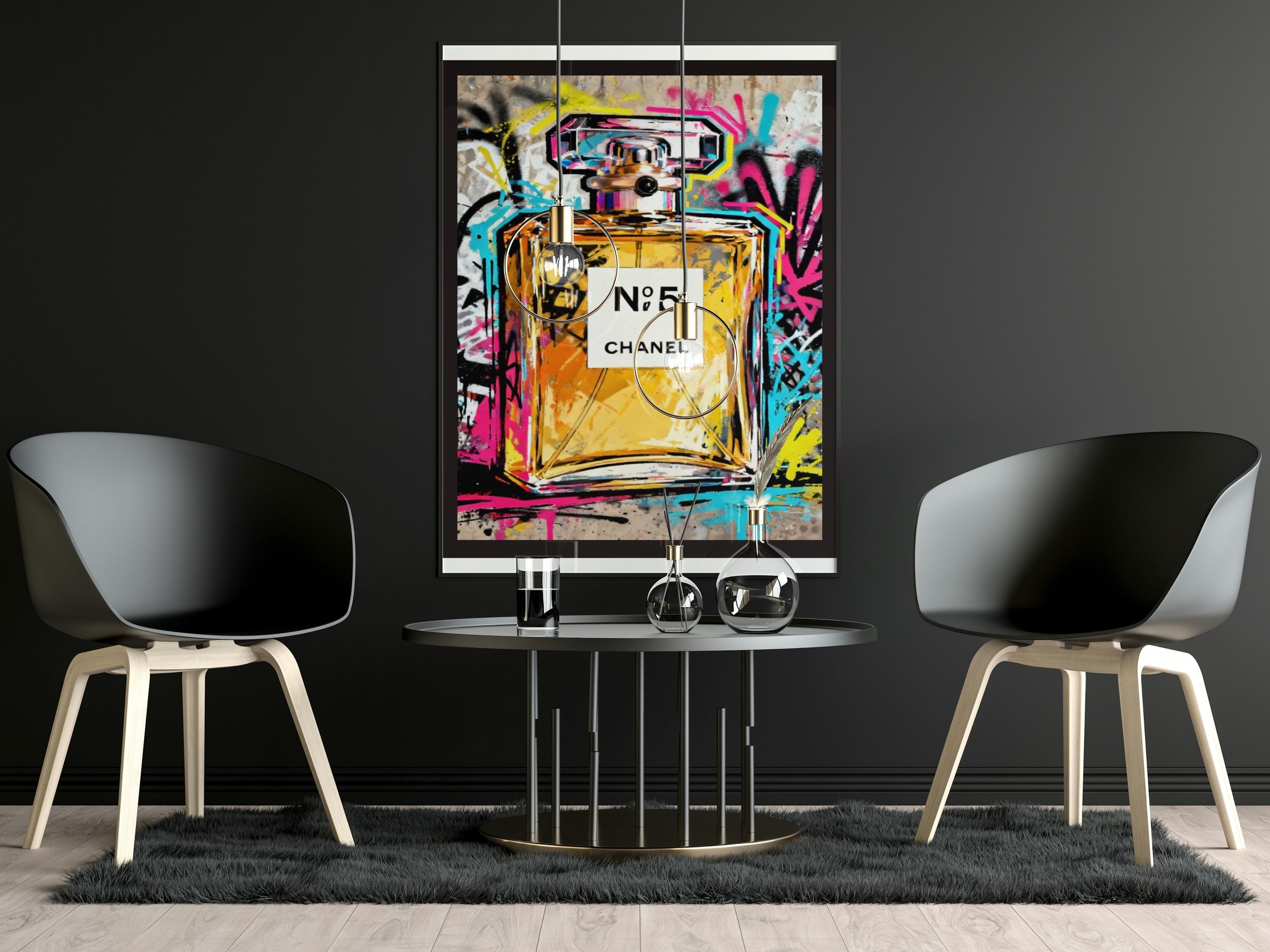 A bold perfume graffiti art print inspired by iconic fashion and fragrance culture. This striking pop art artwork combines street art energy, vibrant colour splashes, and modern graphic style to create a powerful statement piece for contemporary interiors.