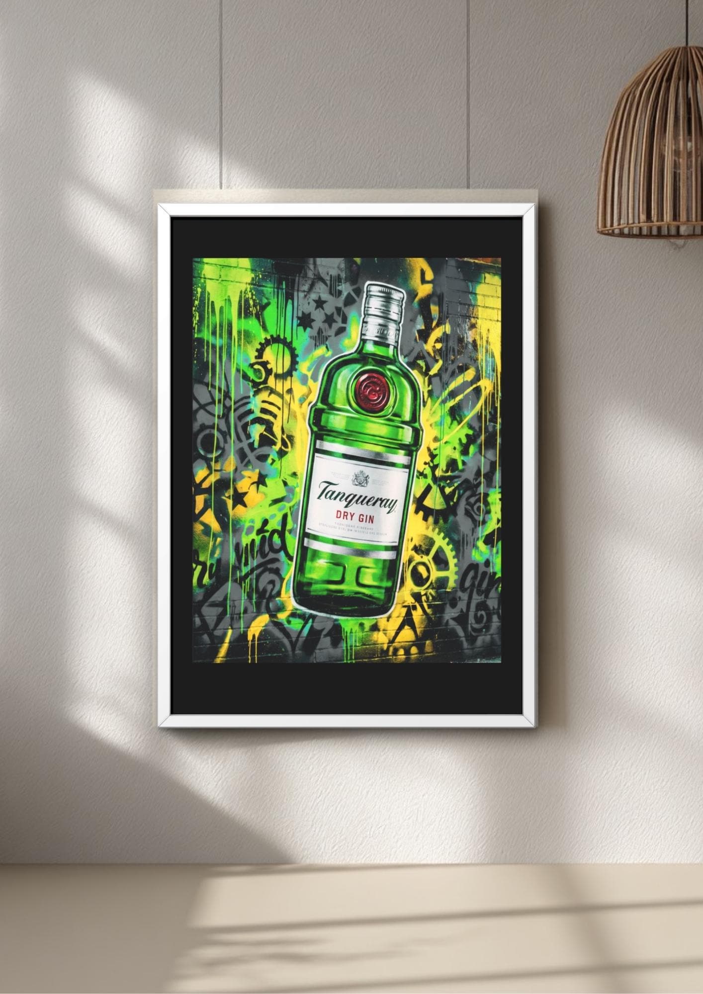 Whether you're a gin fan or looking for the perfect gin lover gift, this print brings modern bar decor to life. The vivid green Tanqueray bottle stands out against a graffiti-inspired backdrop, creating bar wall decor that fits right in with both minimal and eclectic interiors.