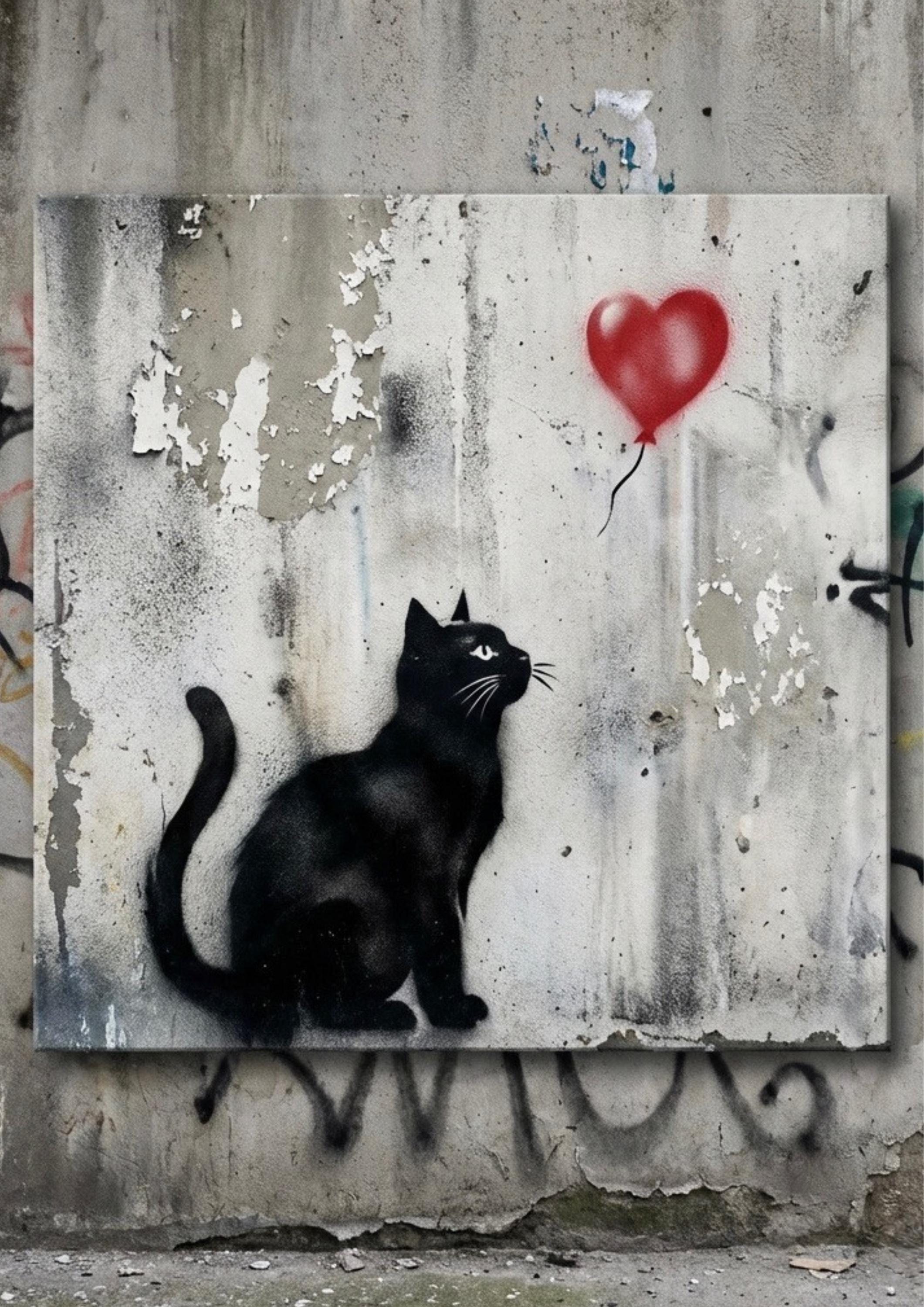 The Urban Black Cat art print is a modern wall artwork inspired by street graffiti and contemporary urban design. This piece features a bold black cat silhouette set against a textured wall, echoing the visual language of Banksy-inspired street art.