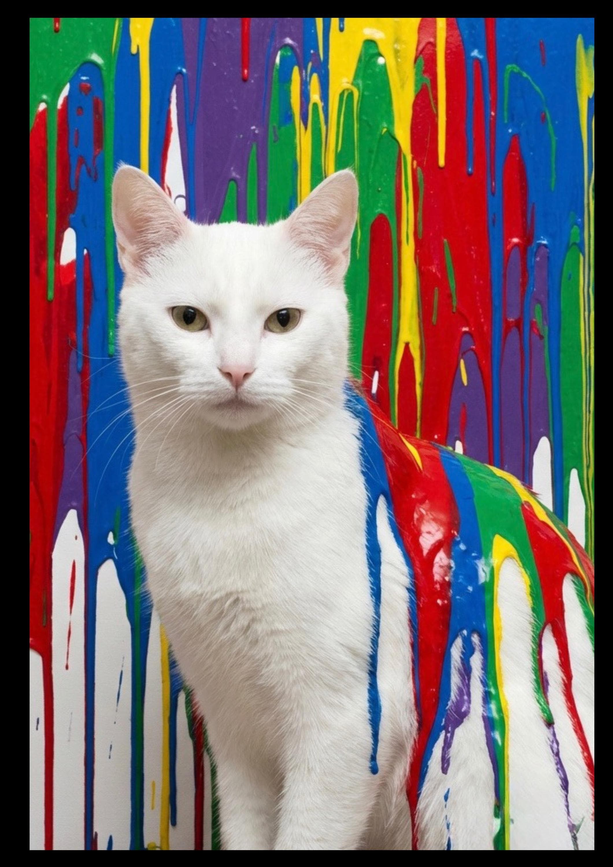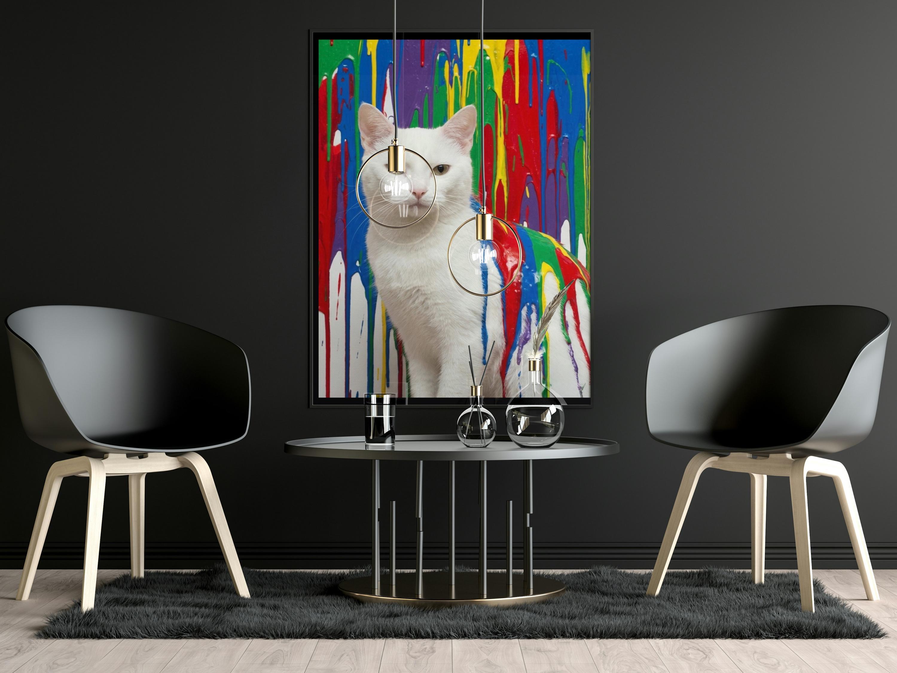 This vibrant white cat graffiti art print blends bold colour drips with modern pop art style, creating a striking statement piece for contemporary interiors. Featuring a calm white cat set against a dynamic, paint-splashed background, this artwork brings personality, colour, and creativity into any space.