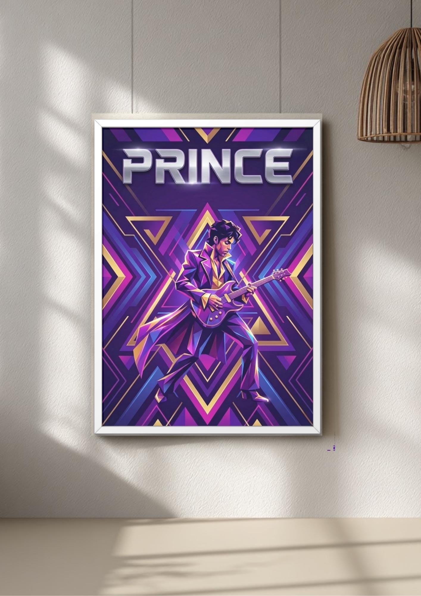 Celebrate the unmistakable style and sound of Prince with this bold, contemporary pop‑art print. Featuring rich purples, geometric textures and a dynamic illustration of the music icon, this artwork brings colour, attitude and rhythm into any space.