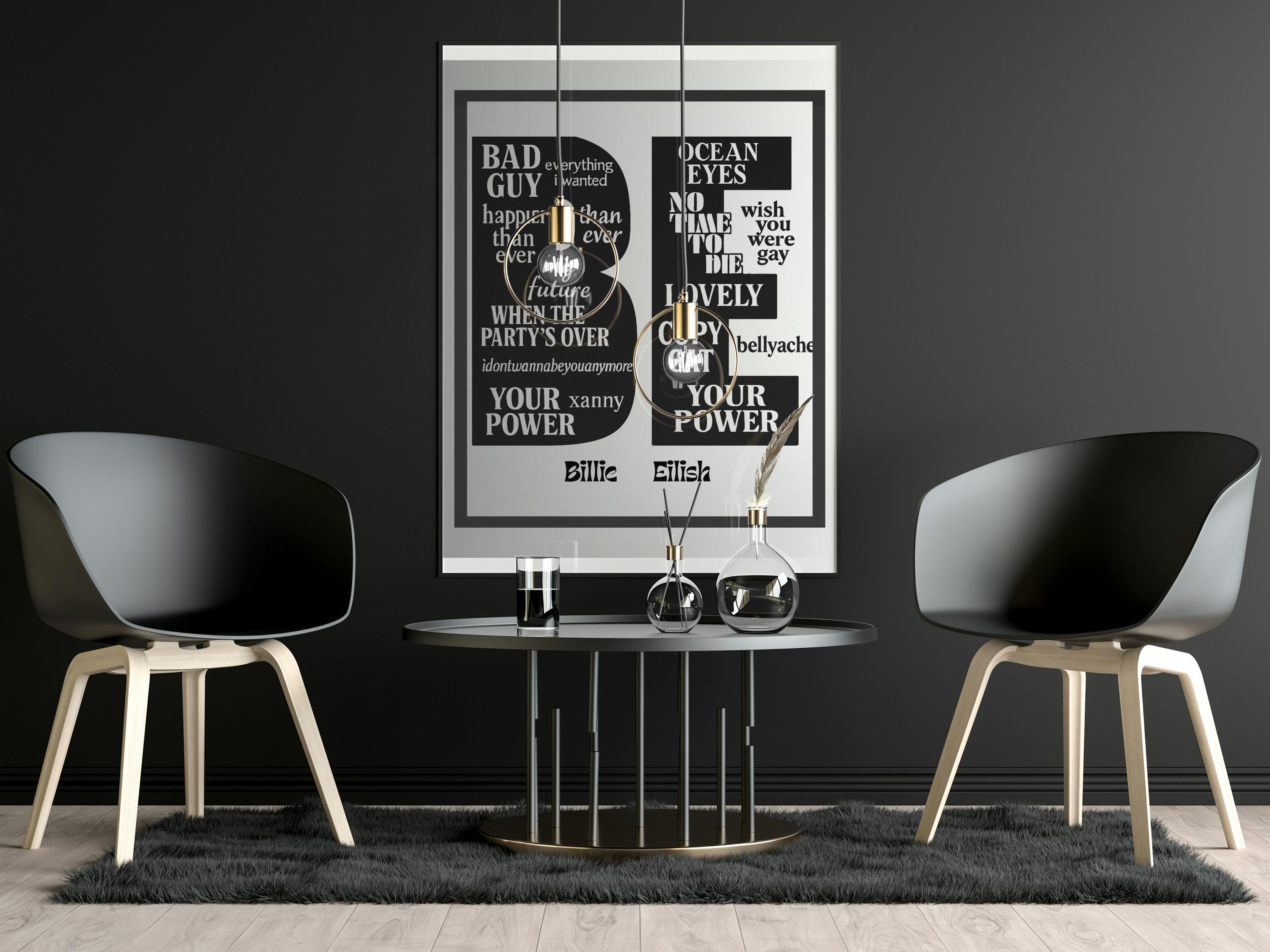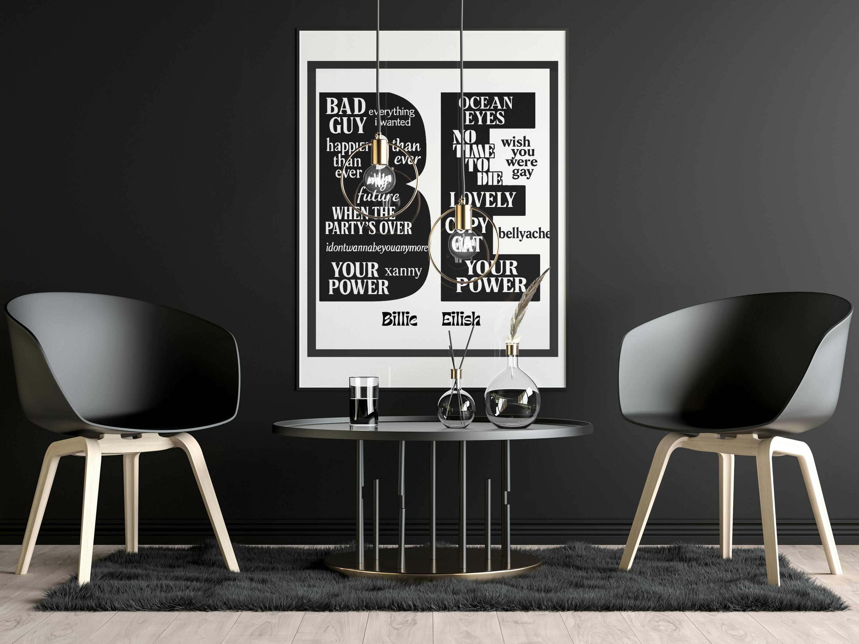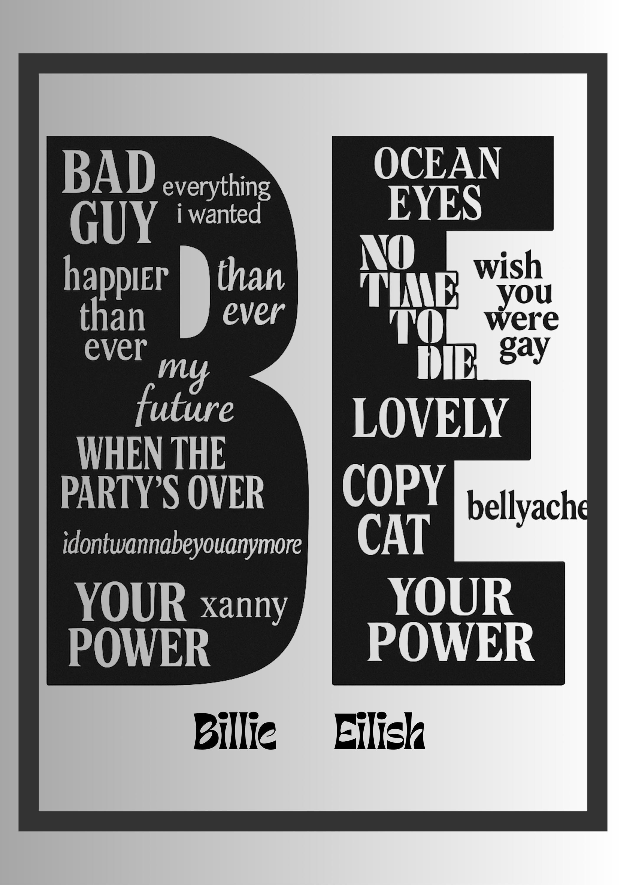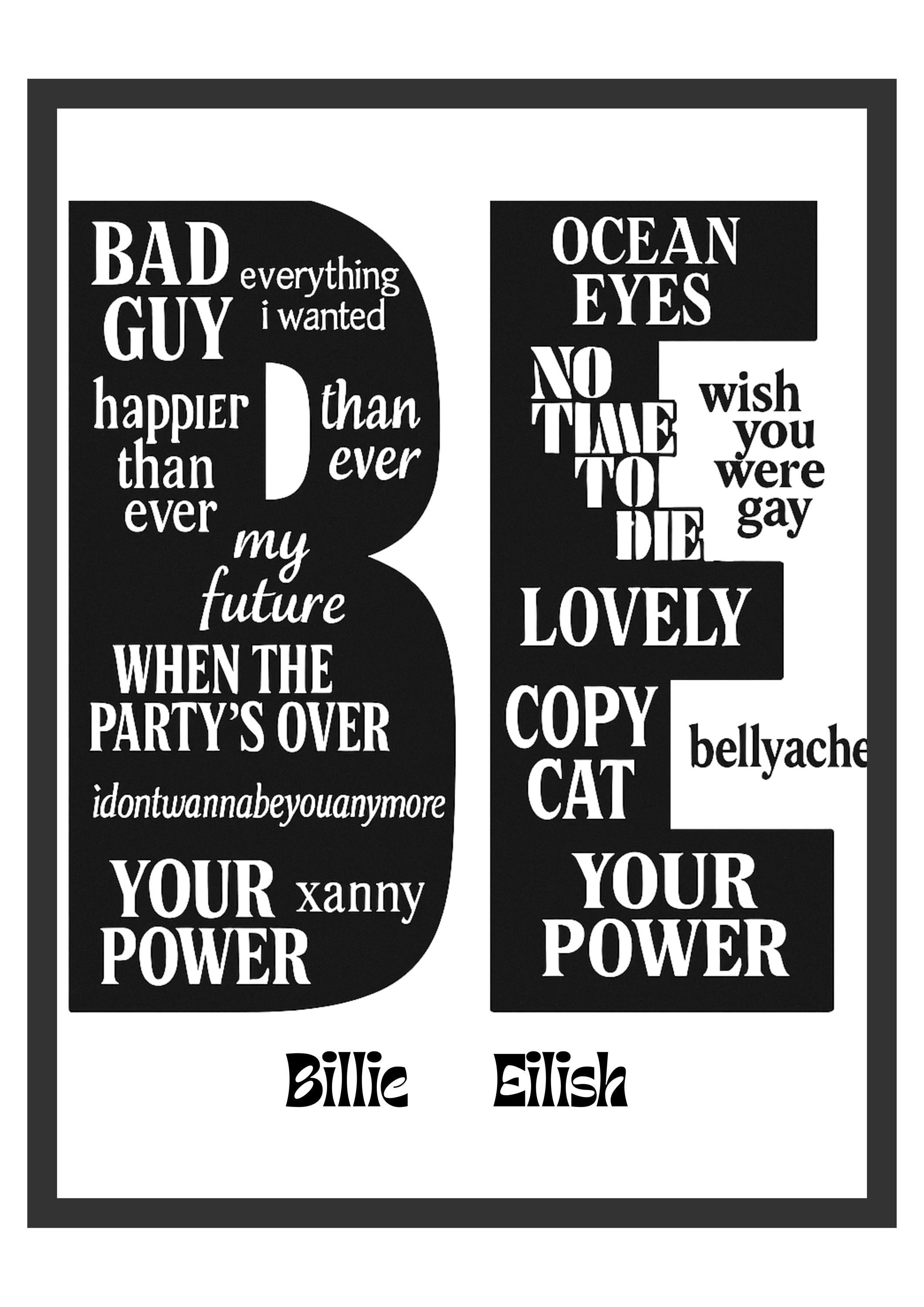 This Billie Eilish typography print is a modern tribute to one of today’s most influential music artists. Featuring a carefully curated selection of iconic song titles, the design uses bold lettering and clean composition to create a striking piece of contemporary wall art.