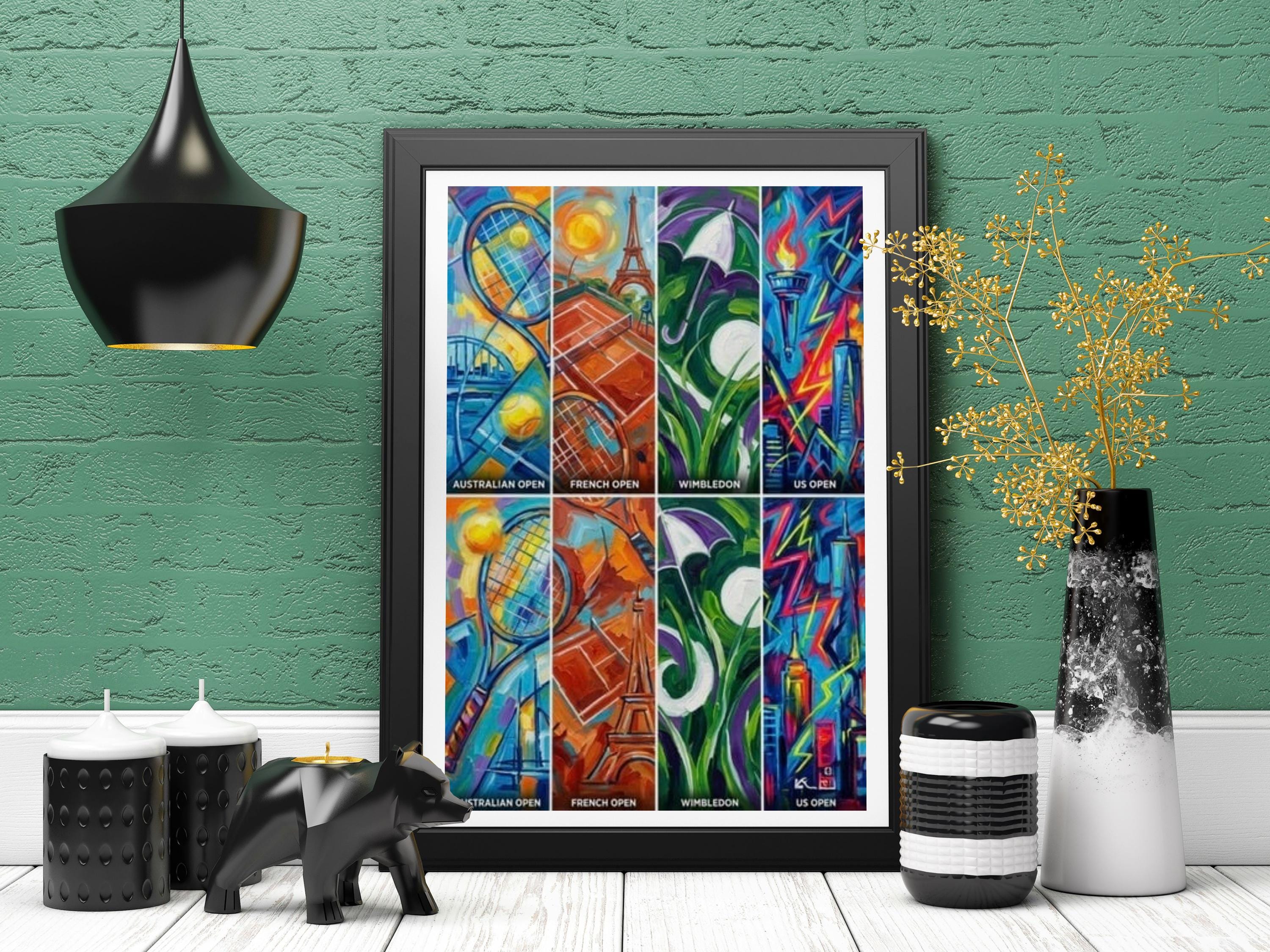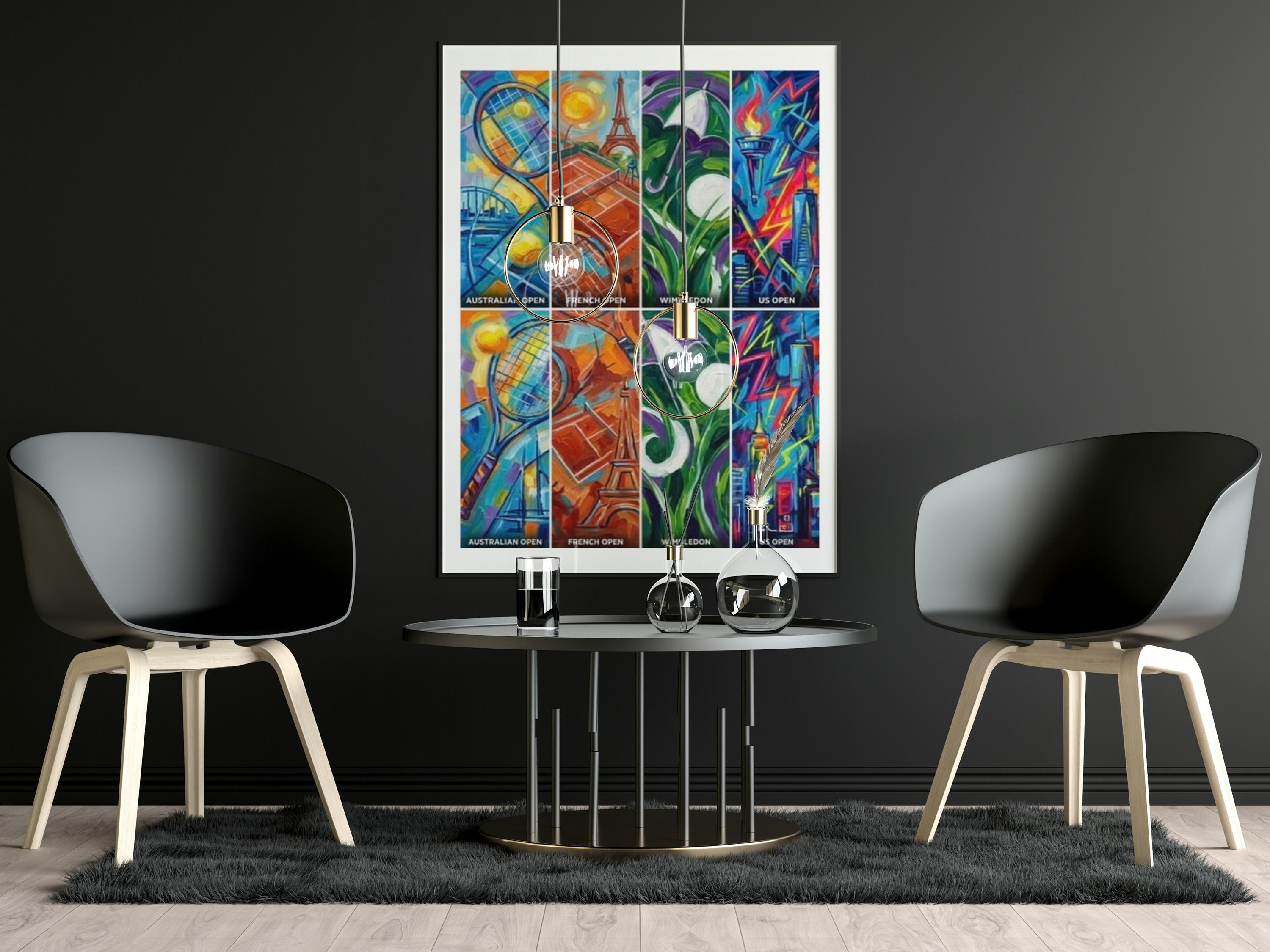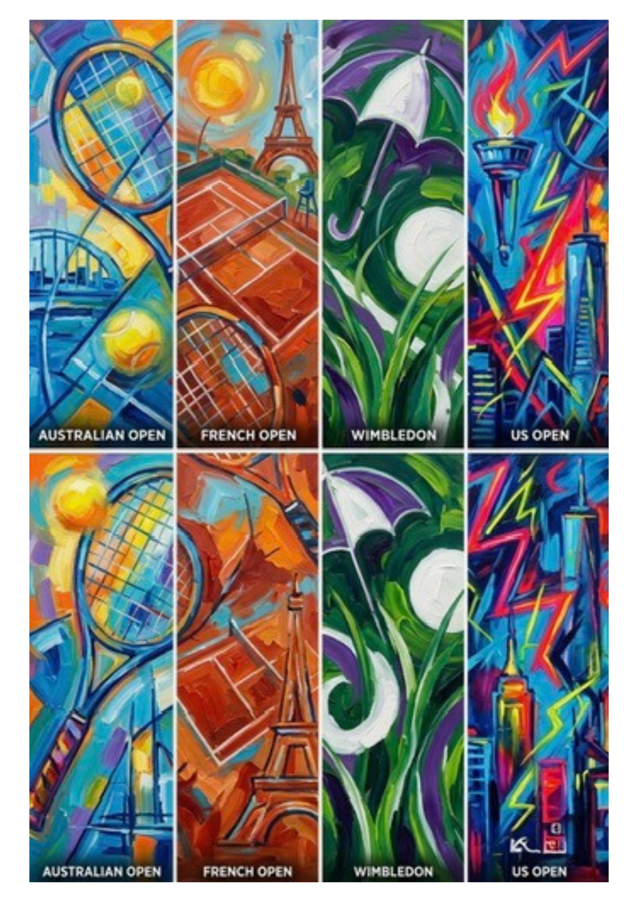 Grand Slam Tennis is a bold, contemporary art print inspired by the world’s four most iconic tennis tournaments. Each vertical panel represents a major — Australian Open, French Open, Wimbledon and US Open — interpreted through colour, motion and atmosphere rather than realism.