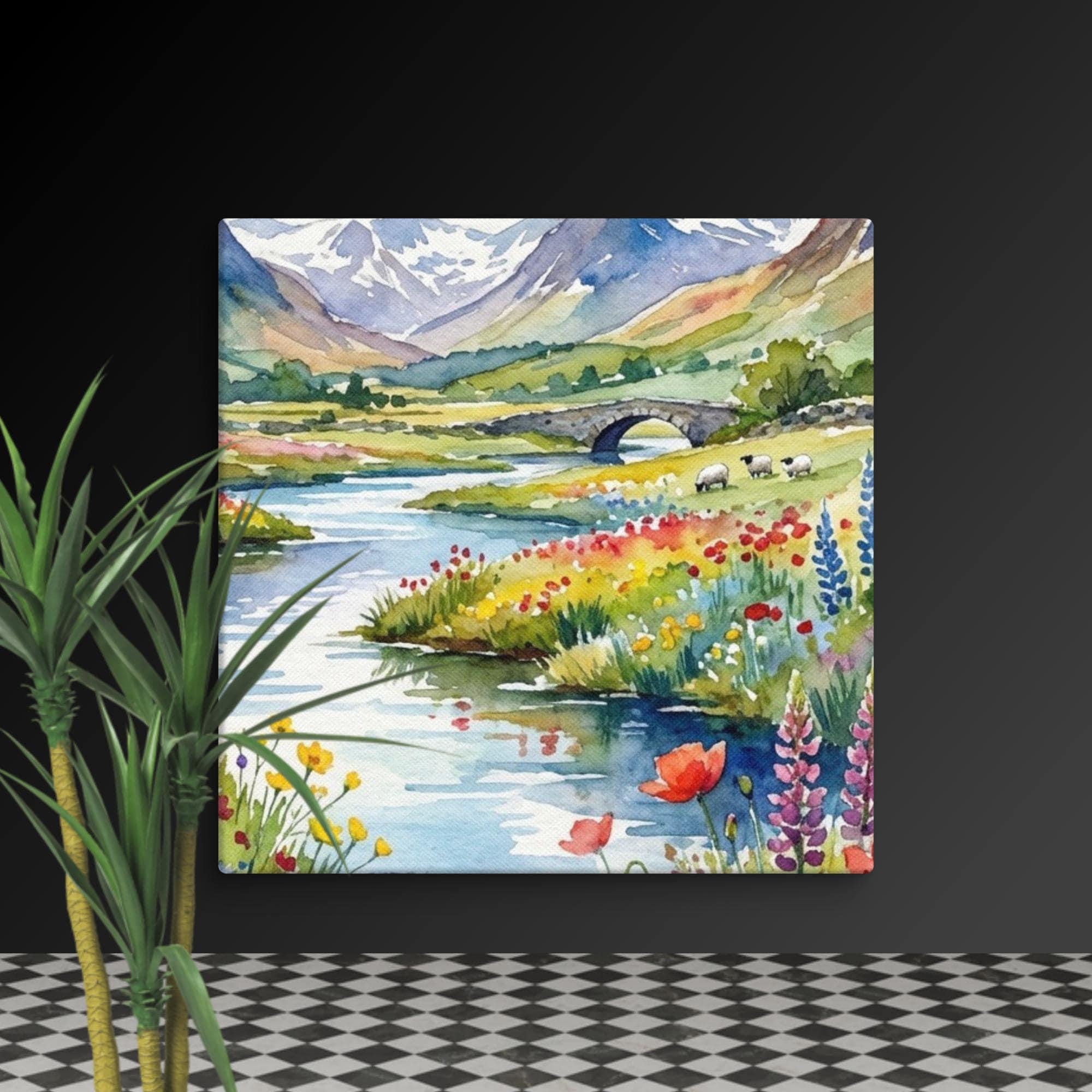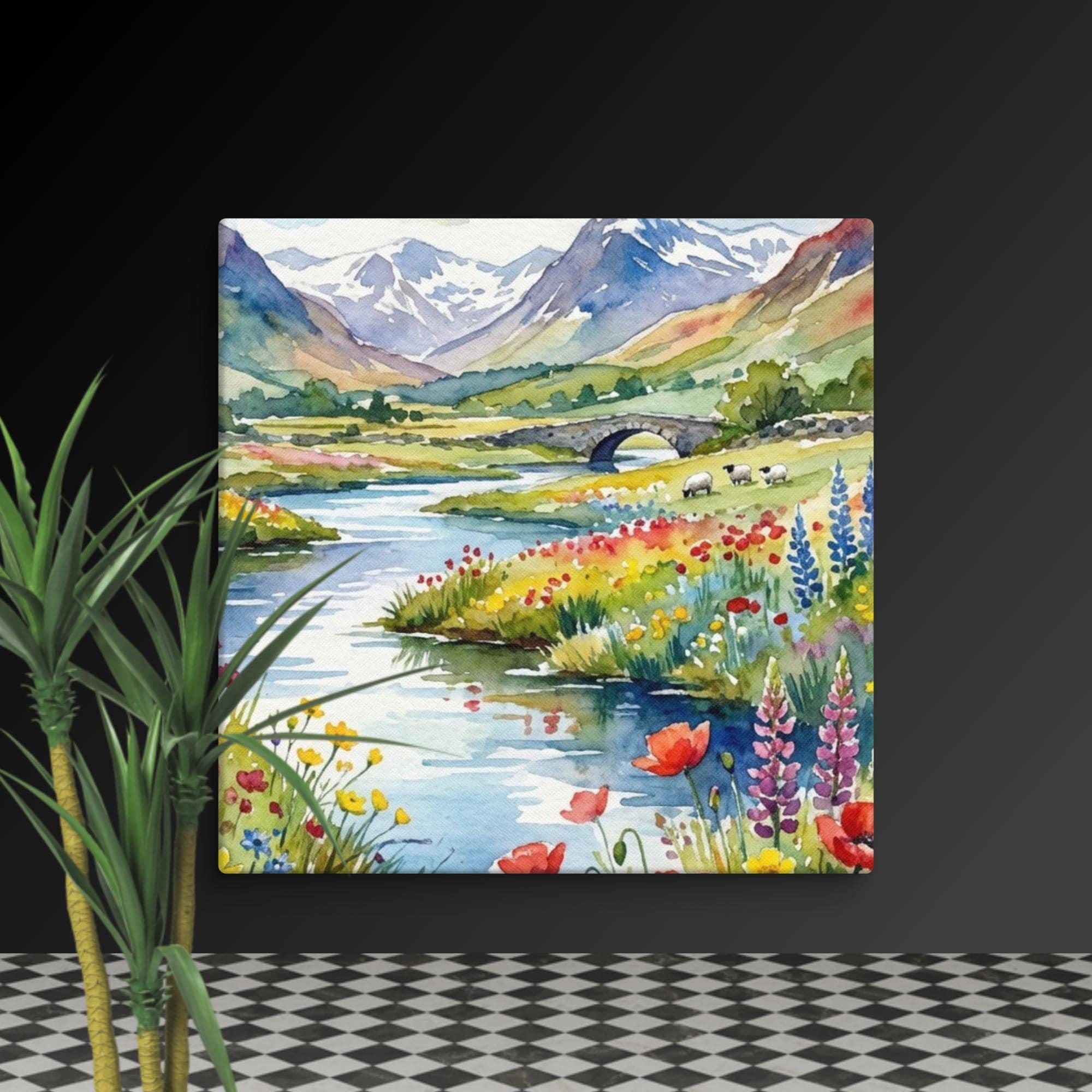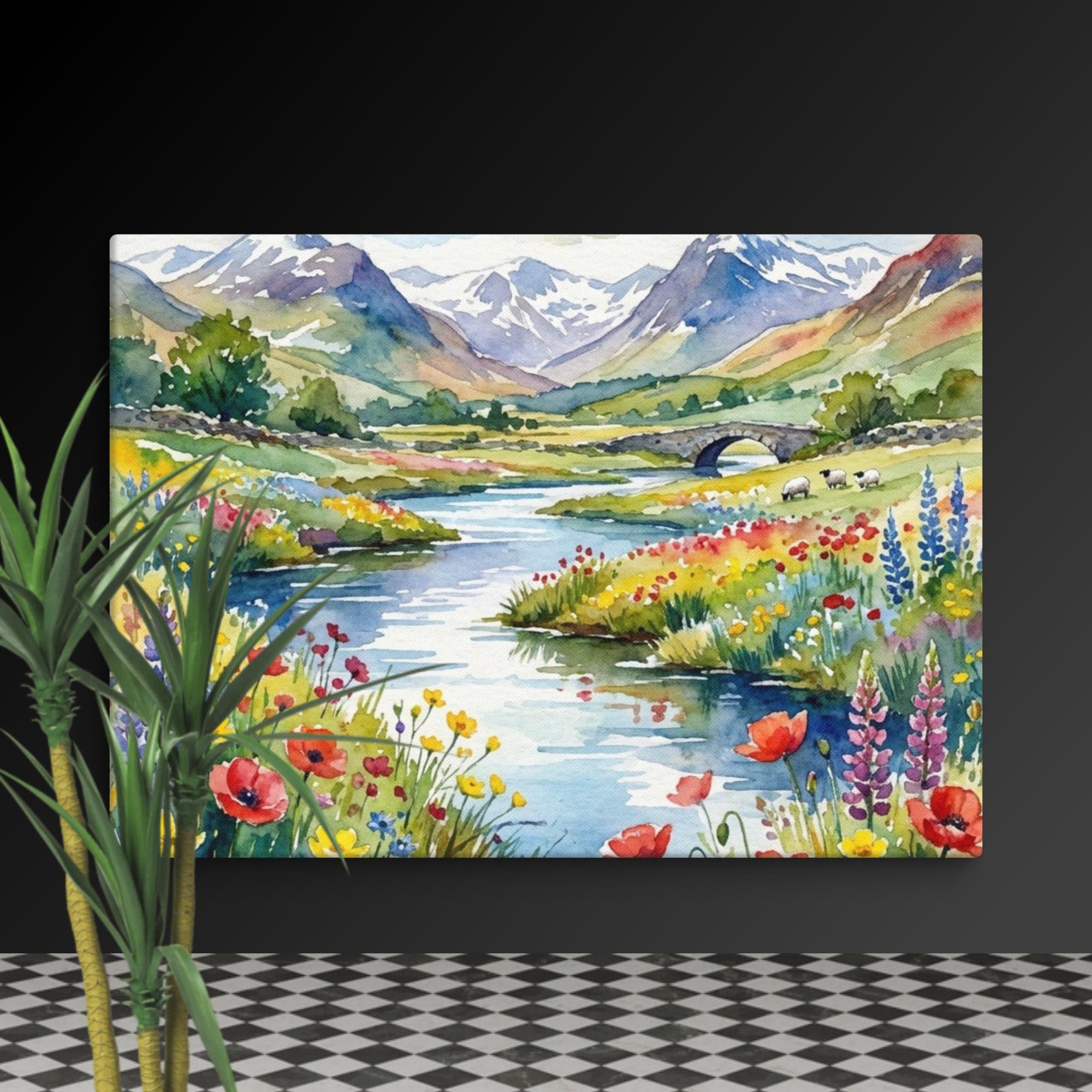 You can bring a peaceful touch of the countryside into your home with this beautiful wildflowers canvas featuring a highland wall print inspired by the Scottish landscape. This watercolour flowers artwork showcases a meandering river, a classic stone bridge, and distant mountain wall arts, surrounded by vibrant wildflower meadow te and floral wall decor details.