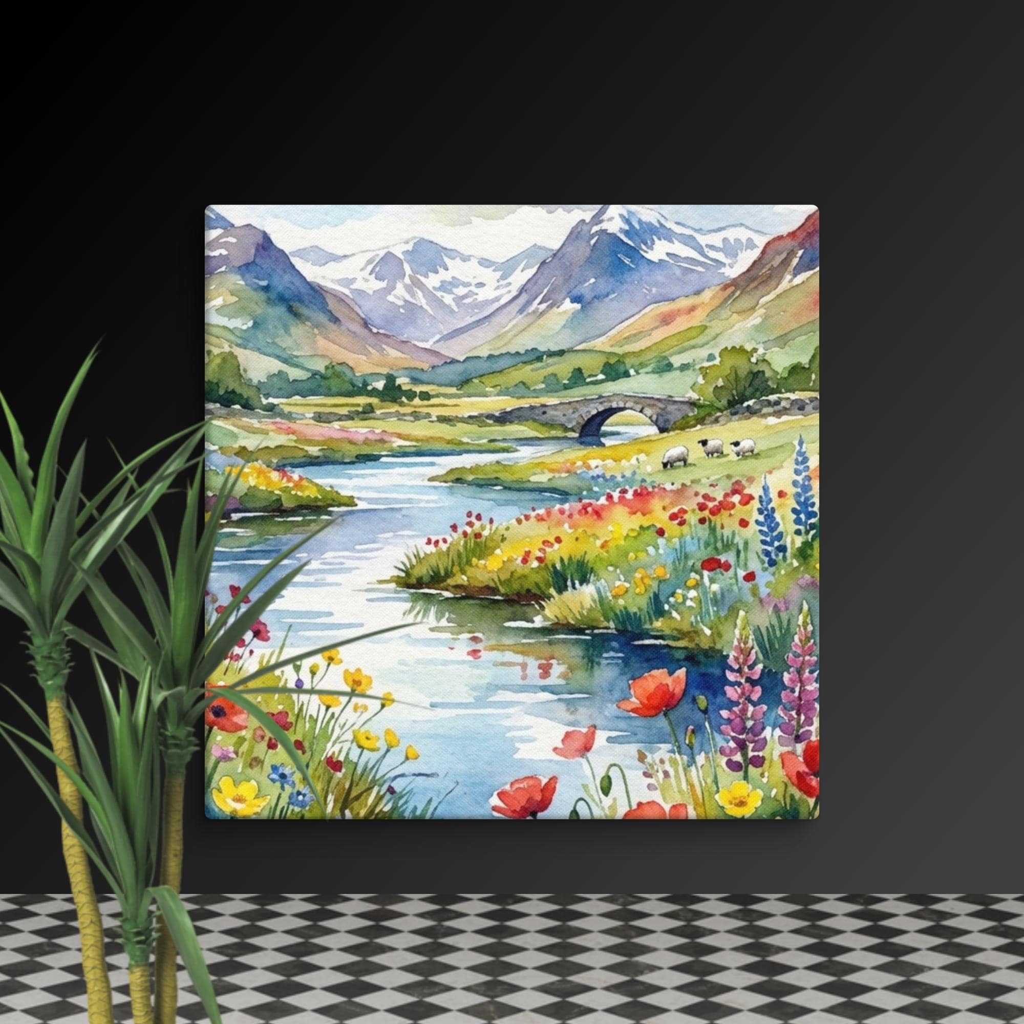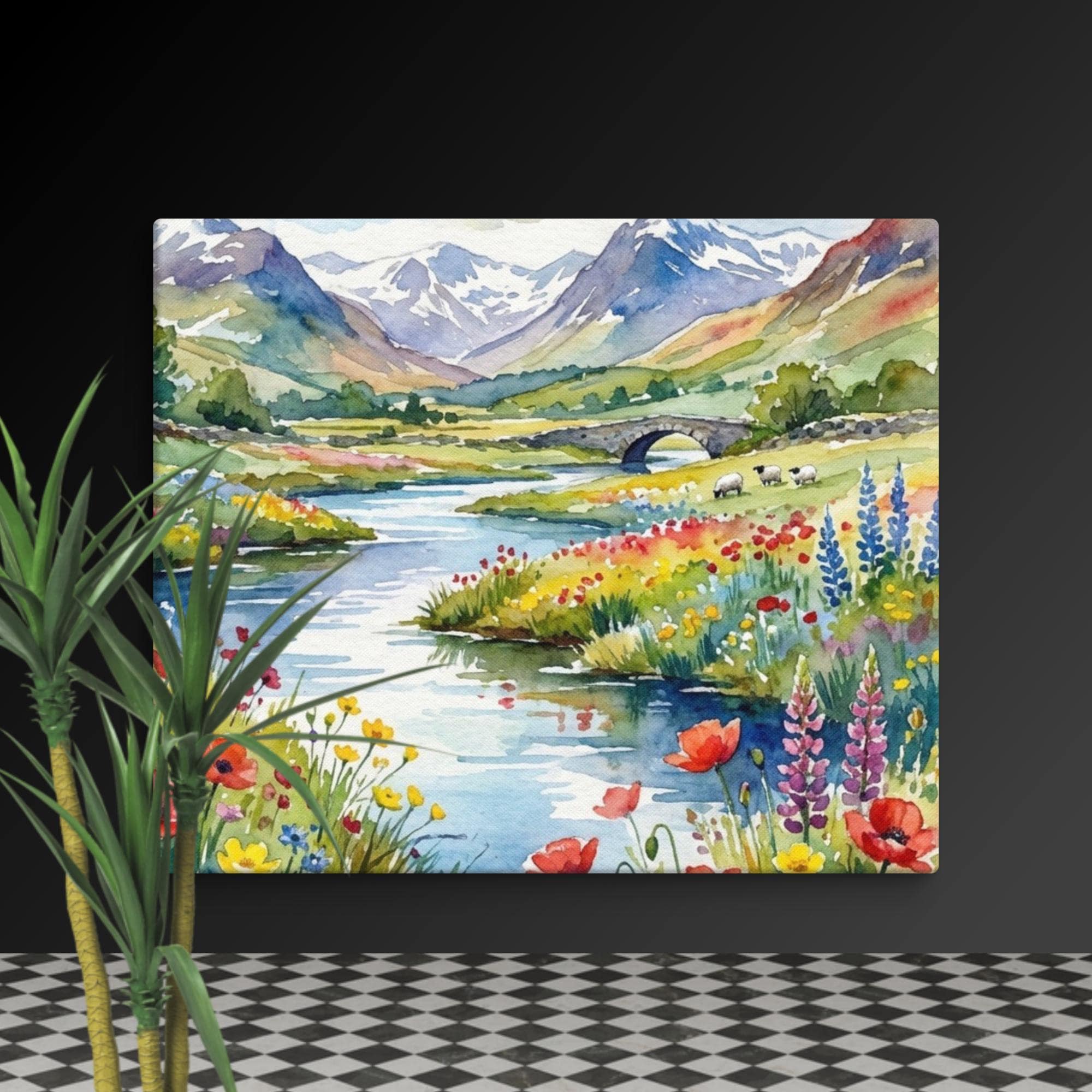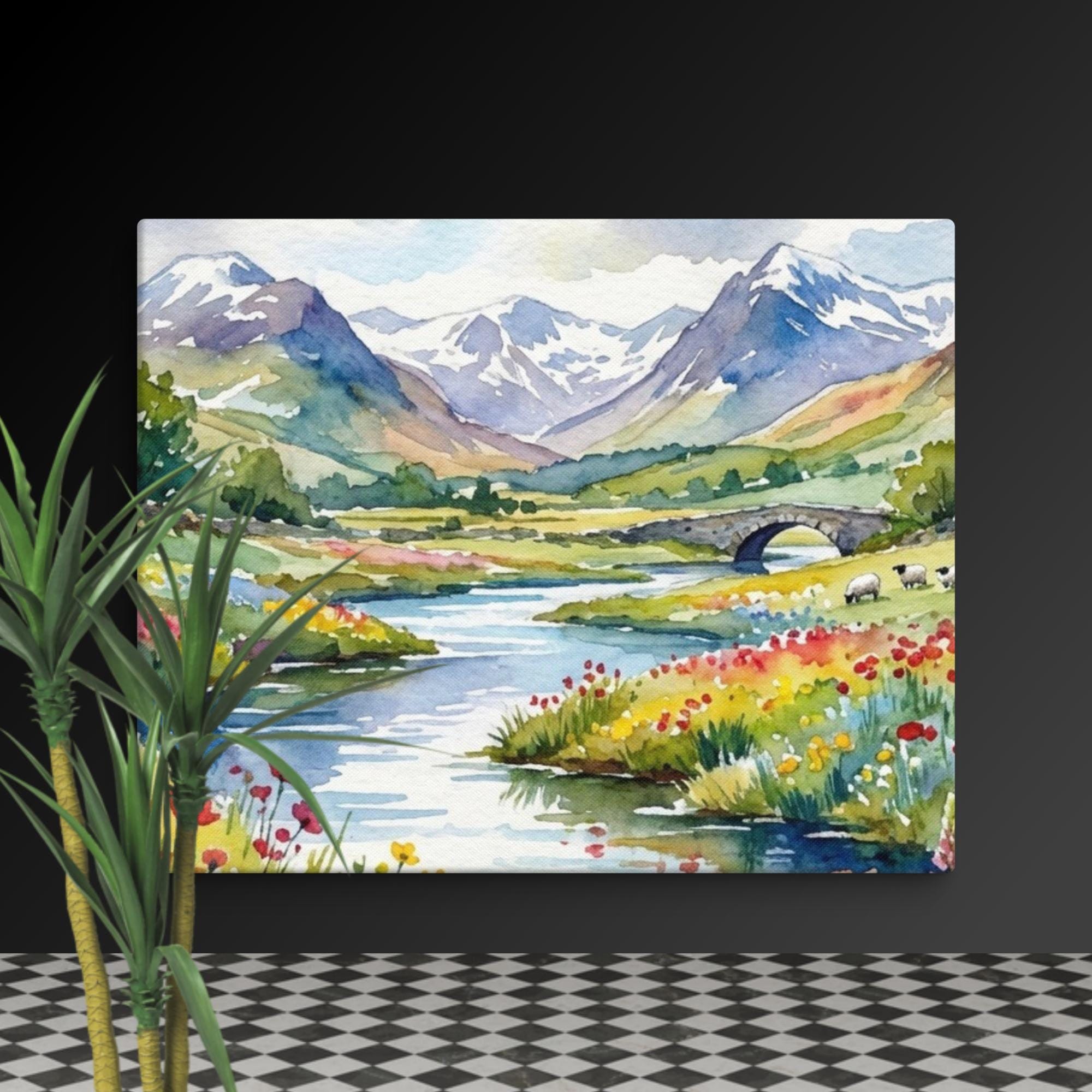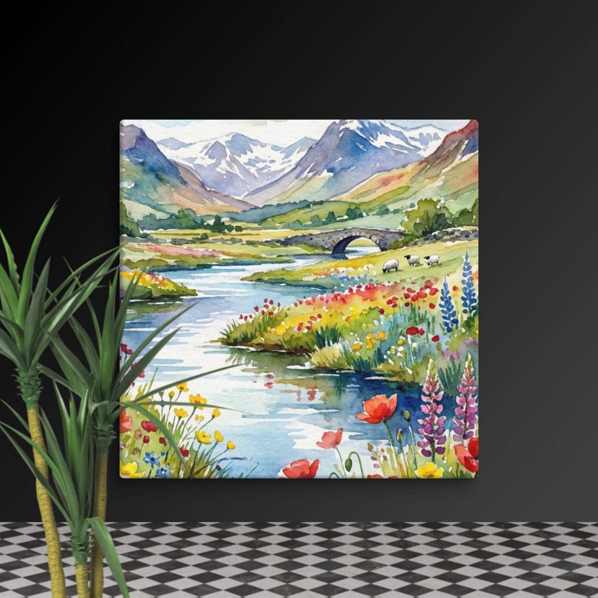 You can bring a peaceful touch of the countryside into your home with this beautiful wildflowers canvas featuring a highland wall print inspired by the Scottish landscape. This watercolour flowers artwork showcases a meandering river, a classic stone bridge, and distant mountain wall arts, surrounded by vibrant wildflower meadow te and floral wall decor details.