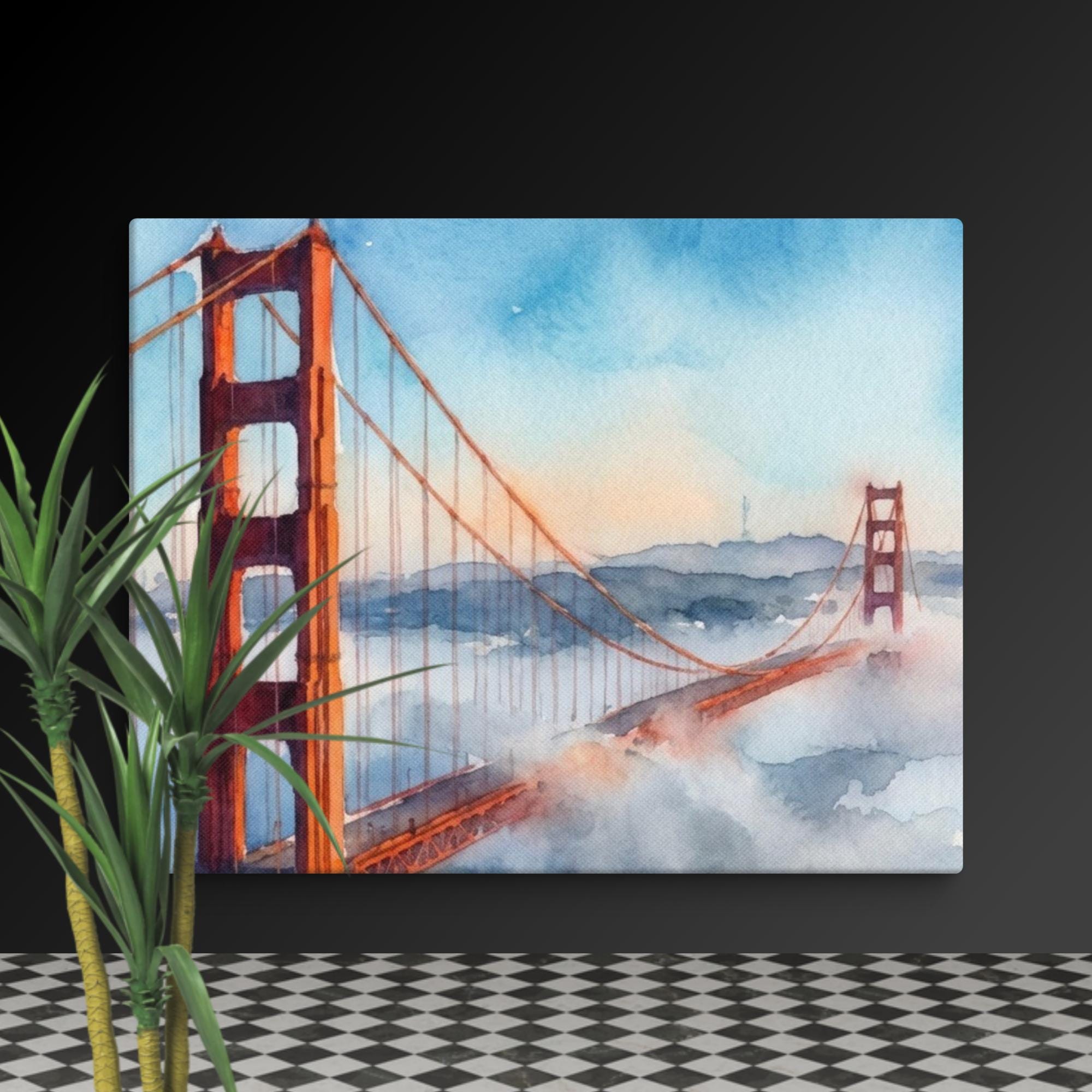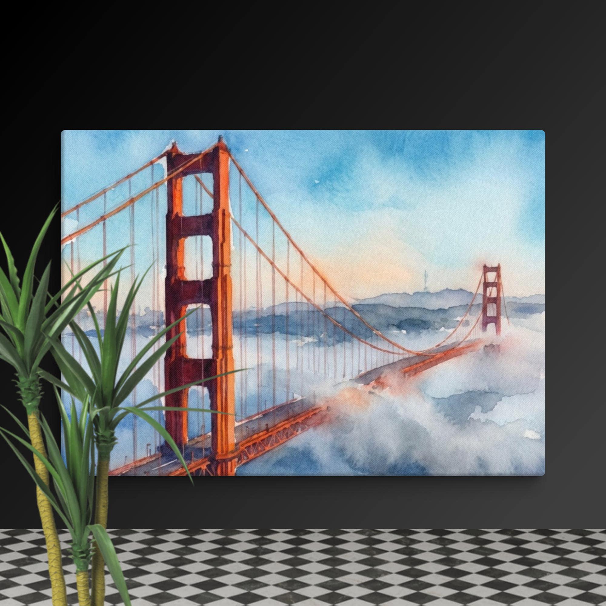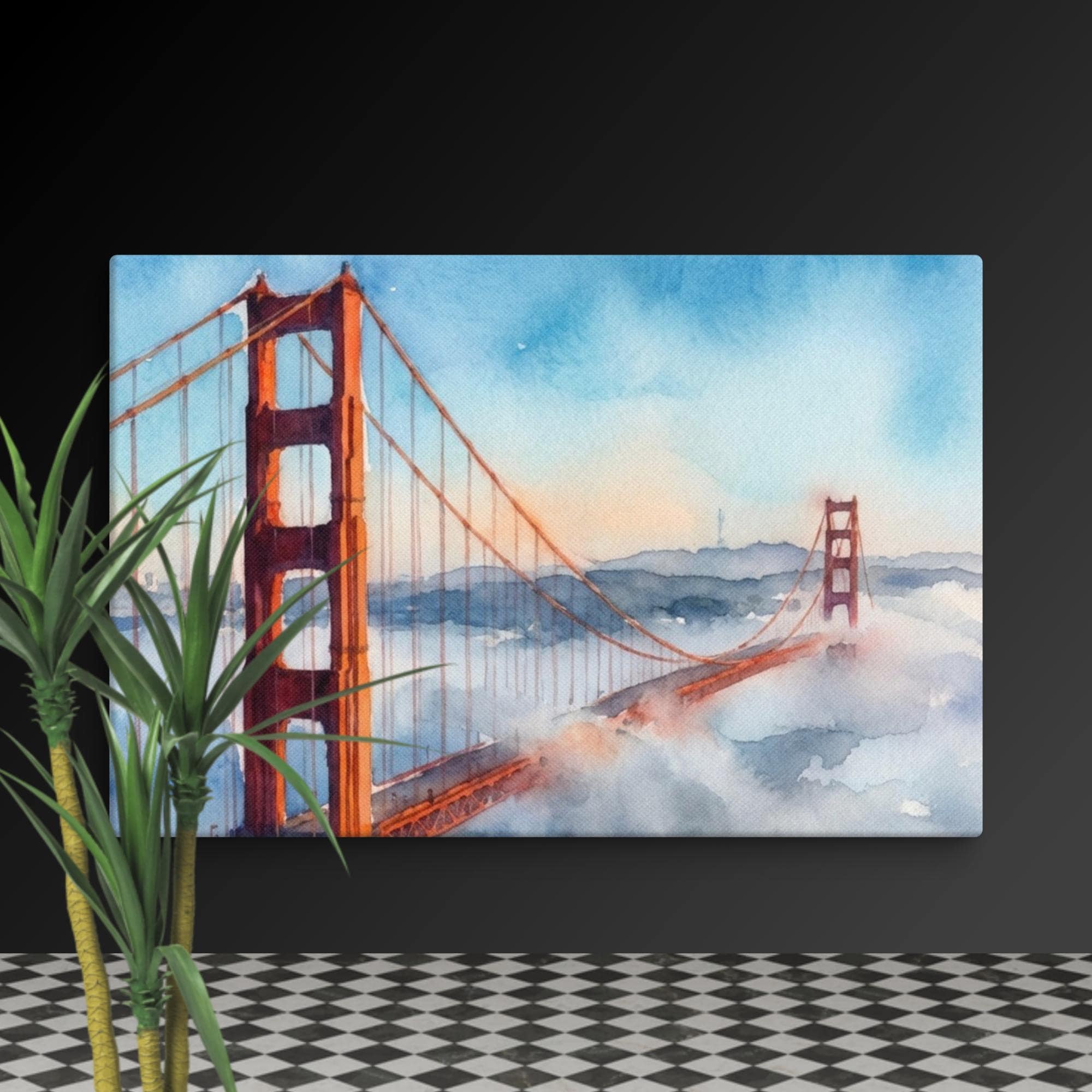 Add a touch of California coast charm to your space with this bridge watercolor canvas wall art. This watercolor print captures the famous Golden Gate Bridge, its red towers rising through soft coastal fog—an iconic landmark painting that brings the relaxing vibes of the San Francisco arts scene right into your home.