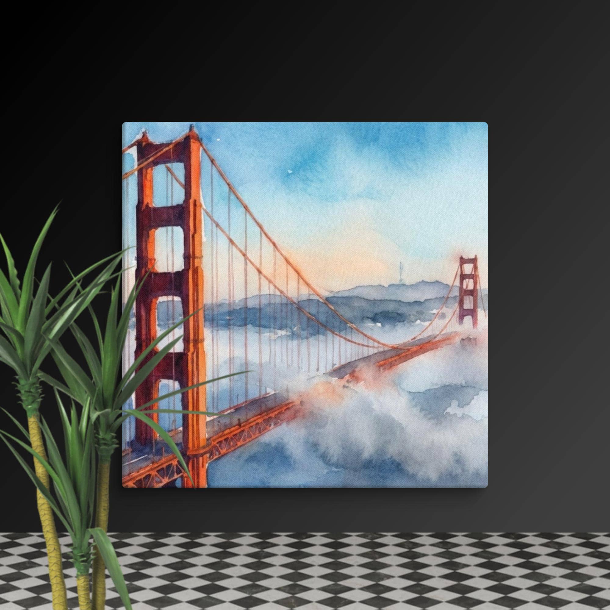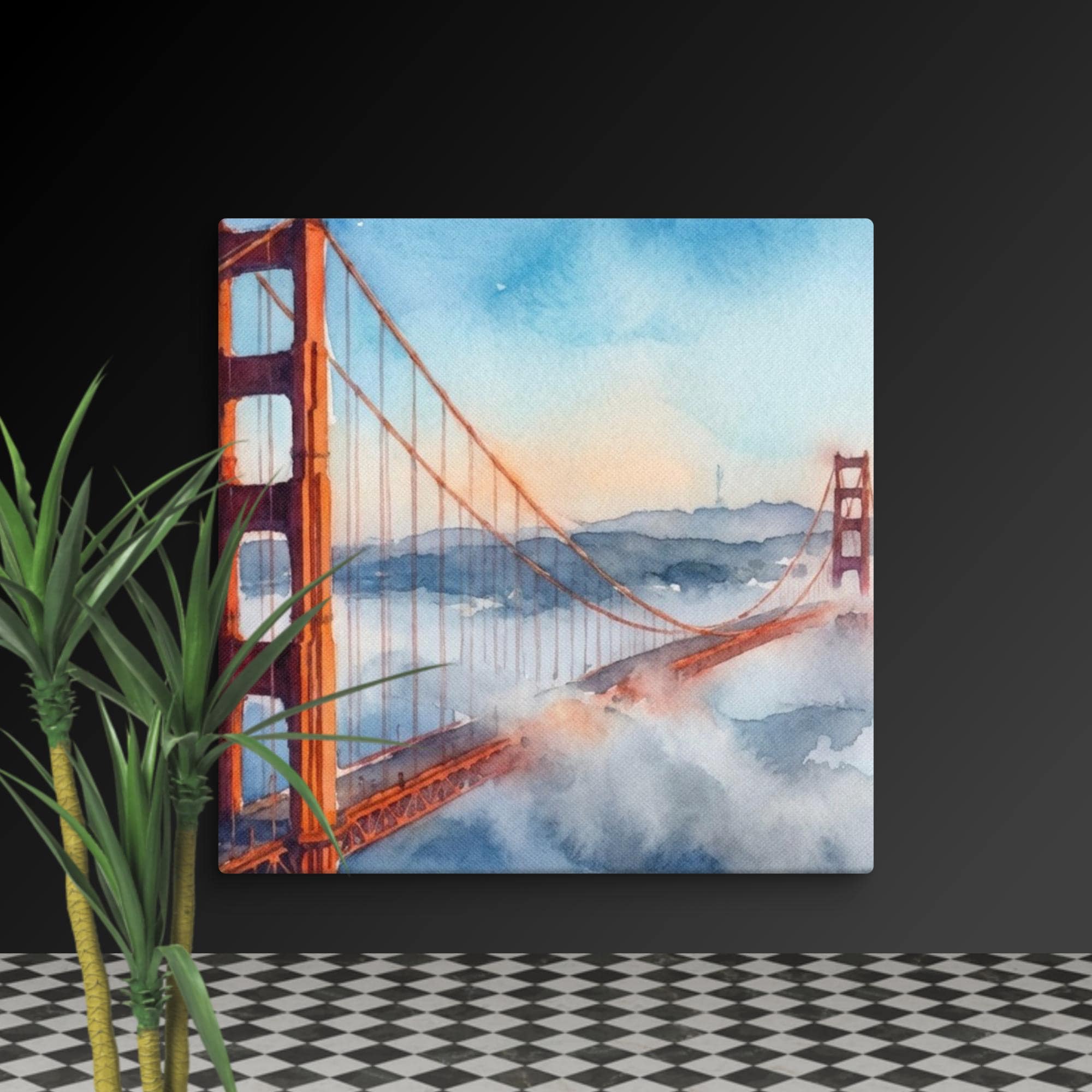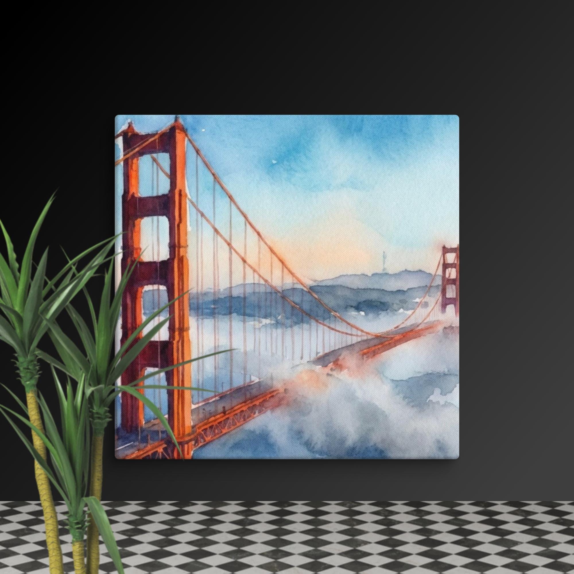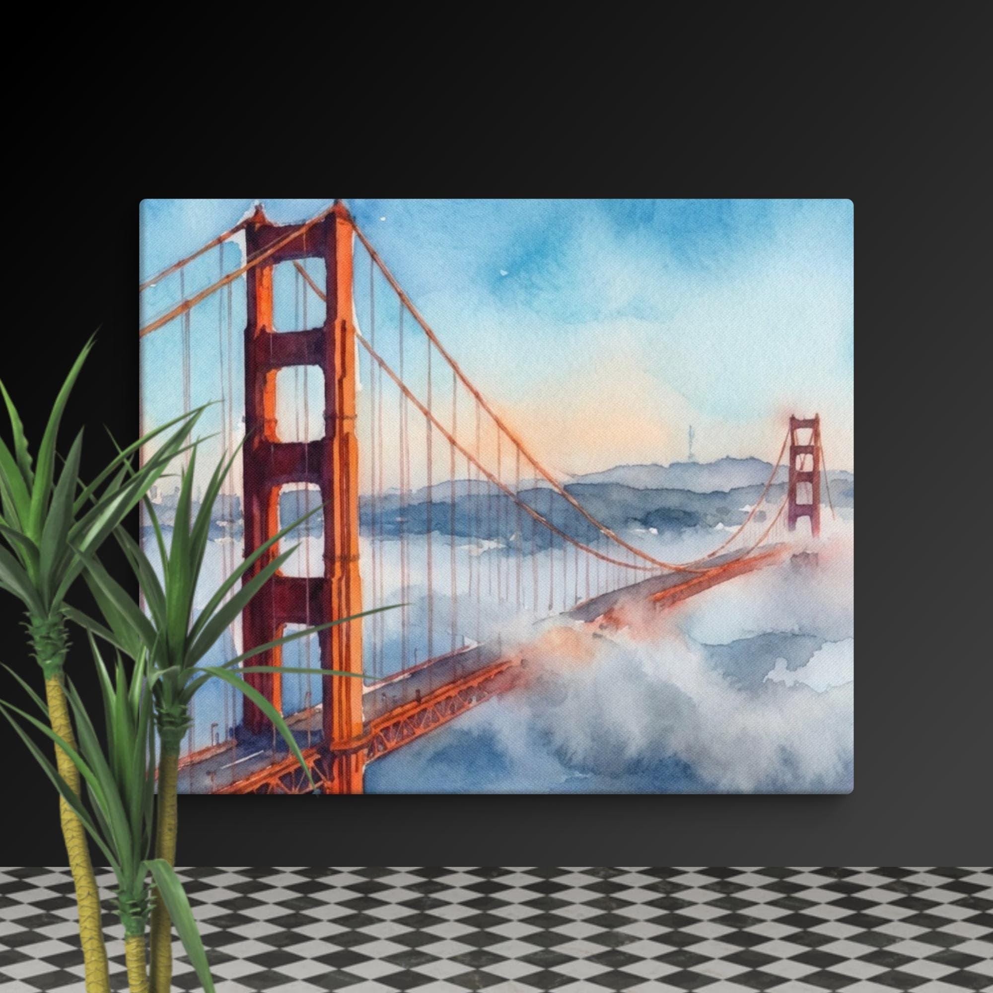Add a touch of California coast charm to your space with this bridge watercolor canvas wall art. This watercolor print captures the famous Golden Gate Bridge, its red towers rising through soft coastal fog—an iconic landmark painting that brings the relaxing vibes of the San Francisco arts scene right into your home.