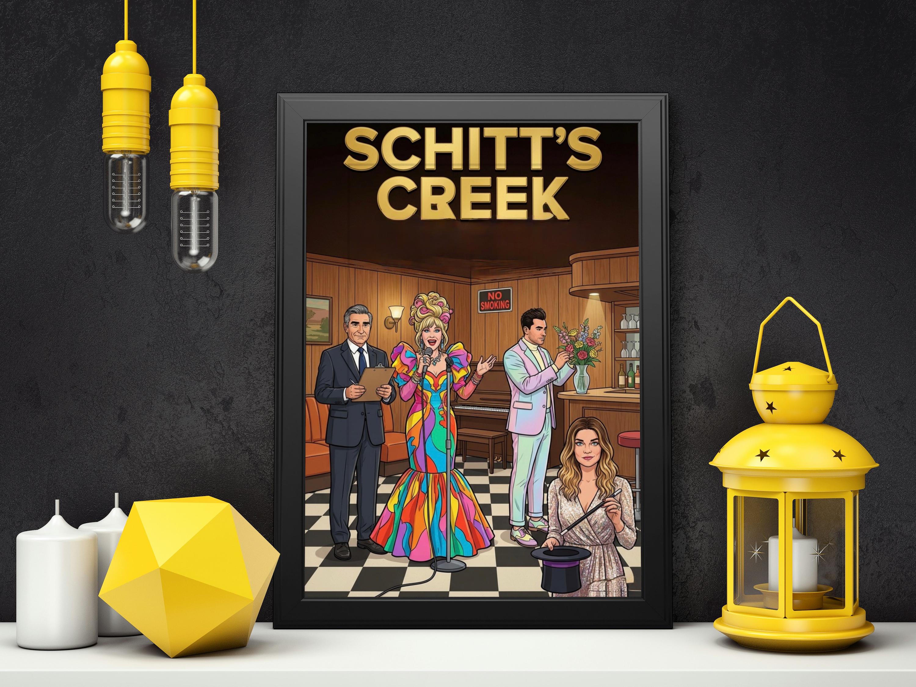 Turn your space into a celebration of iconic TV moments with this Schitt’s Creek inspired colourful art print. The vibrant motel scene features the Rose family, including the unforgettable duo Dan Levy Creek and Catherine O'Hara, capturing all the stylish funny art and small-town charm fans love.
