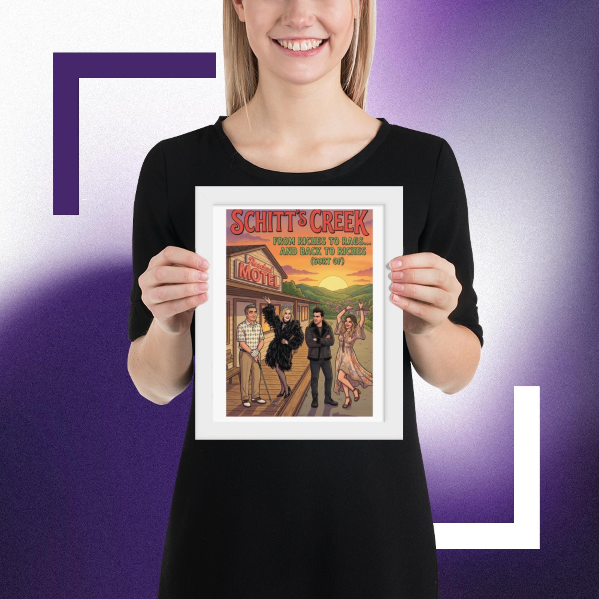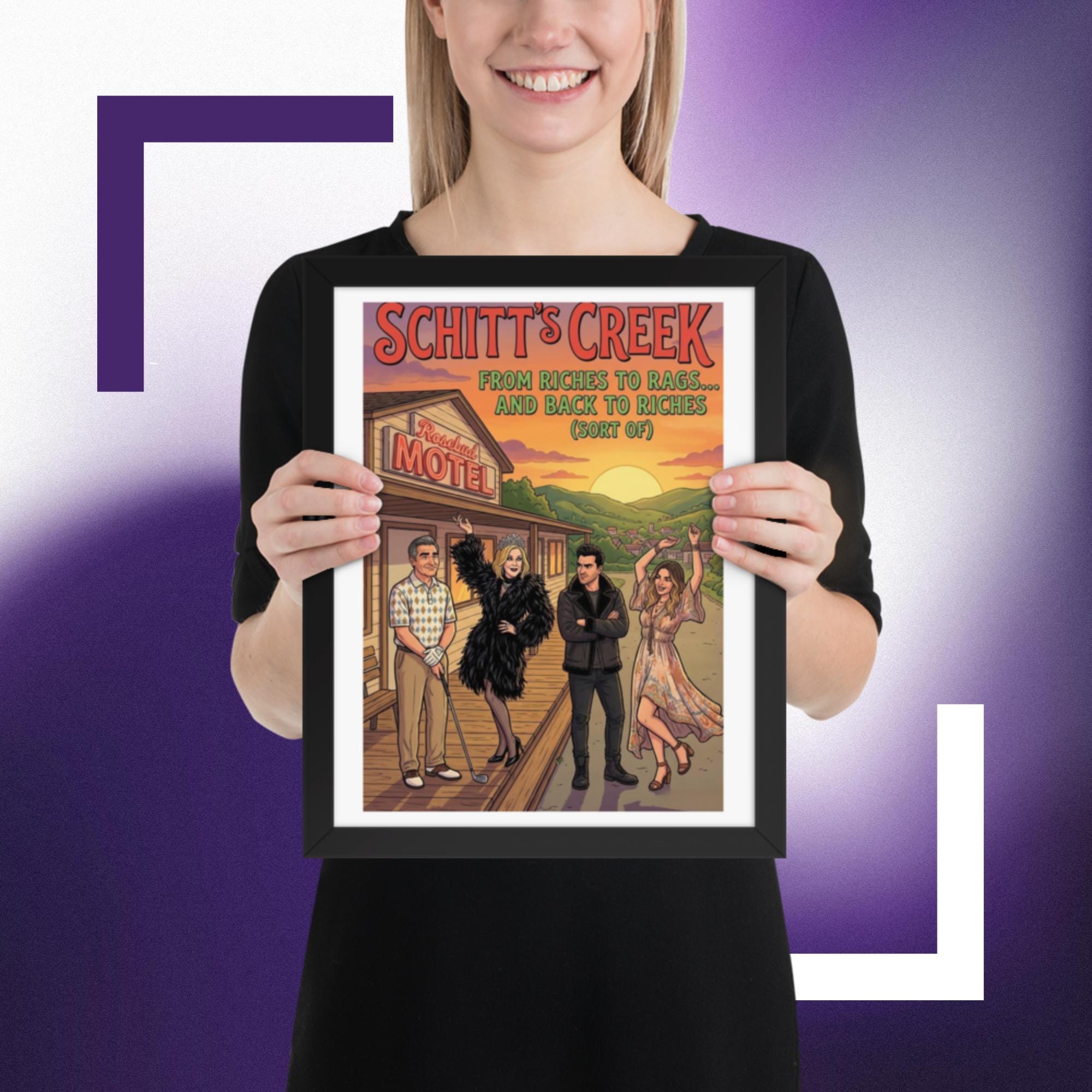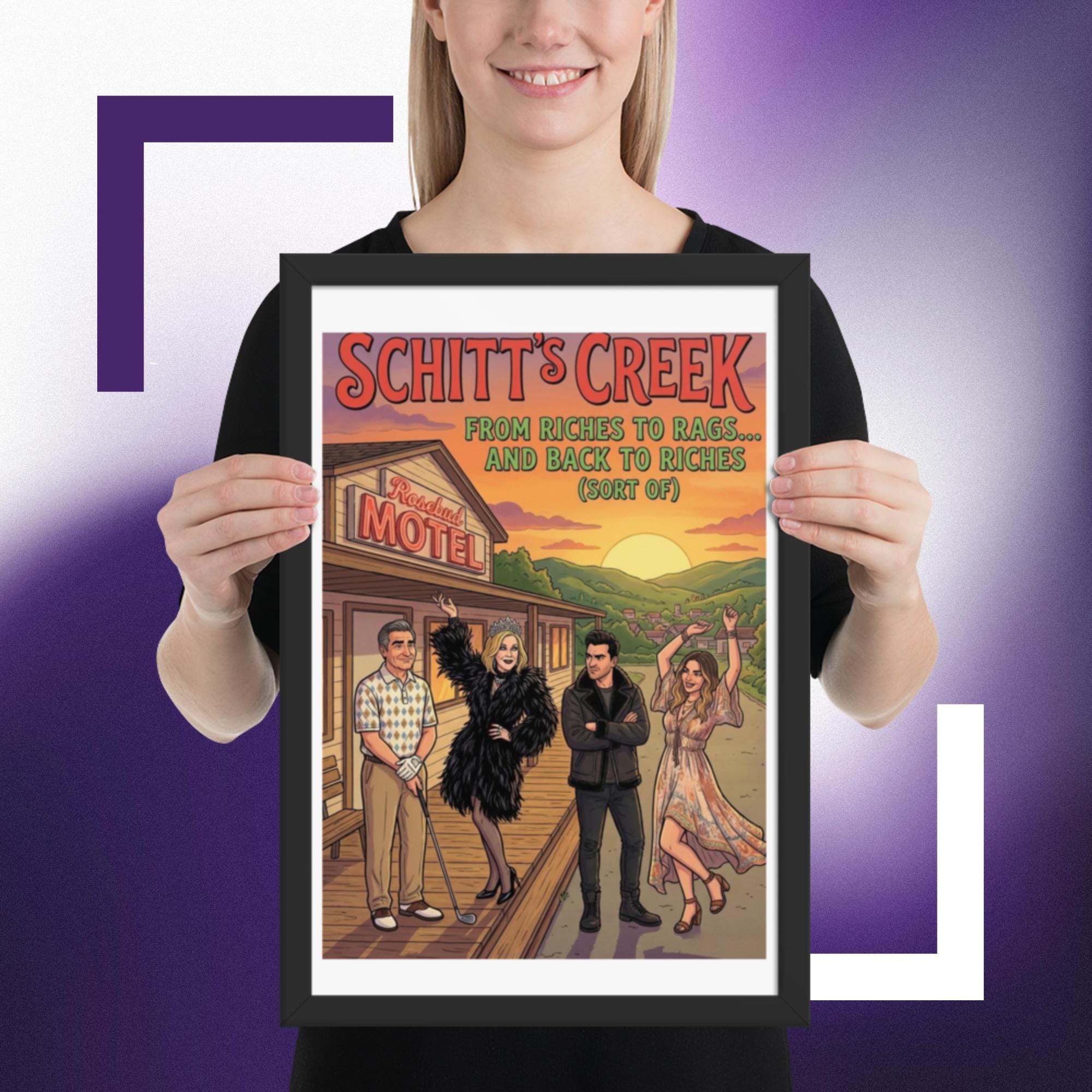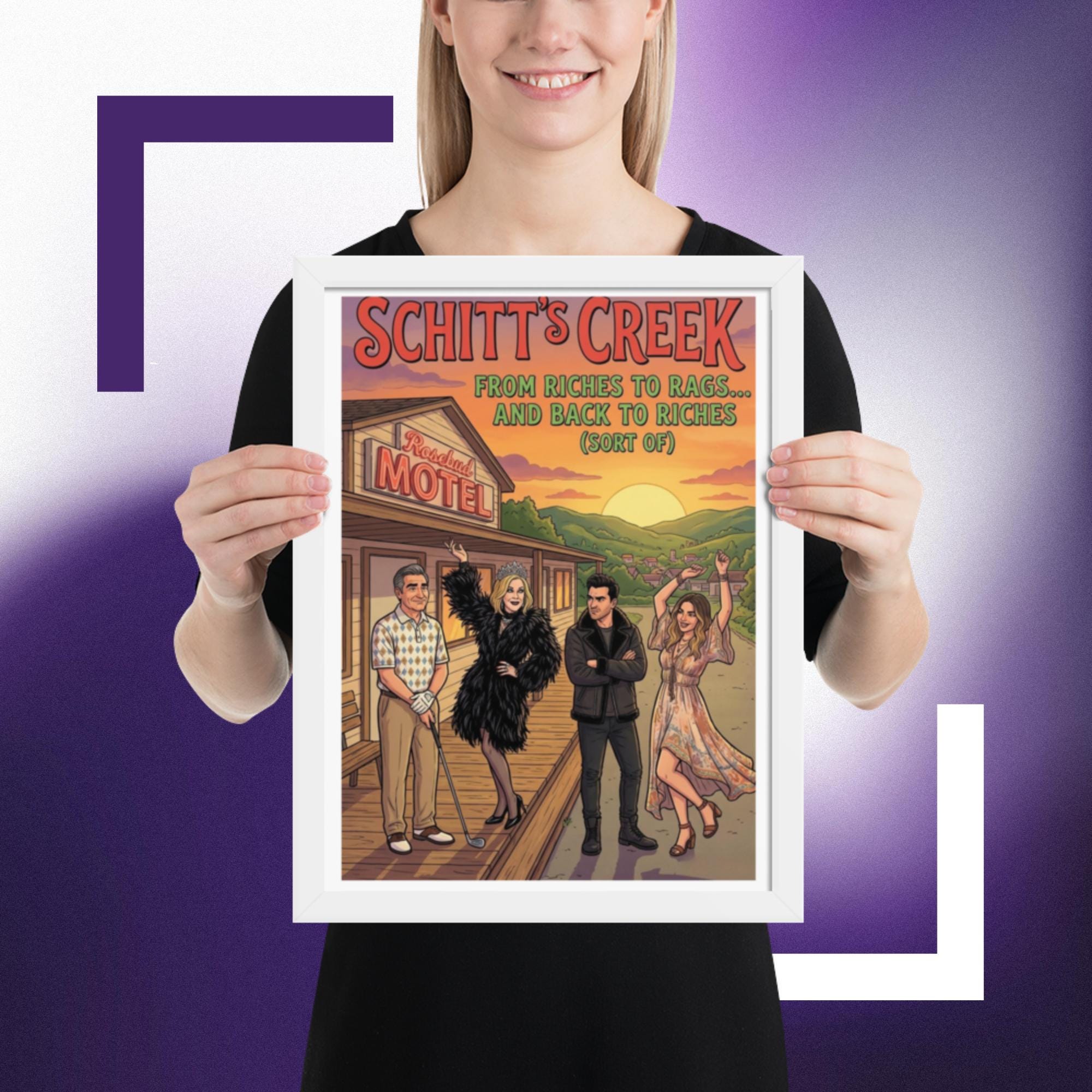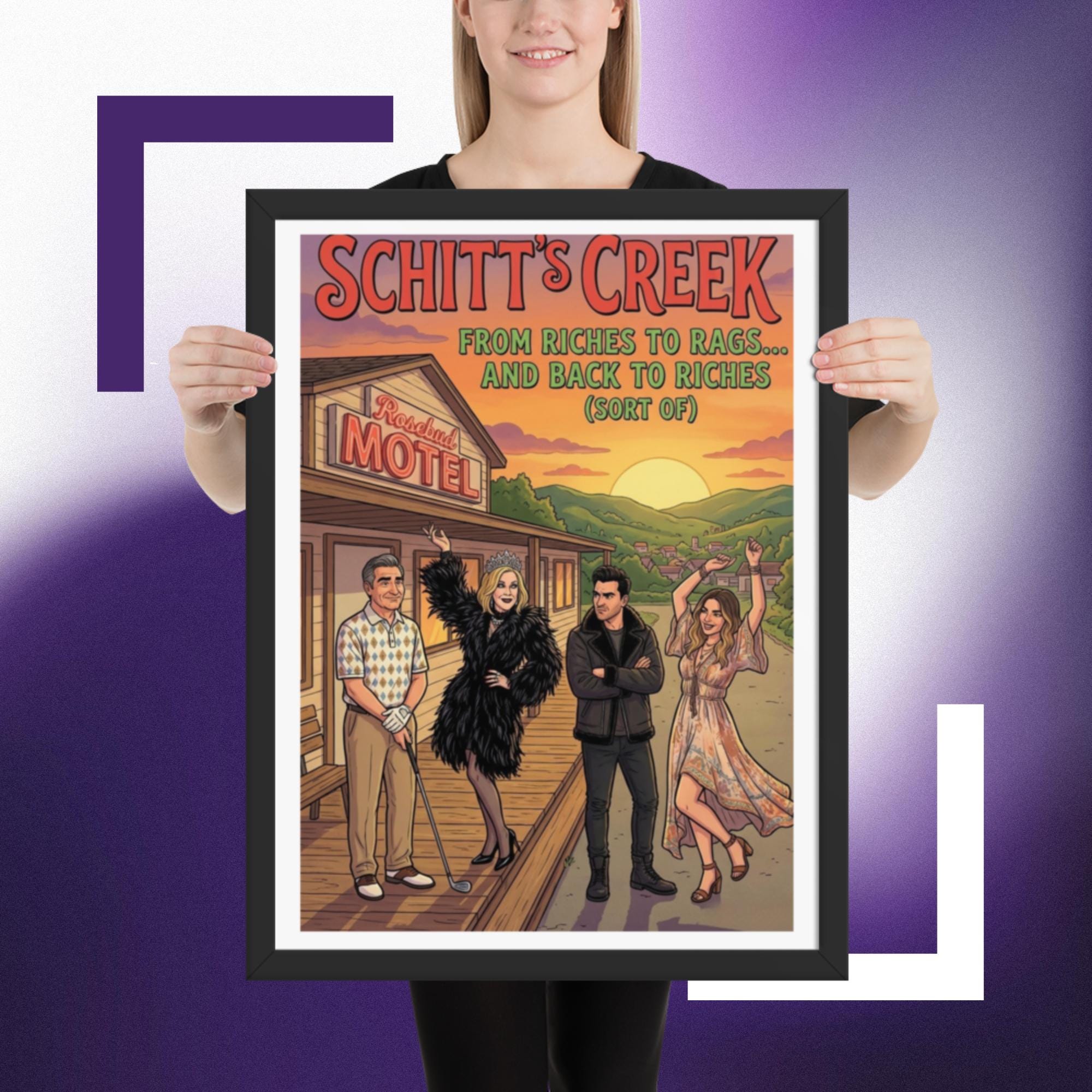 Whether you’re starting a new collection of pop culture decor or adding the final touch to your tv show wall art corner, this Rosebud Motel print fits right in and keeps your favorite scenes close.Celebrate the unforgettable journey of the Rose family with this vibrant Schitt’s Creek inspired Rosebud Motel poster print. Featuring the iconic motel backdrop and the beloved characters in a colourful, detailed illustration, this artwork perfectly captures the humour, glamour, and heart of the hit comedy series.