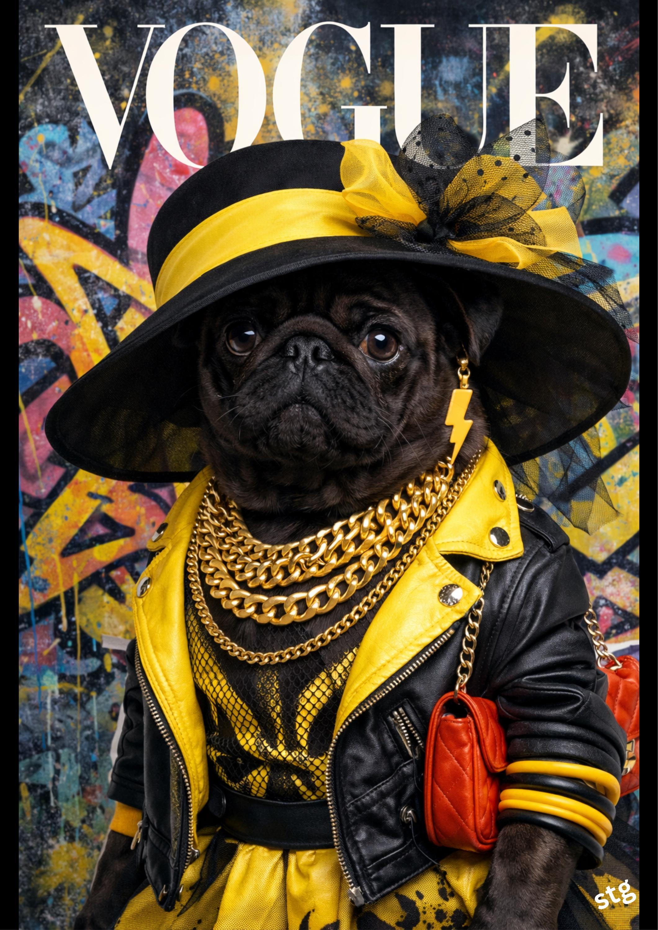 You get a punchy mix of luxury fashion, retro attitude, and playful dog art that instantly grabs attention.