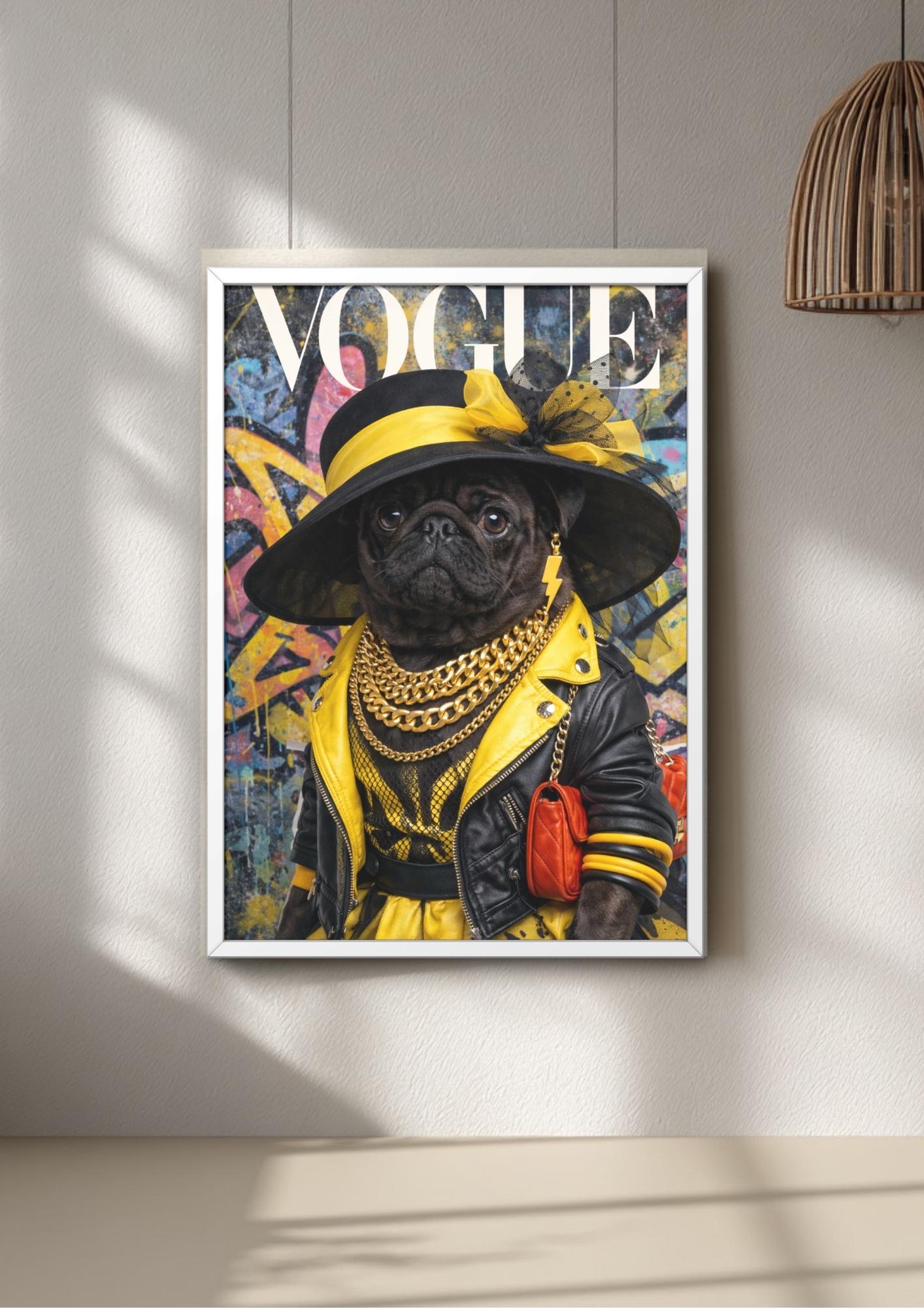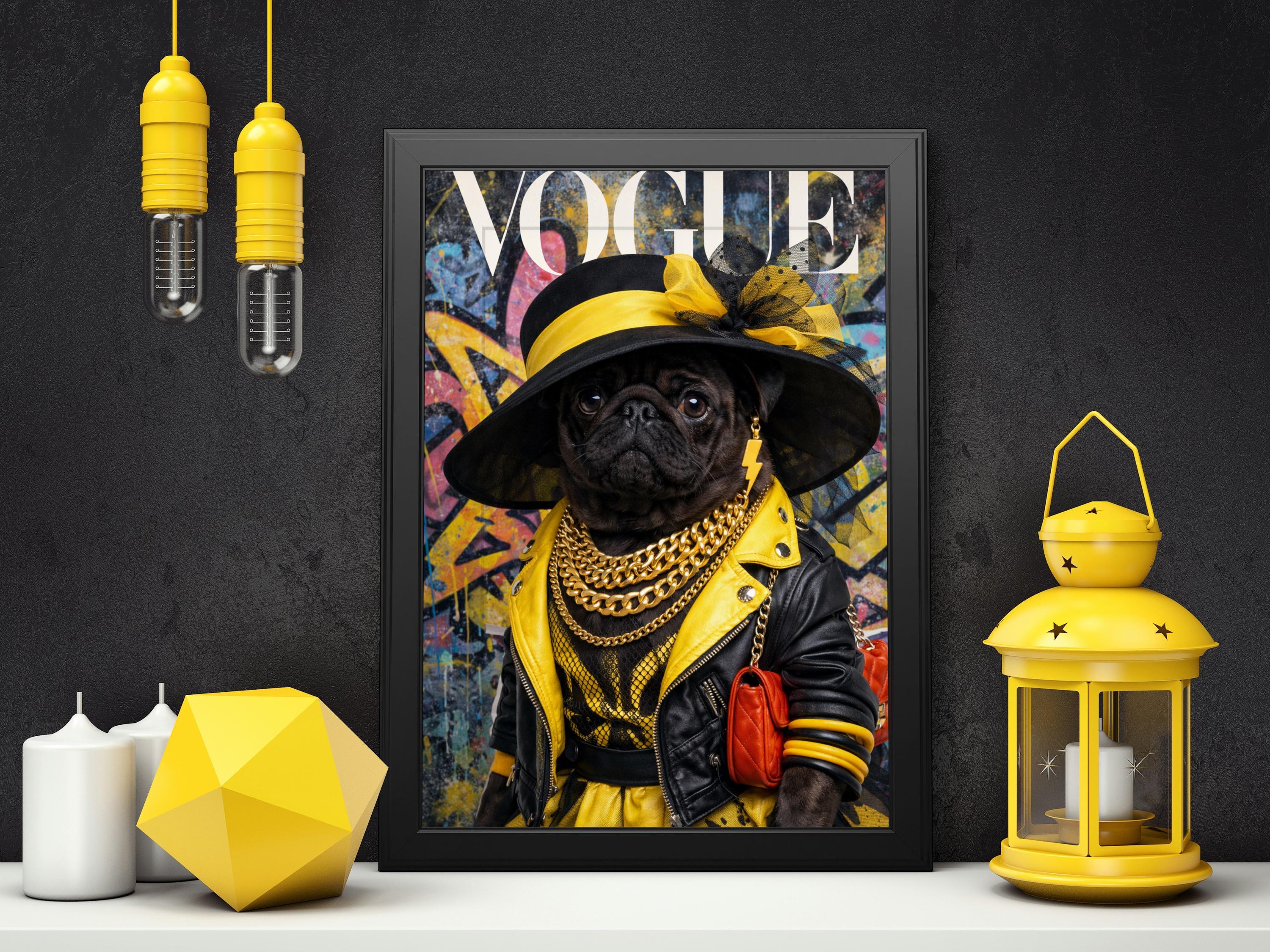 Turn your wall into a fashion runway with this 80s wall art featuring the ultimate pop art pug icon. Dressed in bold black and yellow, your stylish pug strikes a pose in front of vibrant graffiti wall art that feels straight out of an 80s city street.