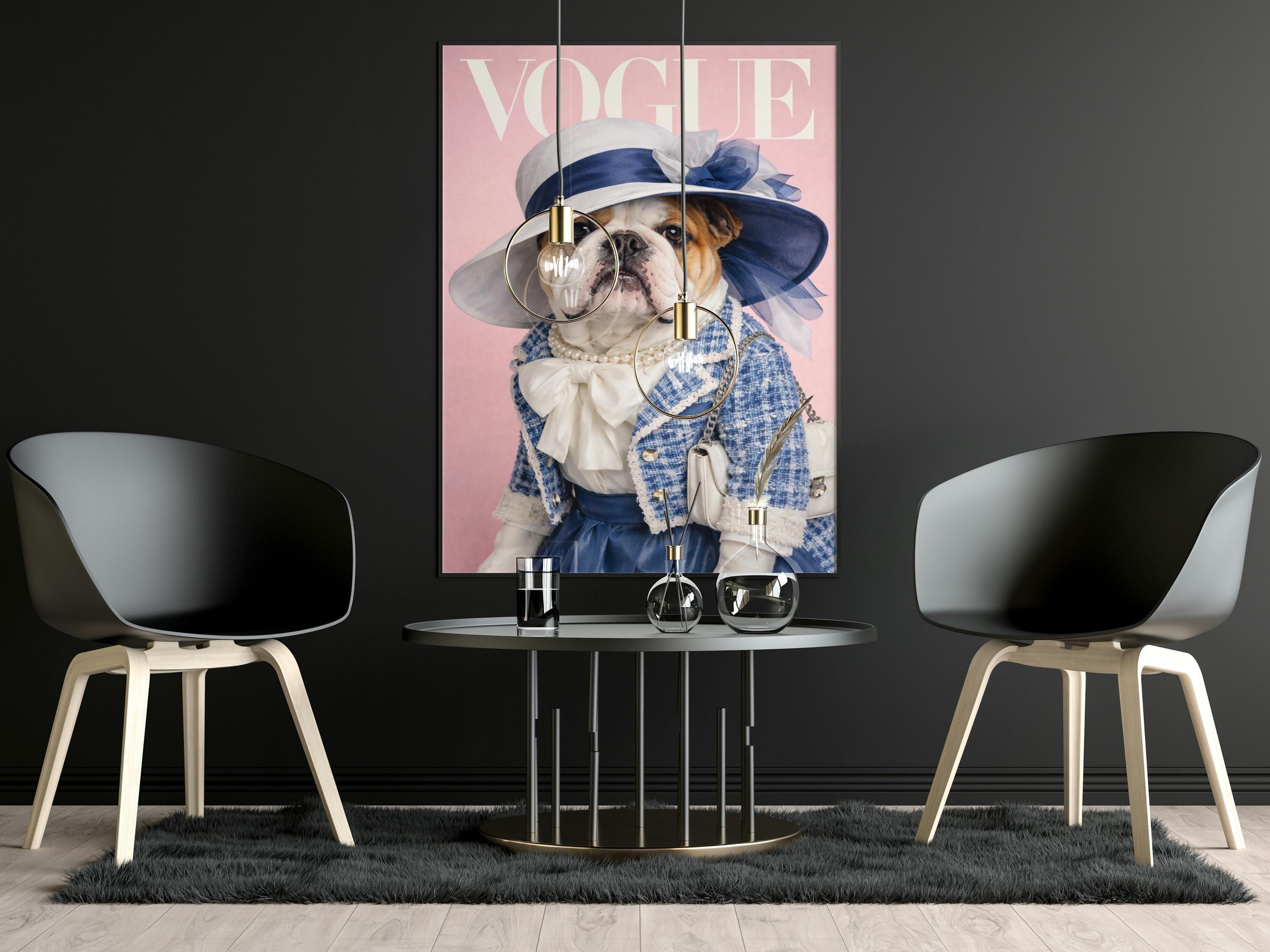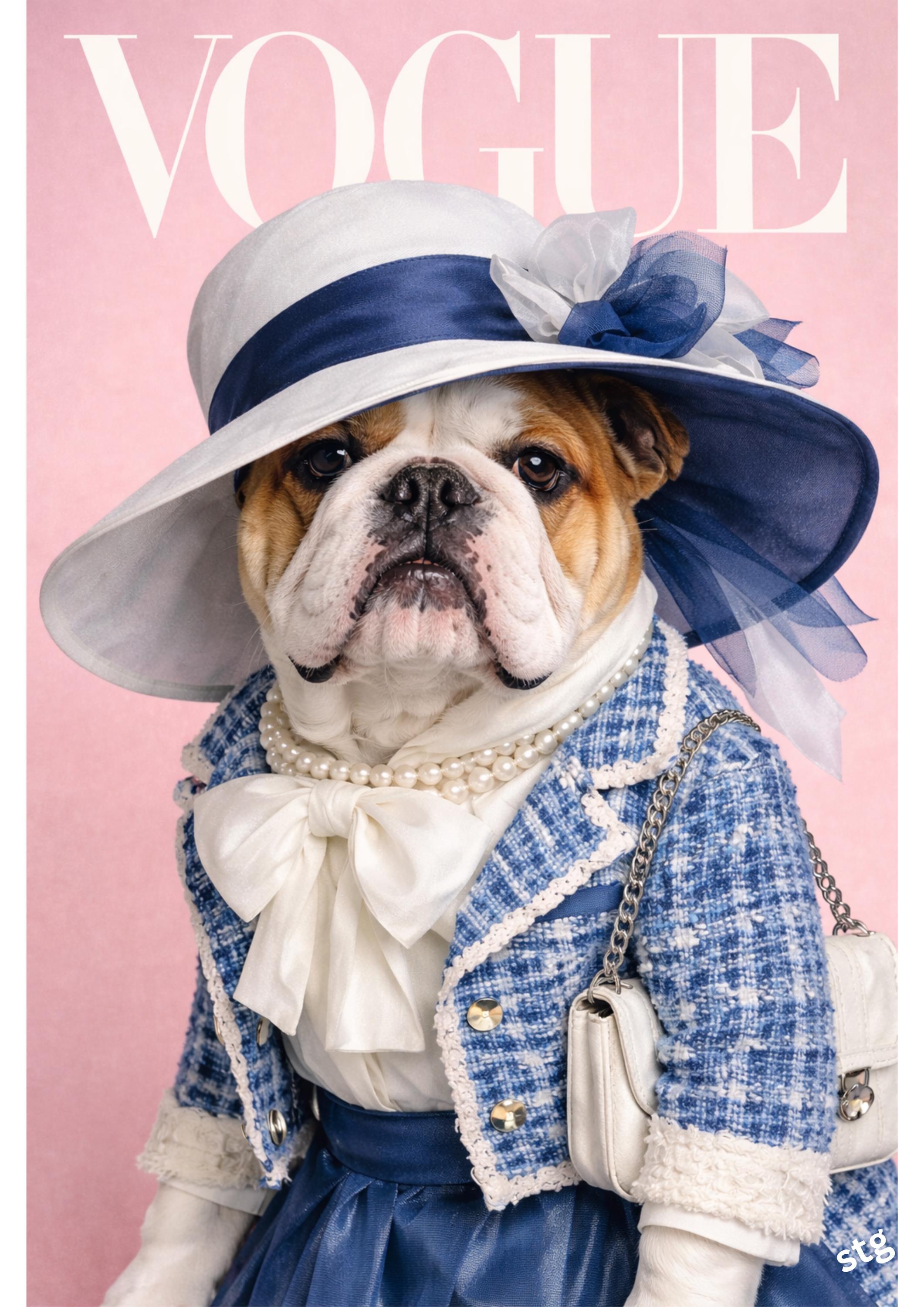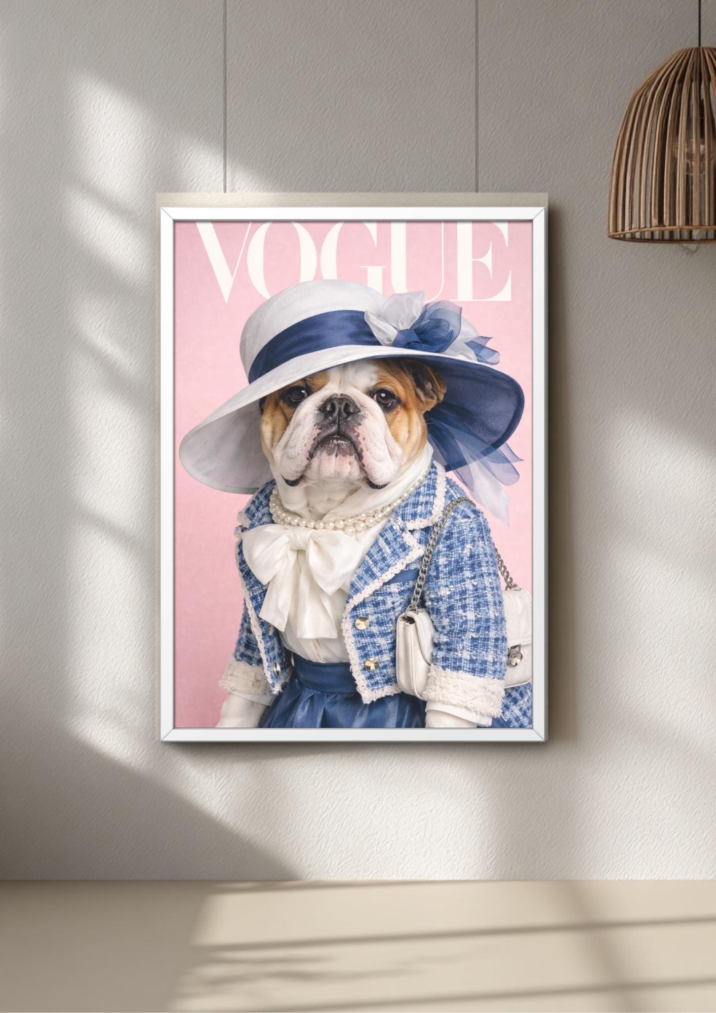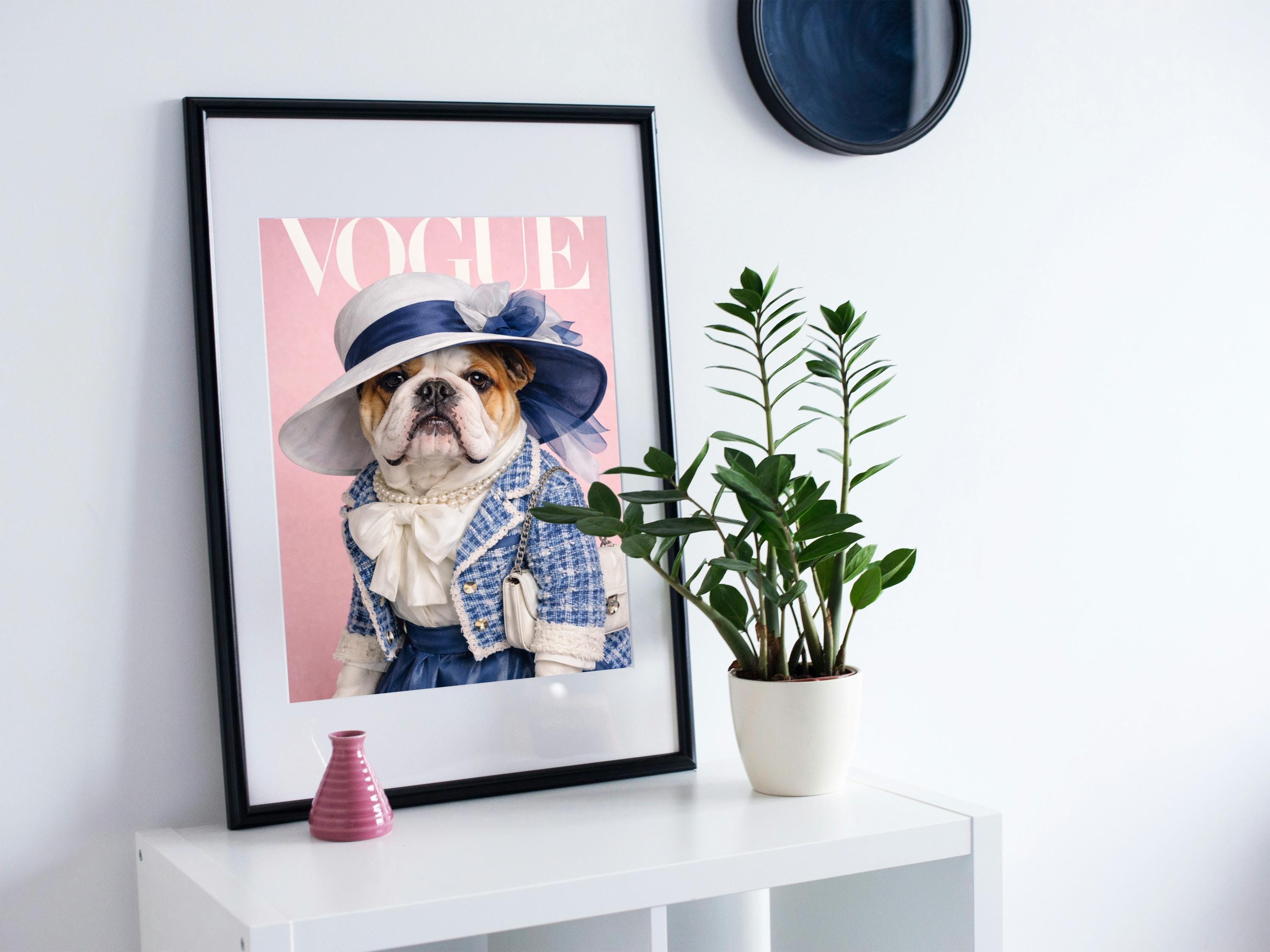 Turn your space into a high-fashion moment with this Vogue-inspired bulldog wall ar t. Dressed in elegant blue and white with a statement hat and pearls, this fashionable pup brings Parisian style, vintage style art flair, and luxury magazine vibes into your home as trendy wall art.