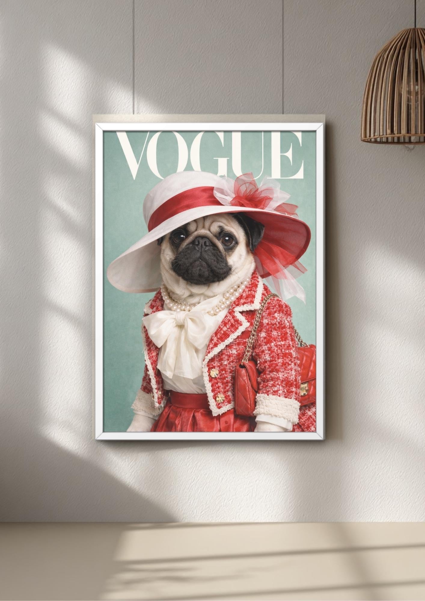 Vogue inspired fashion dog print featuring a stylish pug dressed in red and white couture, posed like a luxury magazine cover model. This high-resolution funny pug wall art and quirky dog art feels like a chic vogue art work or magazine cover print, making it perfect fashion wall print decor for fashion lovers and pet enthusiasts alike.