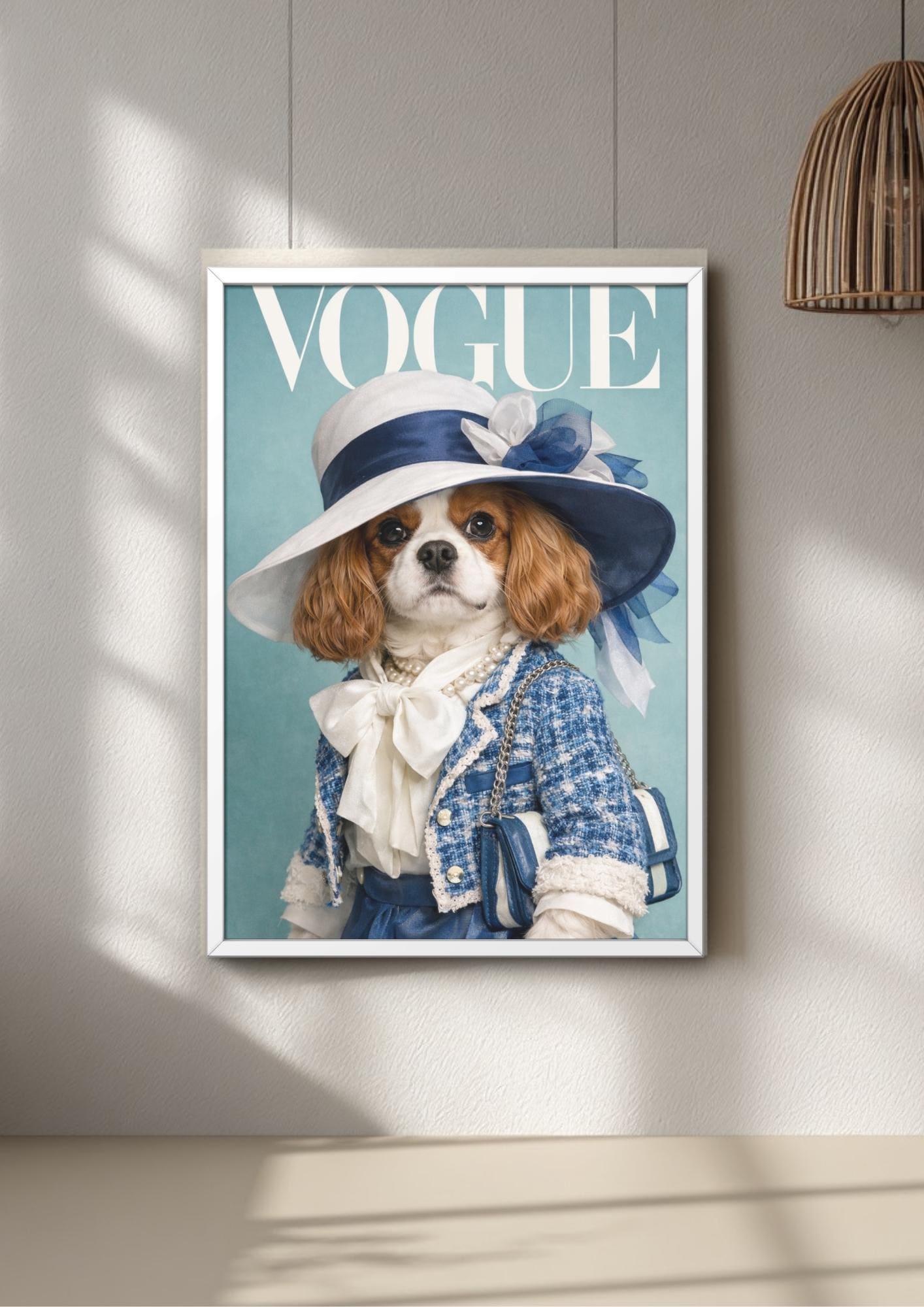 Vogue dog wall art print featuring a fashionable Cavalier King Charles Spaniel in blue and white, styled like a luxury magazine cover decor. This chic dog poster is a stylish dog print that feels like a real vogue printable, showcasing a designer dog art vibe with a stylish pup wearing a statement hat, pearls and a designer-inspired outfit against a soft teal background that works perfectly as teal wall prints.
