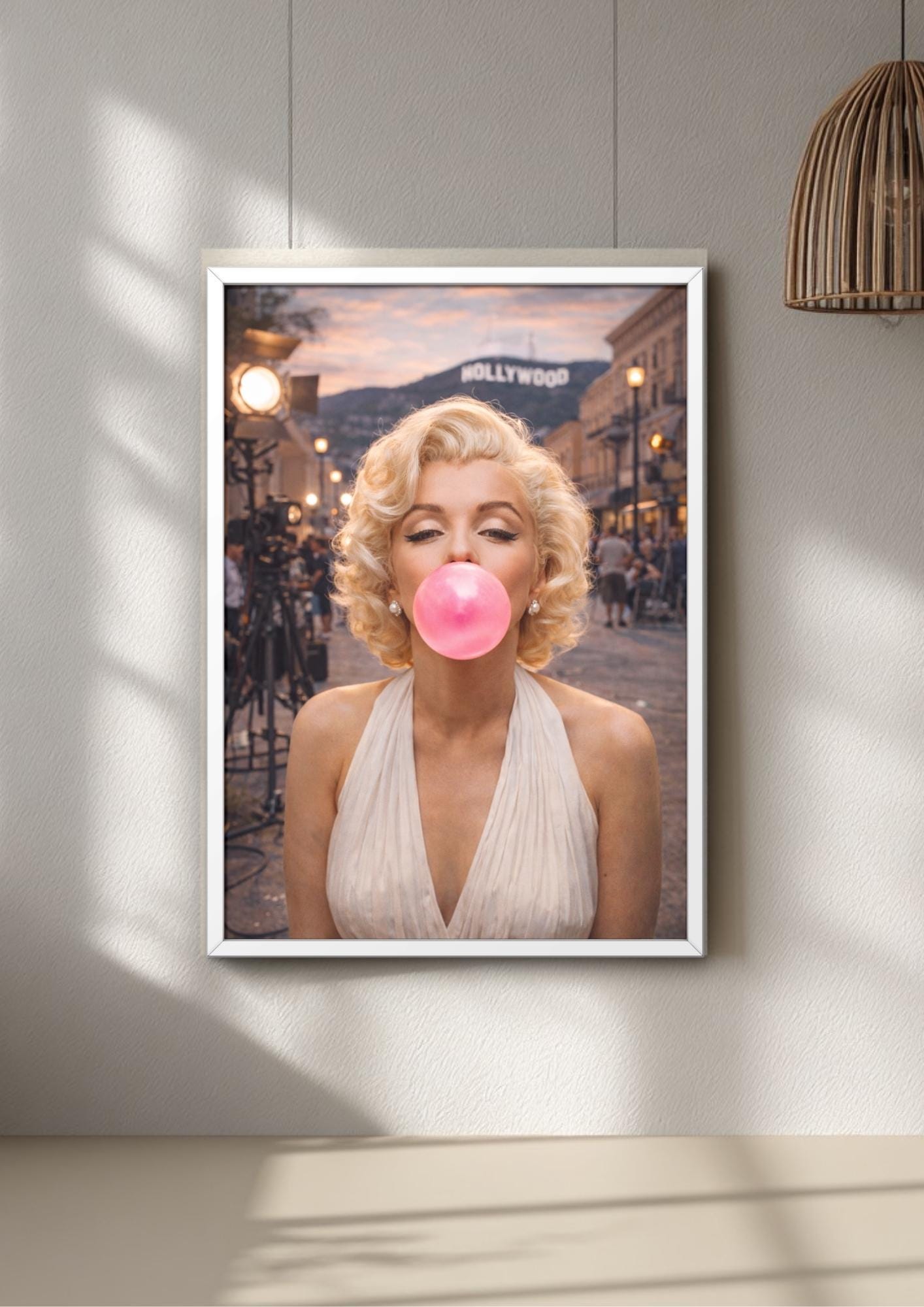 You get a dreamy portrait of an iconic movie star lookalike, styled like Marilyn Monroe and blowing bubblegum pink gum in front of a cinematic backdrop. It feels like hollywood art straight from a vintage soundstage, reimagined for modern vintage glam decor.