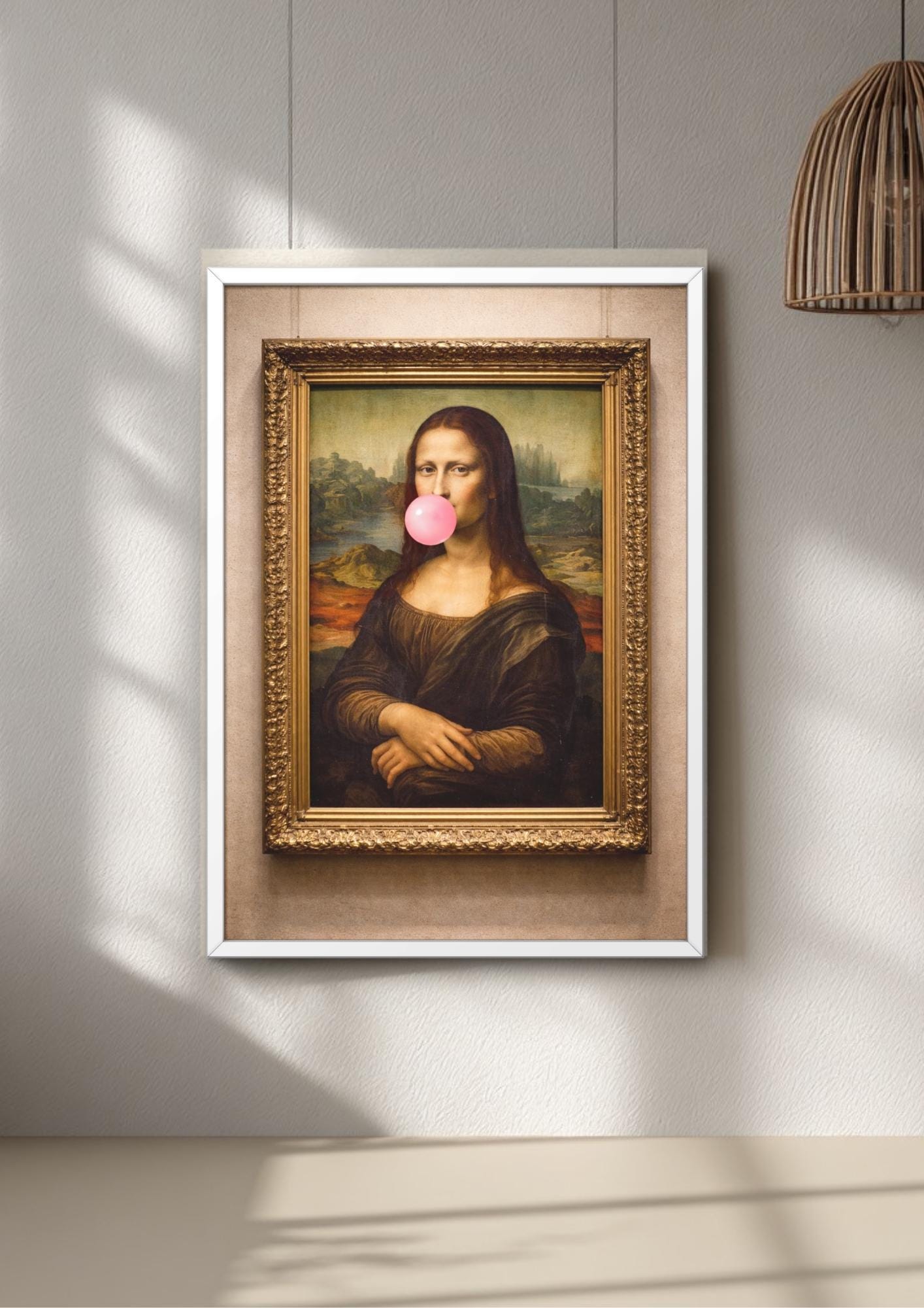 Meet your new favorite conversation starter: a Mona Lisa Bubblegum wall art print that turns a timeless classic into playful classical meme art. This meme style poster reimagines the famous portrait as a funny mona lisa blowing bright pink gum, giving you a perfect mix of high art and low-key humor.