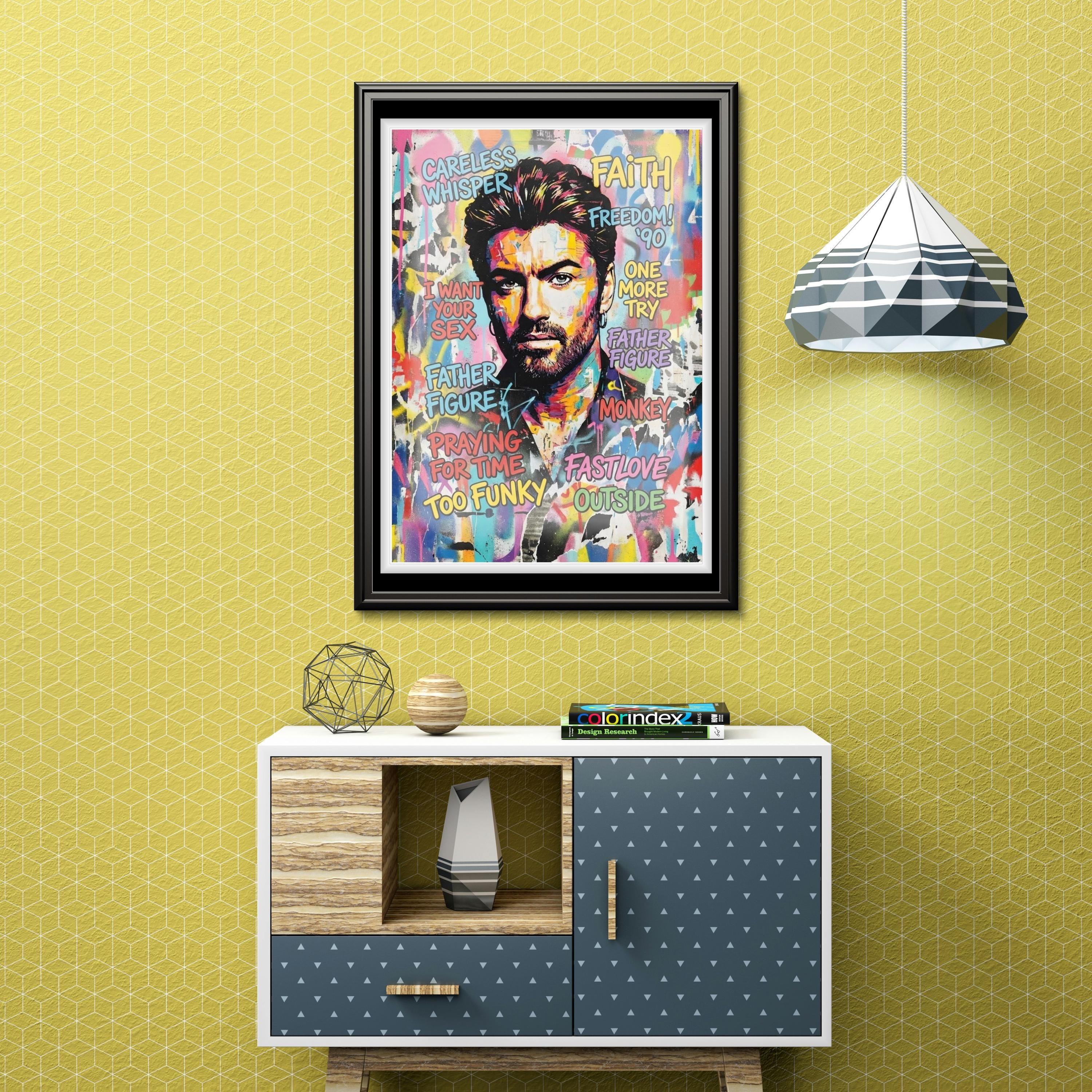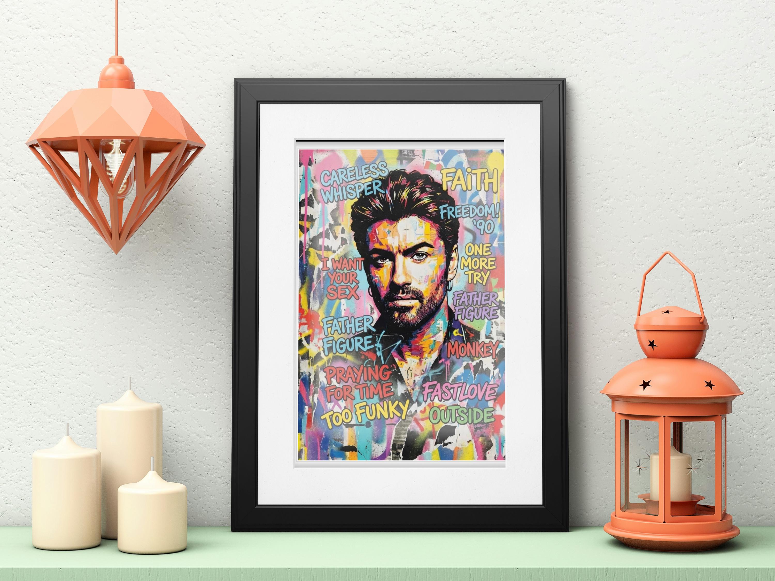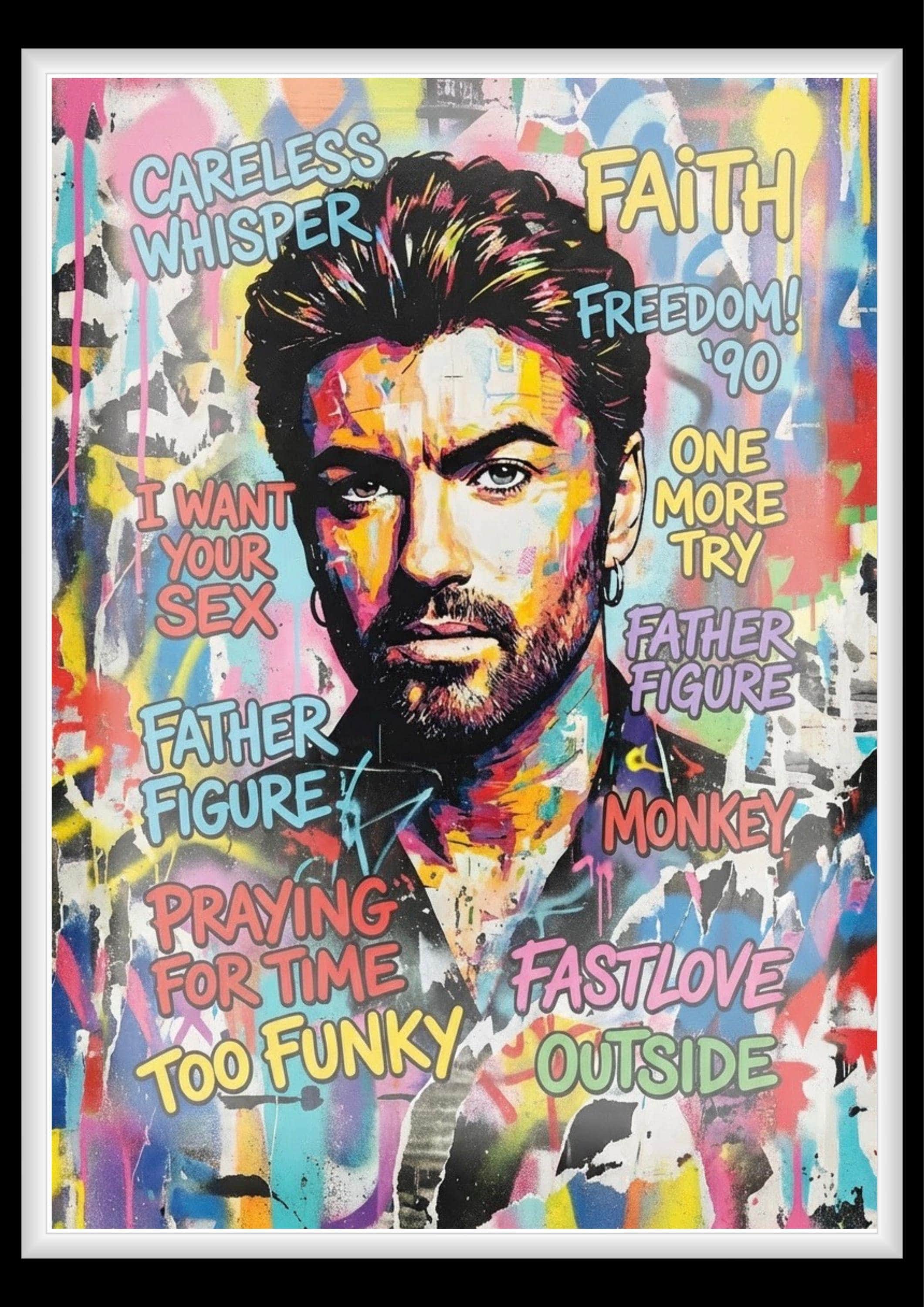 A vibrant tribute to George Michael — an artist who defined generations through sound, style, and fearless self-expression. This artwork captures his iconic presence through bold colour, layered texture, and graffiti-inspired energy, celebrating a catalogue of songs that shaped pop music history.