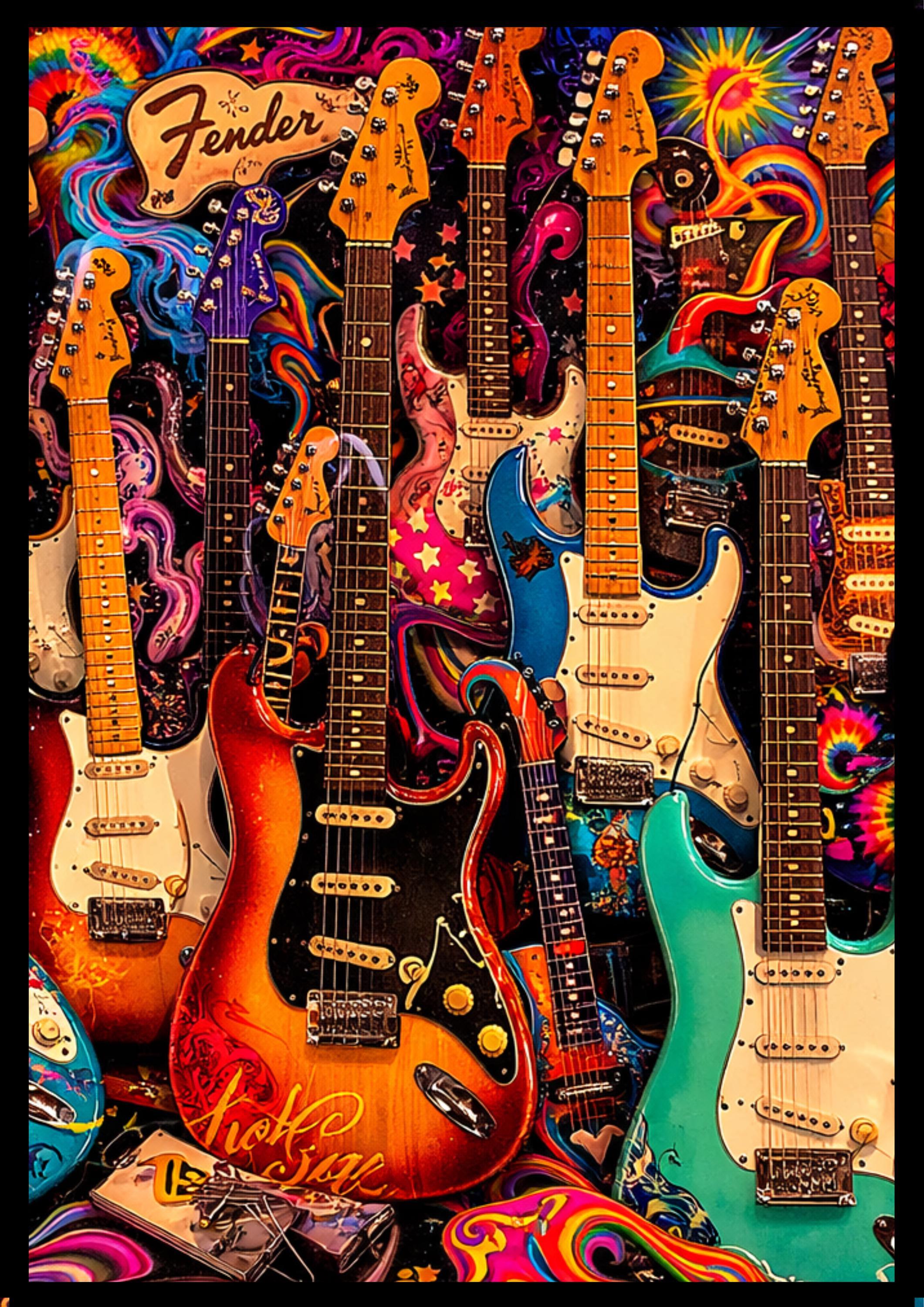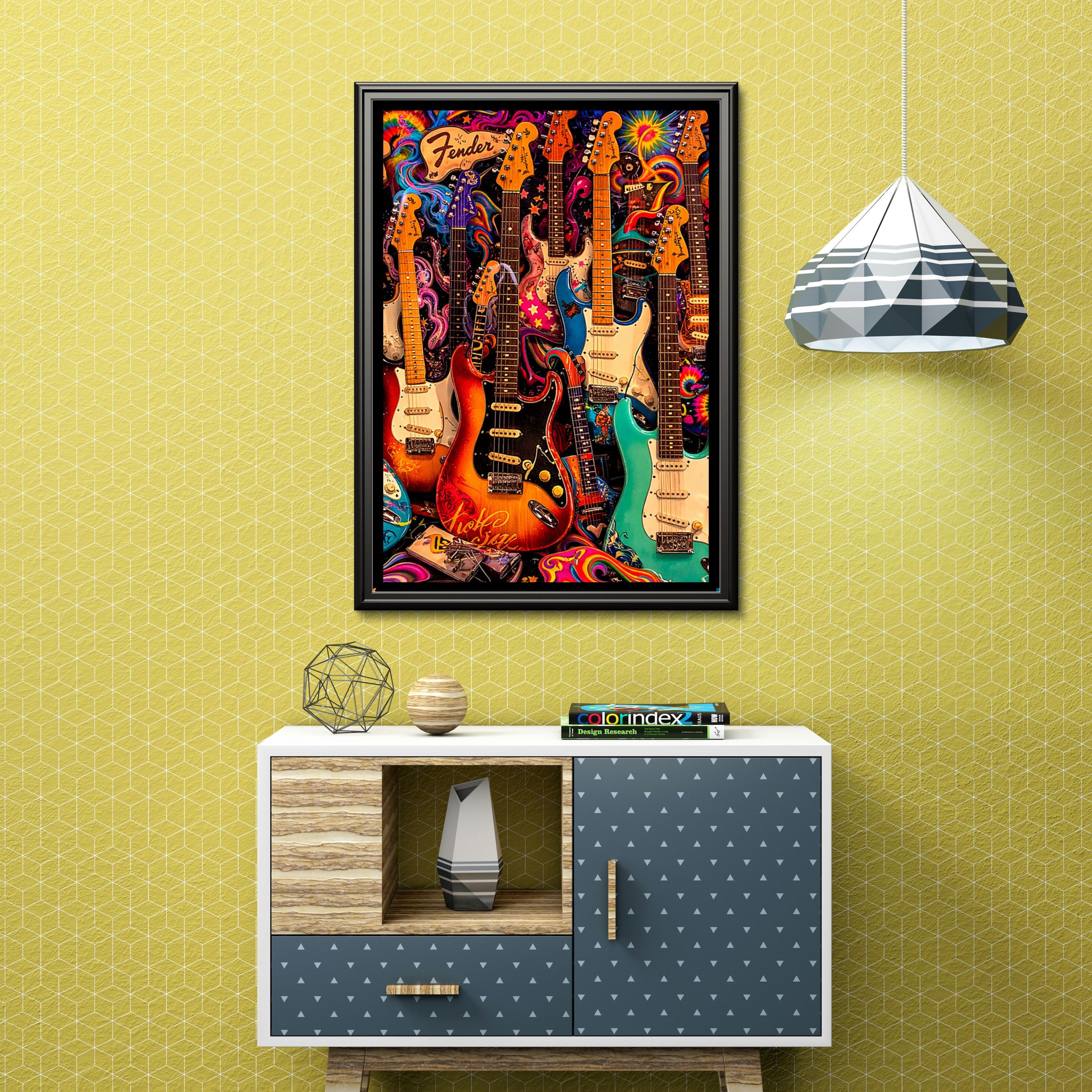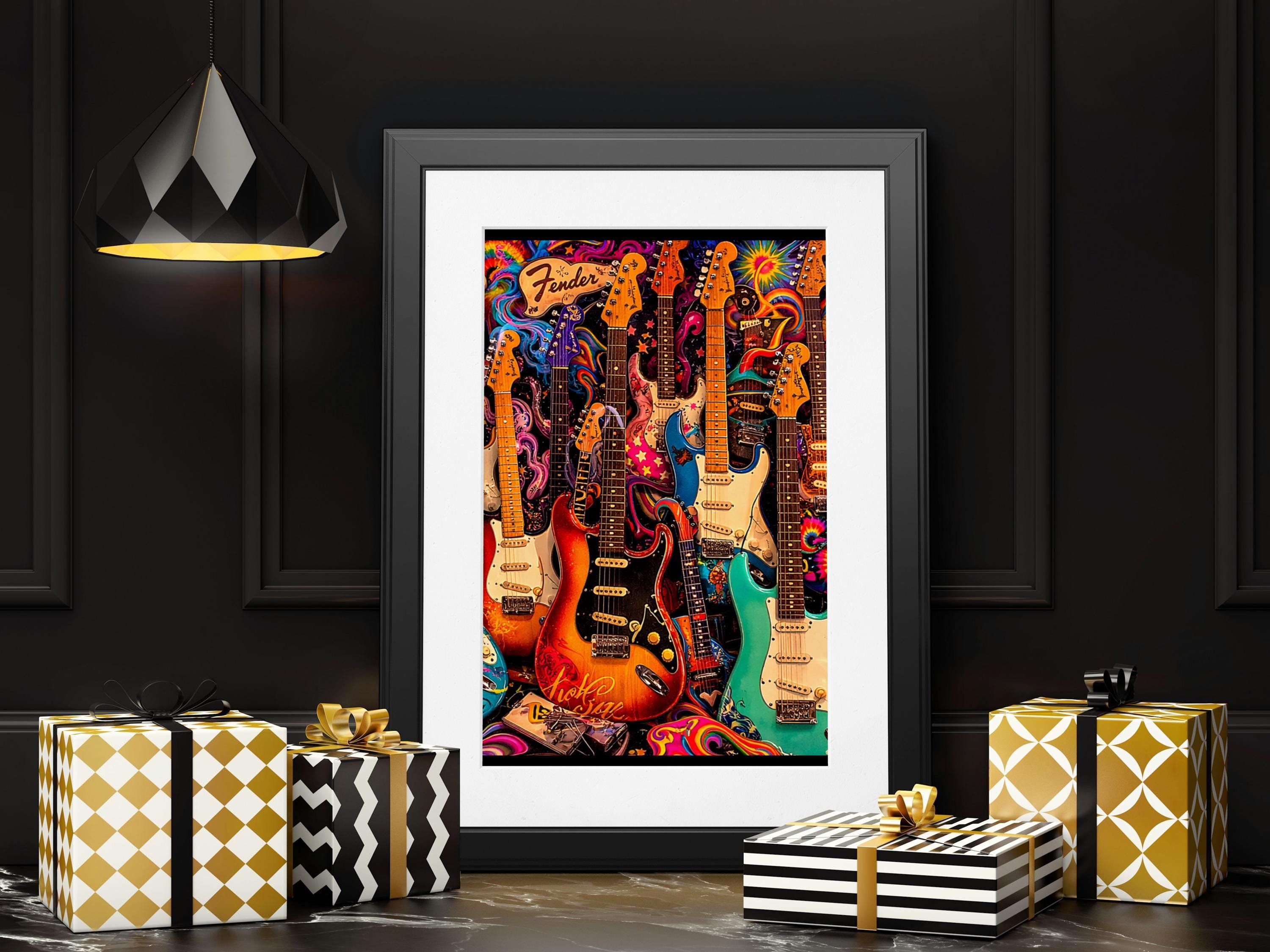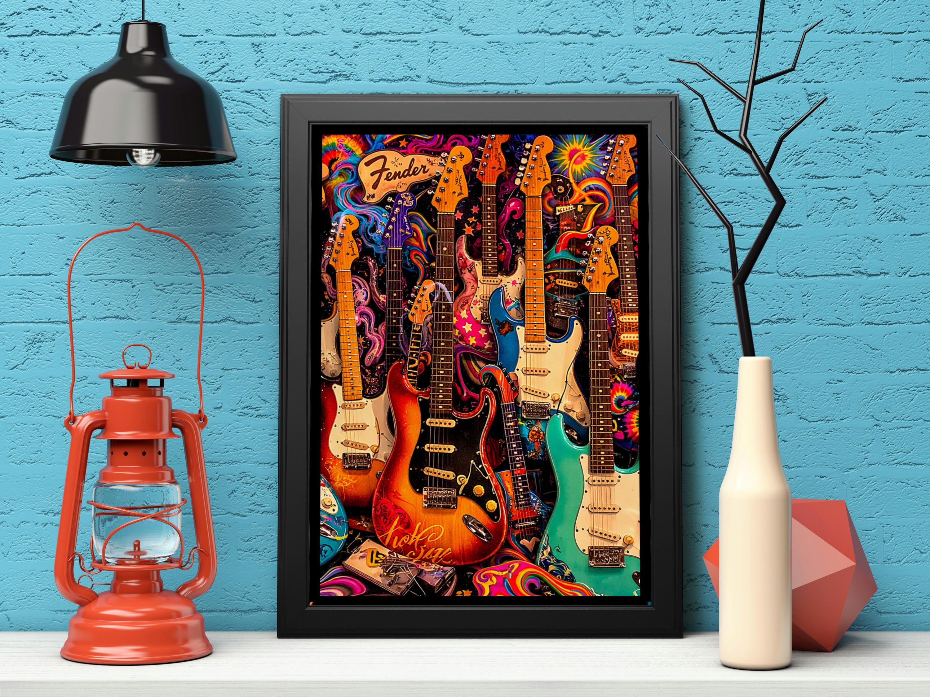 Add bold rock energy to your space with this psychedelic fender stratocaster guitar wall decor print. This vibrant electric guitar poster is a colorful guitar art design that features a colourful collection of iconic guitars surrounded by swirling psychedelic patterns inspired by classic rock and roll art culture, making it stand out as rock music wall art and a striking fender guitar print.