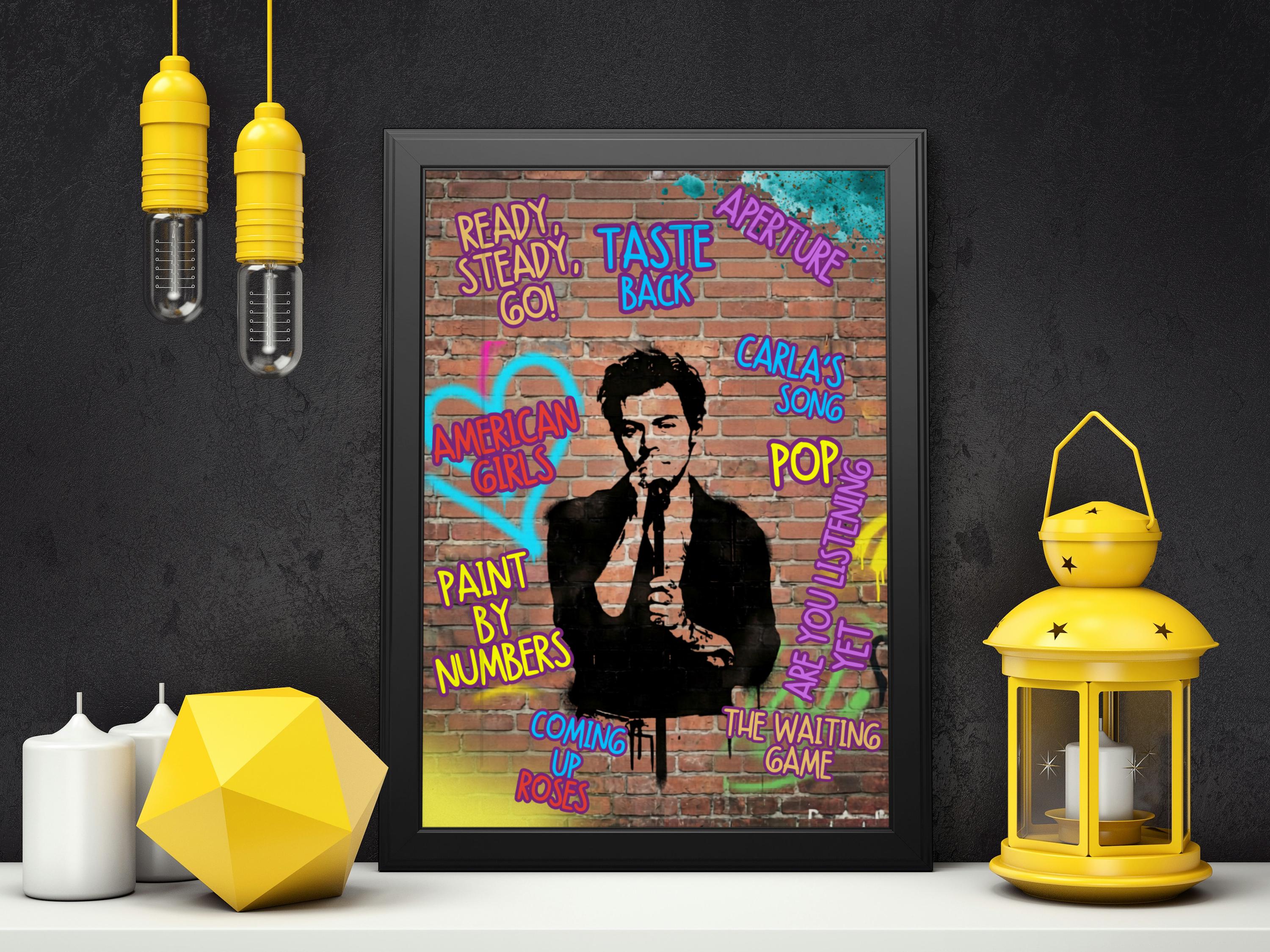 Turn your space into a bold tribute to Harry Styles with this striking silhouette pop art poster, featuring a graffiti-style album tracklist design. Combining vibrant street art elements with a clean, modern silhouette, this piece captures the essence of contemporary pop culture and music-inspired decor.