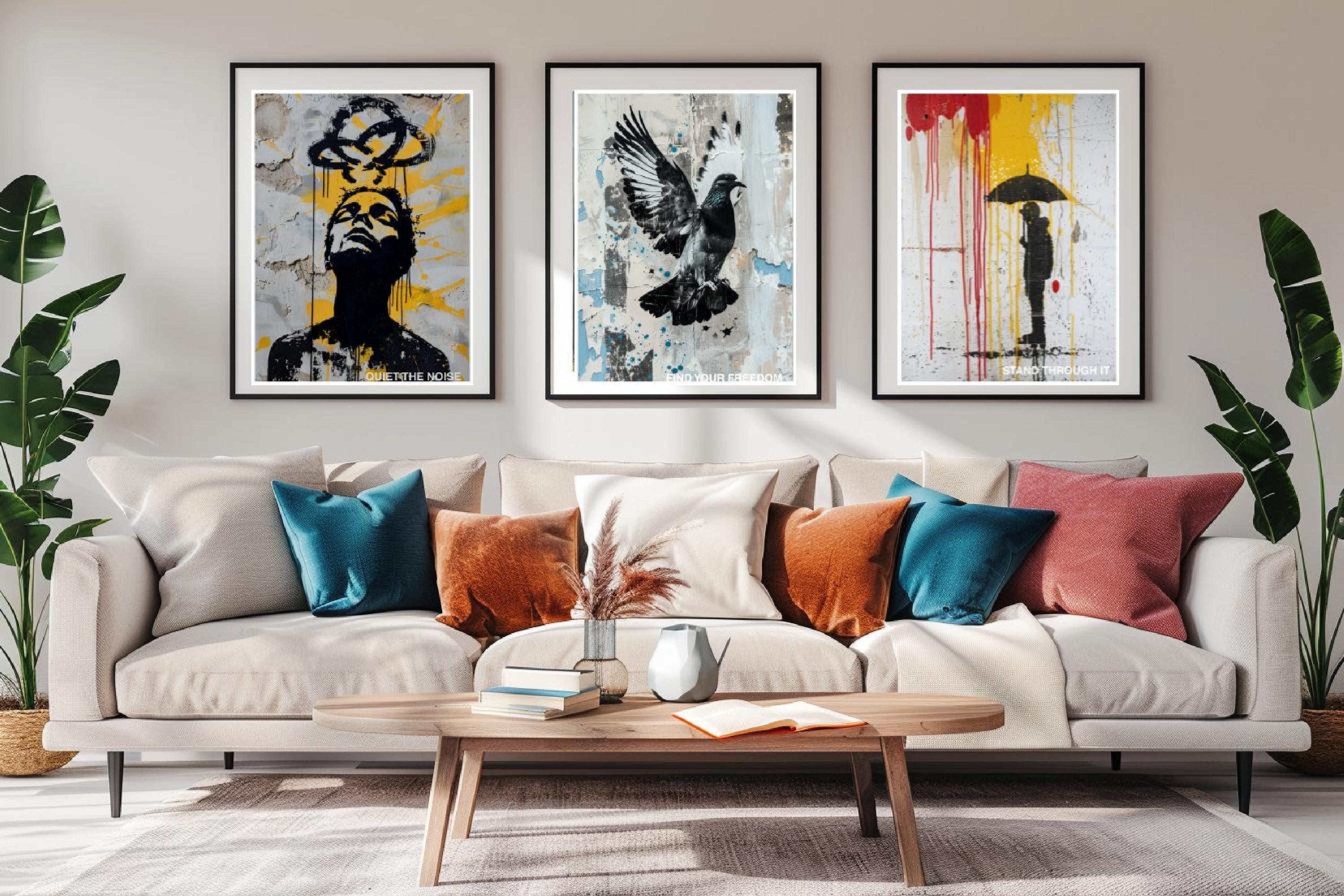 Part of a curated collection of graffiti-inspired prints, this banksy wall art style piece is designed to work together as a set of 3 or 6 for maximum visual impact in your modern wall art display.