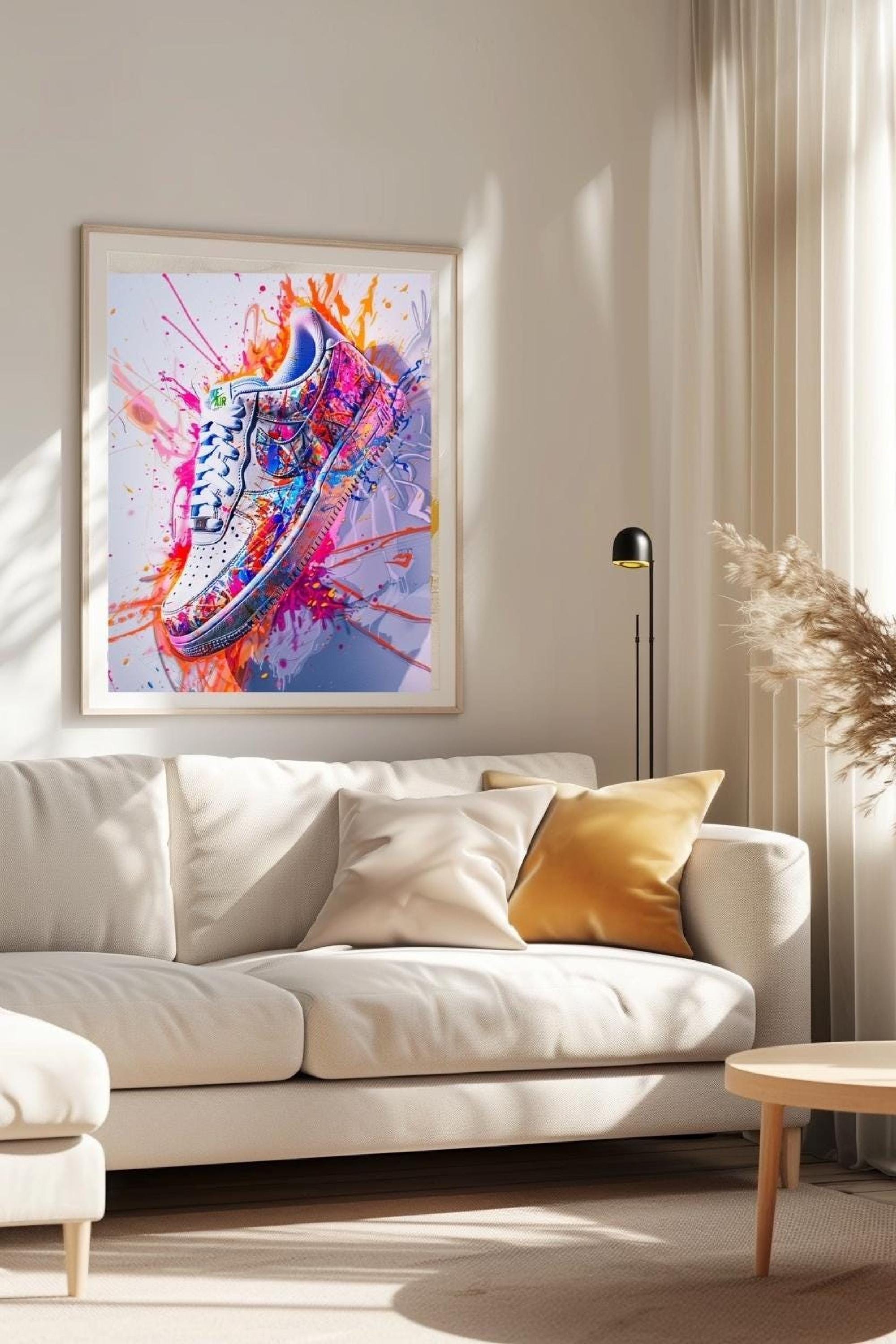 Turn your space into a bold statement with this vibrant neon graffiti sneaker wall art print. Featuring a dynamic explosion of colour, paint splashes, and graffiti wall art textures, this street art poster blends modern streetwear art culture with contemporary modern wall art design. It feels like nike style art translated into a bold sneaker poster you can hang.