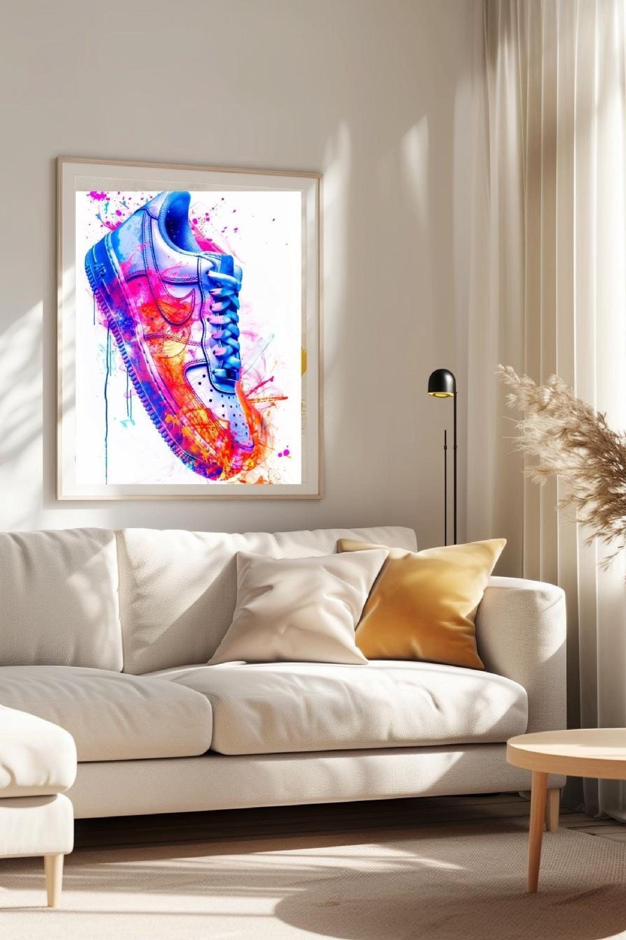 This striking sneaker artwork blends smooth colour gradients with bold graffiti splashes, creating modern wall art that doubles as sneaker wall art and graffiti wall art for your home.
