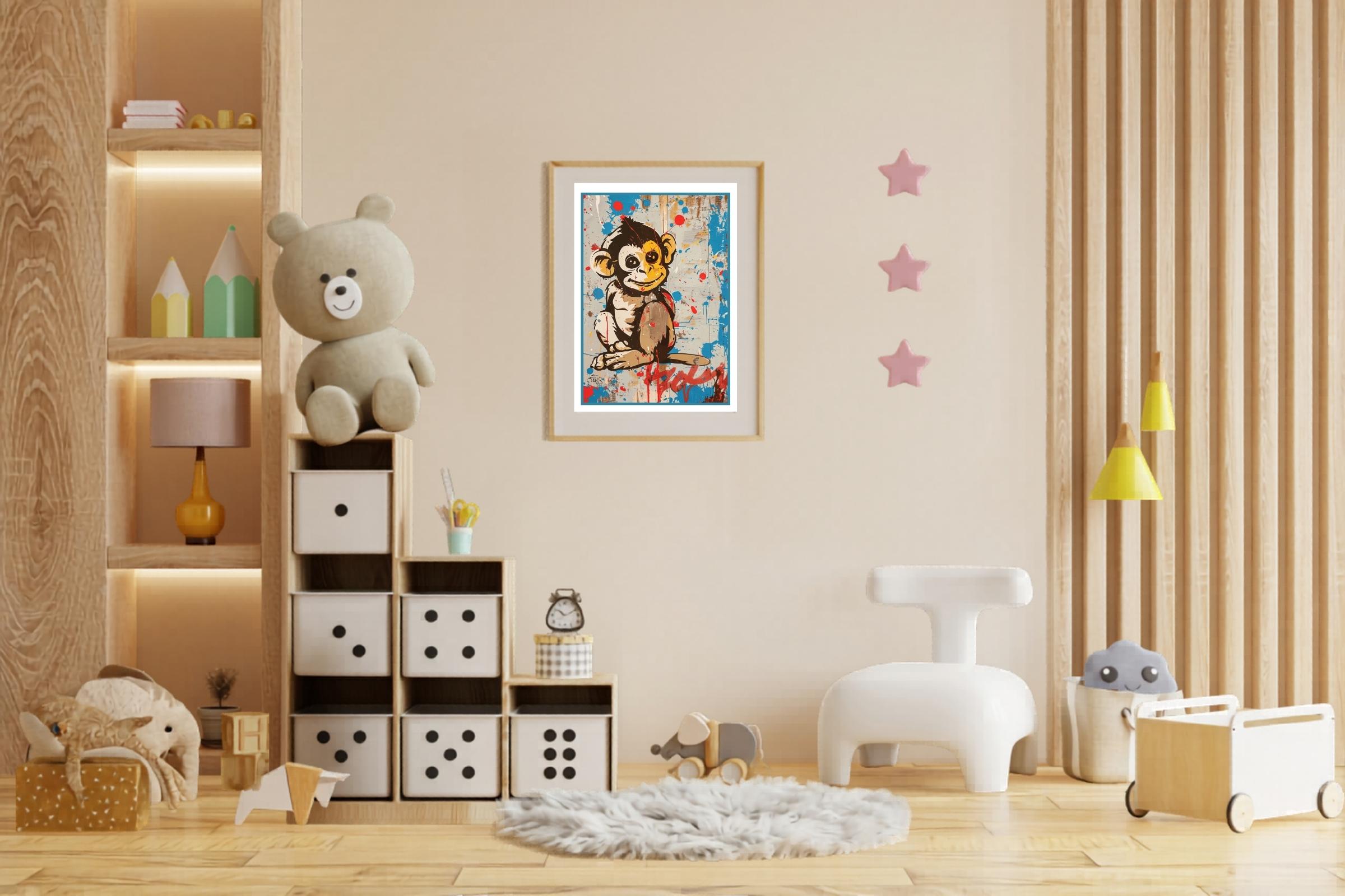 Add a fun and cheeky vibe to your child’s room with this graffiti style monkey wall decor print. Designed with playful colours and soft paint splashes, this kids animal art brings joy and creativity into any space and works as both fun kids art and cute nursery art.