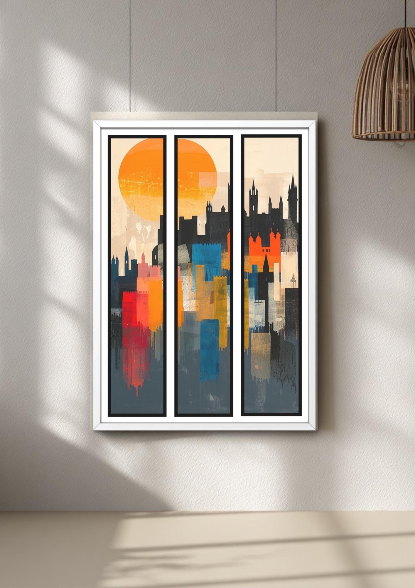 This abstract city art design is part of a coordinated Edinburgh collection of 3 prints, created to work together as a cohesive, modern Scotland art series. Display them as a trio for a bold wall art statement, or mix and match within an existing gallery wall set for layered, artistic wall decor.