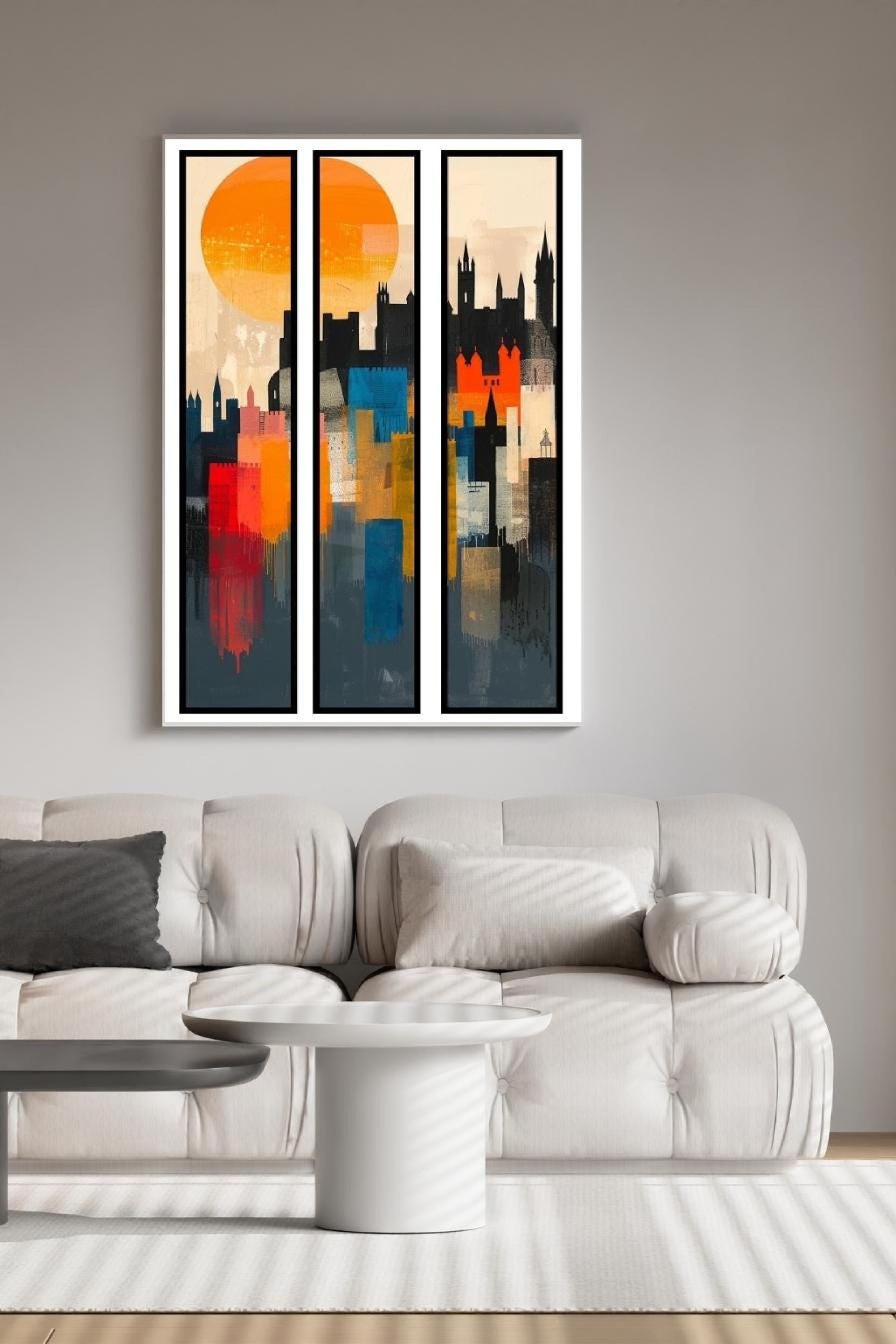 Clean geometric shapes and rich color blocking create geometric wall decor that feels both playful and refined. The design turns the skyline into a minimalist cityscape, perfect if you love modern Scotland art with a striking twist.