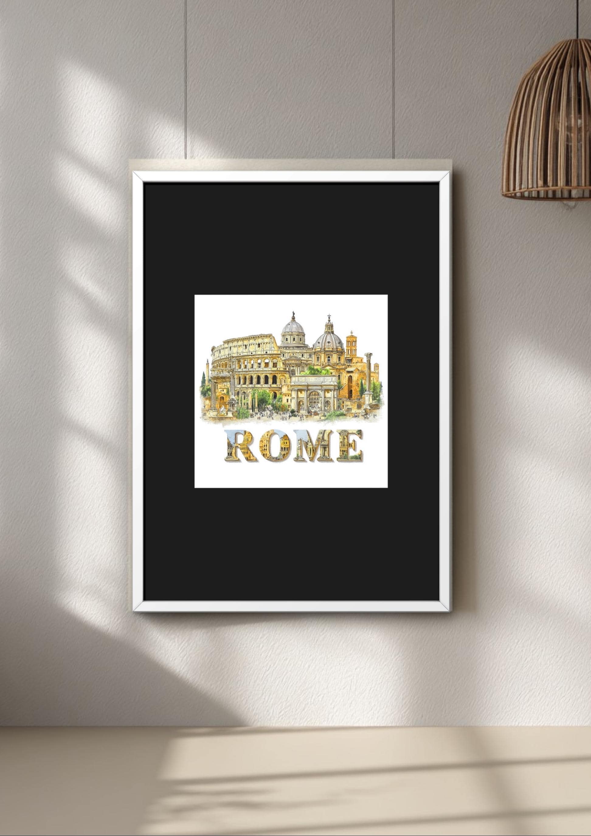 You get a clean, modern print of the city skyline, featuring iconic silhouettes that capture the spirit of classic rome art in a fresh way. It works beautifully as rome decor on its own or as part of a larger gallery wall with other italy artwork from your art travel adventures.