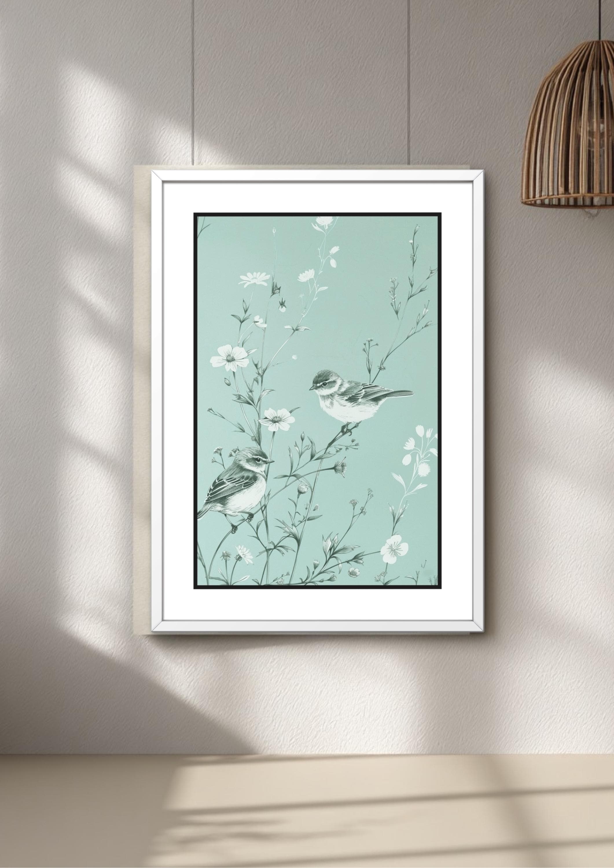 This floral art features a warm teal art and blue-green print backdrop, with a simple teal design that feels both uplifting and soothing. Fine black linework forms an elegant flower print and bird print, giving you minimalist art that still feels full of life and personality.