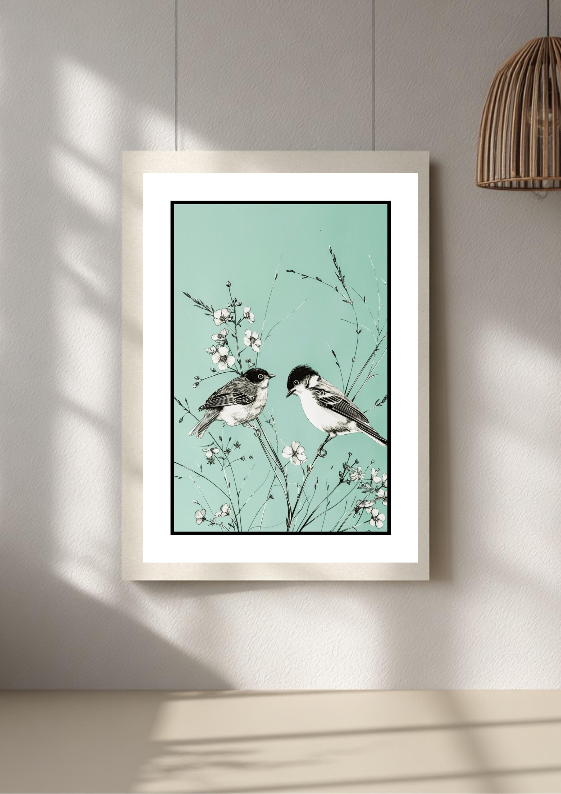 This floral art features a warm teal art and blue-green print backdrop, with a simple teal design that feels both uplifting and soothing. Fine black linework forms an elegant flower print and bird print, giving you minimalist art that still feels full of life and personality.